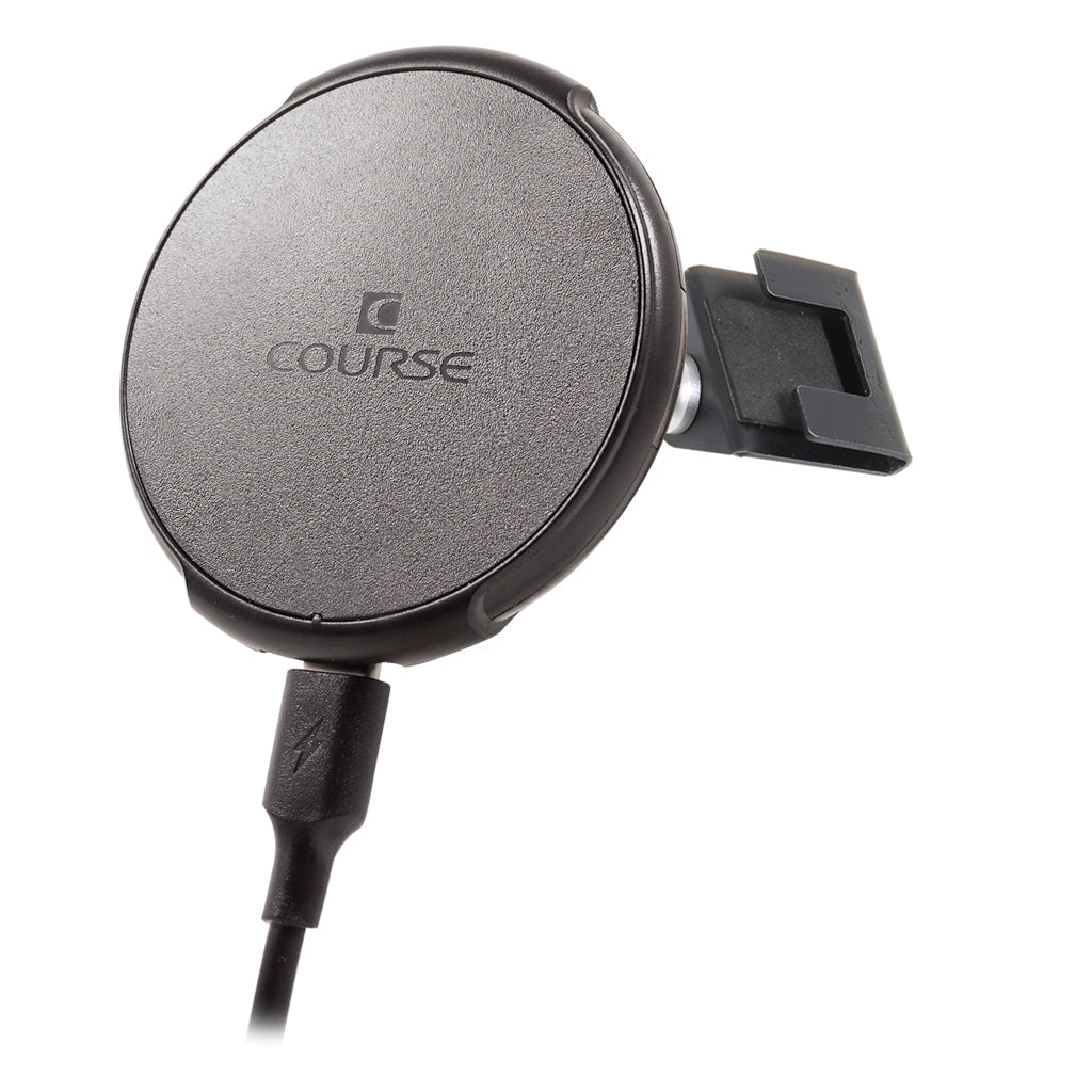 Available with a non-charging magnetic head option as shown in the photos and installation video, the optional Course Motorsports Automatic Gripping Wireless Induction Charger Mount or Course Motorsports Magnetic Induction Charger - MagSafe Compatible.