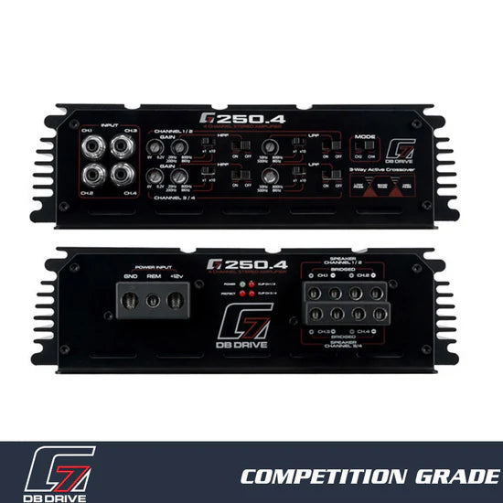 Introducing the G7 250.4 Class AB 4 Channel Amplifier – the ultimate powerhouse for your audio setup! Engineered with ATC Audiophile Grade Tiffany RCA Connectors and ACT Adaptive Crossover Technology, this amplifier promises exceptional sound quality and versatility. With its high efficiency Class D Technology and direct connect speaker terminals, you'll experience seamless audio performance like never before. The large terminals inputs and variable 12dB 3-Way Active Crossover ensure you have all the control you need. Plus, features like the SESI Signal Evaluation Status Indicator and the CHM Collective Heat Management system guarantee optimal functionality and longevity. Boasting an impressive frequency response of 10Hz to 25KHz and a robust internal 4 Channel Class D circuitry, this amplifier delivers a staggering 4 x 500 watts at 2Ω and can be bridged to 2 x 1000 watts at 4Ω. Its superior signal-to-noise ratio of <88dB and working voltage range of 9-16 volts ensure pristine audio clarity. Elevate your audio experience to new heights with the G7 250.4 – where power meets precision!