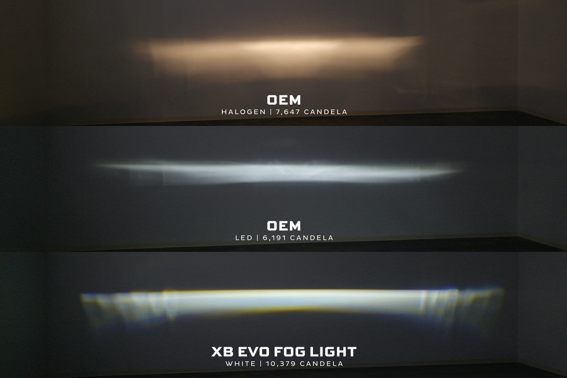 XB, Evo, and Evo+: While the standard XB LED fog is a massive upgrade over stock halogen fog lights, the new XB Evo models take performance to the next level. Their recipe delivers more of everything one would ask for in a good fog light and is available in two distinct versions: a dedicated, white-output model, and the XB Evo+ which can be switched on-the-fly between white and yellow. Unique to the XB Evo+ fog lights is the zero-compromise distribution of light within the beam regardless of which output color is selected... which cannot be said for other switchable fog lights on the market.