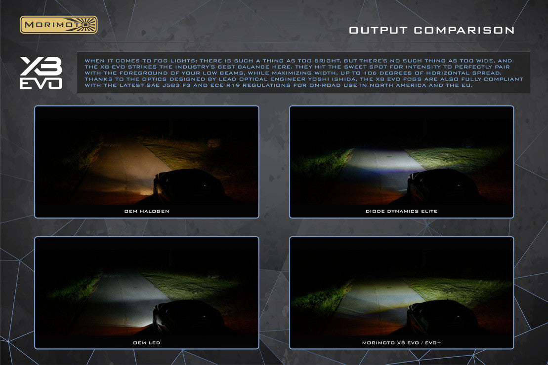 Maximum Performance: Thanks to a staggered array of Osram Oslon-PL LED chips paired with an advanced optic, all designed in house by Morimoto's lead optical engineer Yoshi Ishida, the XB Evo fog lights will meet & exceed the highest expectations in the performance department. They offer the industry's best combination of beam width and intensity, and are fully compliant with the latest SAE J583 F3 and ECE R19 regulations for on-road use in North America and EU.