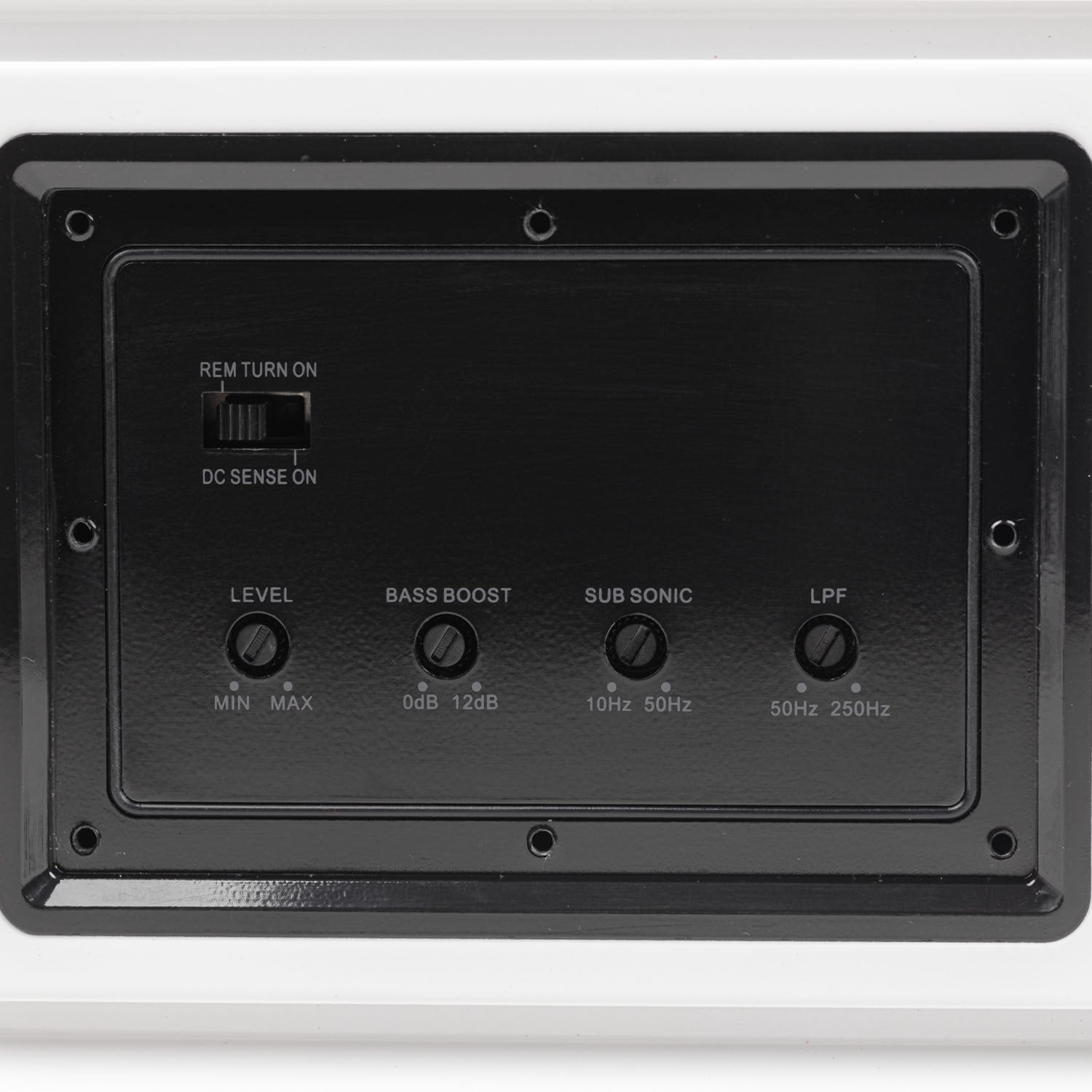 Mono block Nautic waterproof amplifier with marine specific connectors. Top mounted sound contouring with onboard crossovers, bass boost and adjustable input sensitivity all concealed behind top mounted panel. Includes a bass remote.