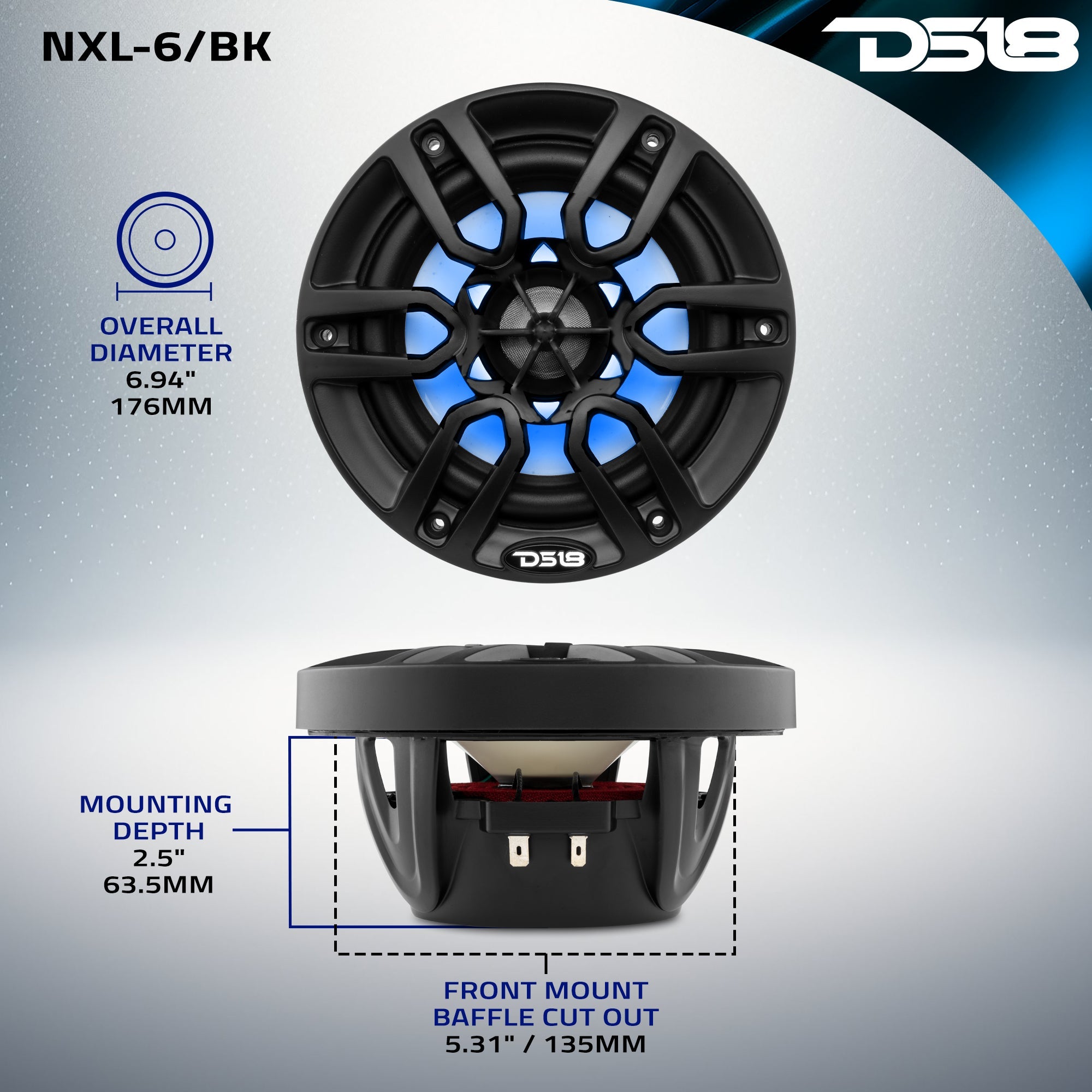 DS18 HYDRO NXL-6/BK 6.5" 2-Way Marine Speakers with Integrated RGB LED Lights 300 Watts (Matte Black) (Pair)