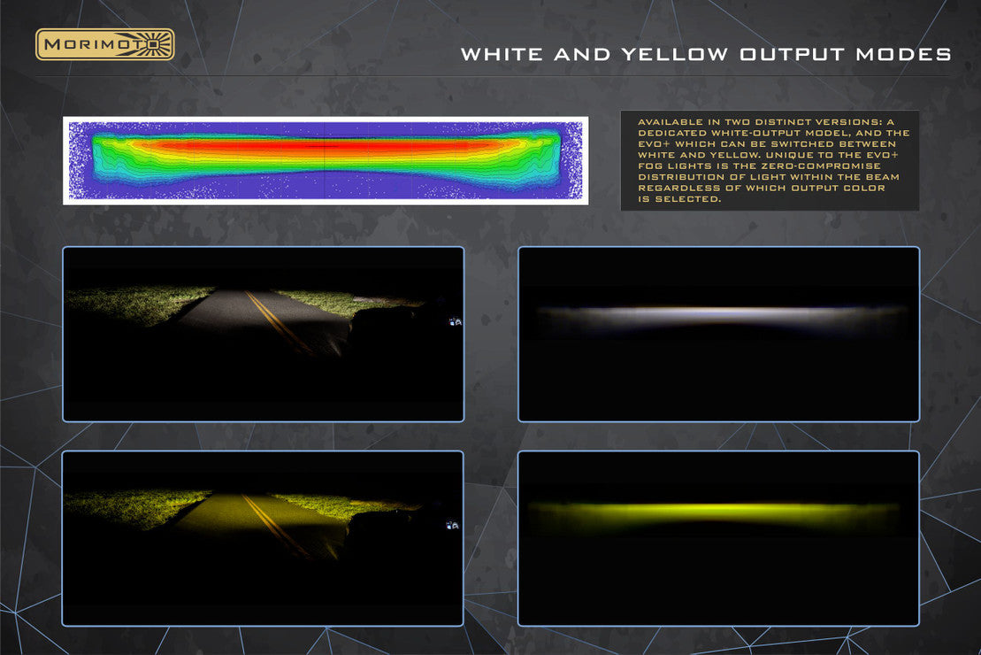 • XB Evo and XB Evo+: Available in two distinct versions: A dedicated, white-output model, and the XB Evo+ which can be switched on-the-fly between white and yellow. Unique to the XB Evo+ fog lights is the zero-compromise distribution of light within the beam regardless of which output color is selected.