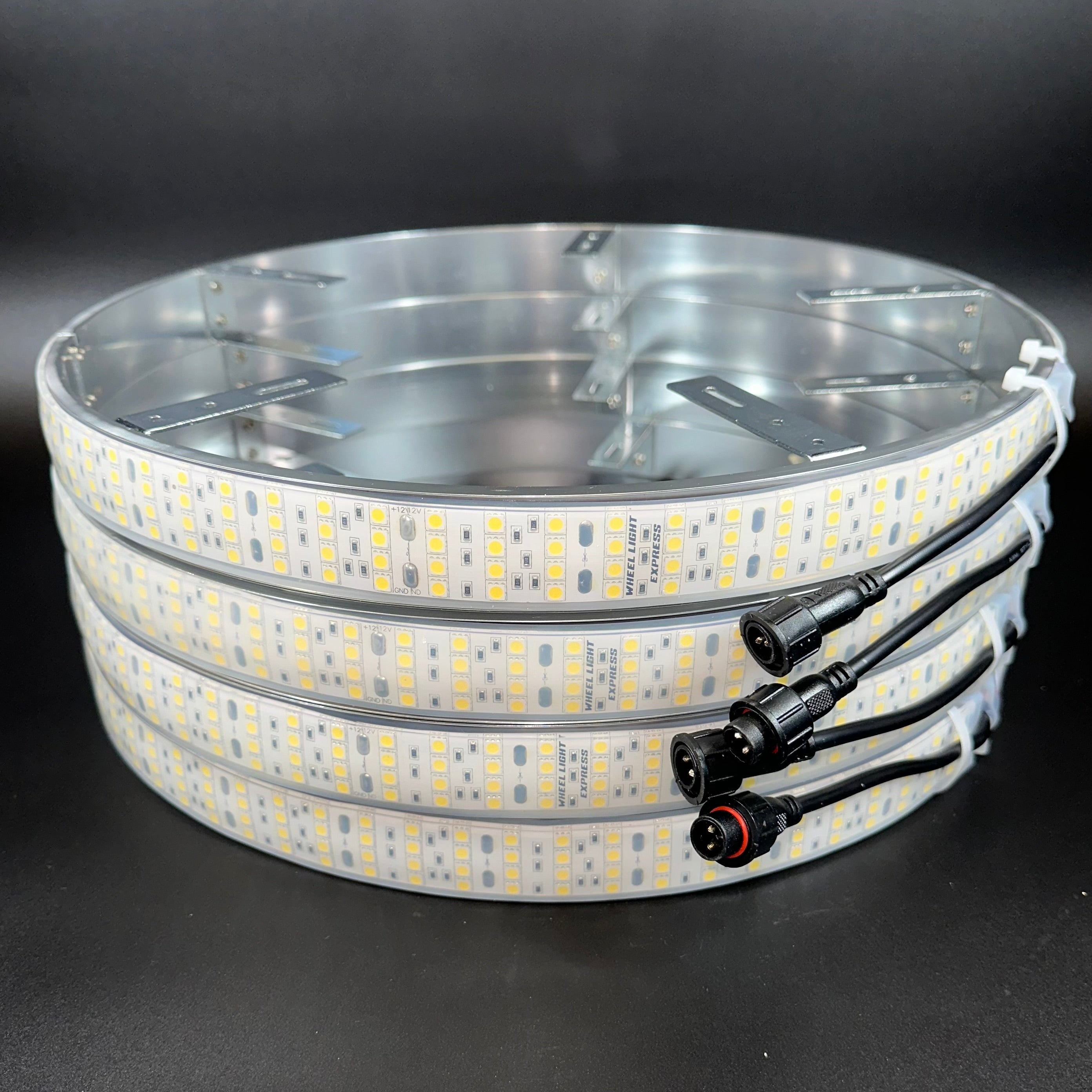 Quad Row White wheel lights is our signature wheel light kit, this kit comes with a fully plug and play harness that includes a switch, zip ties, self tapping screws, and of course the wheel lights! This kit will work with at least a 19 inch wheel or bigger, our LED Wheel Lights will work for trucks and cars. This kit is built for easy installation and long lasting durability making them the best way to light up the wheel on your truck or car! Sets are custom made by hand in the USA.
