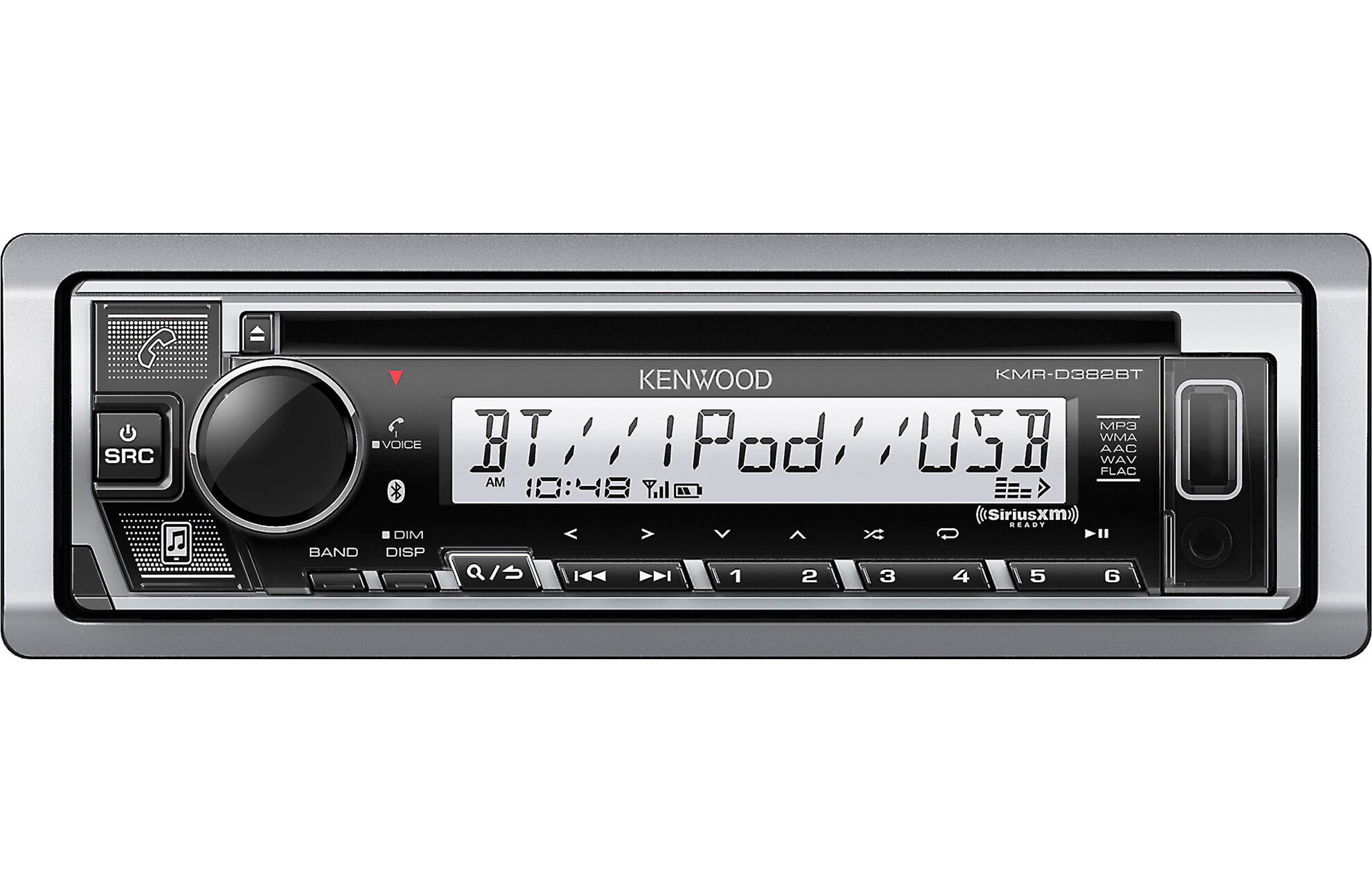 Kenwood's KMR-D382BT CD receiver offers up a lot of music options for your time on your boat. Enjoy streaming Internet music, Bluetooth® audio, high-res FLAC files, CDs, and radio. This receiver's highly visible display won't wash out, even on the brightest of days. And if you need more power to drive some marine speakers, a full set of ultra-clean 4-volt preamp outputs lets you add marine amps to the mix.