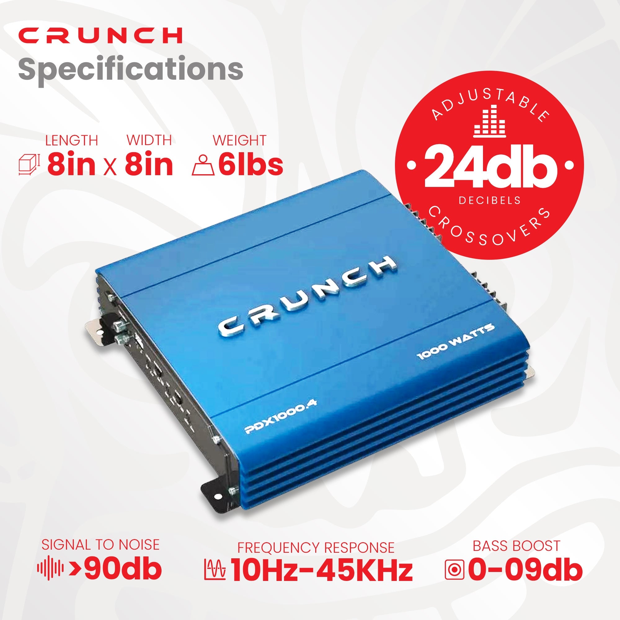 Unparalleled in quality, the Crunch 1000 Watt 4 Channel PowerDriveX Series is a low noise pre amplifier with low level RCA inputs and outputs. It features flexible installation, allowing the amp to run in 4 channel or bridged mono mode. With rugged MOSFET pulse width modulation power supply, fully adjustable crossovers, and bass boost, this amplifier will always deliver the quality you need.