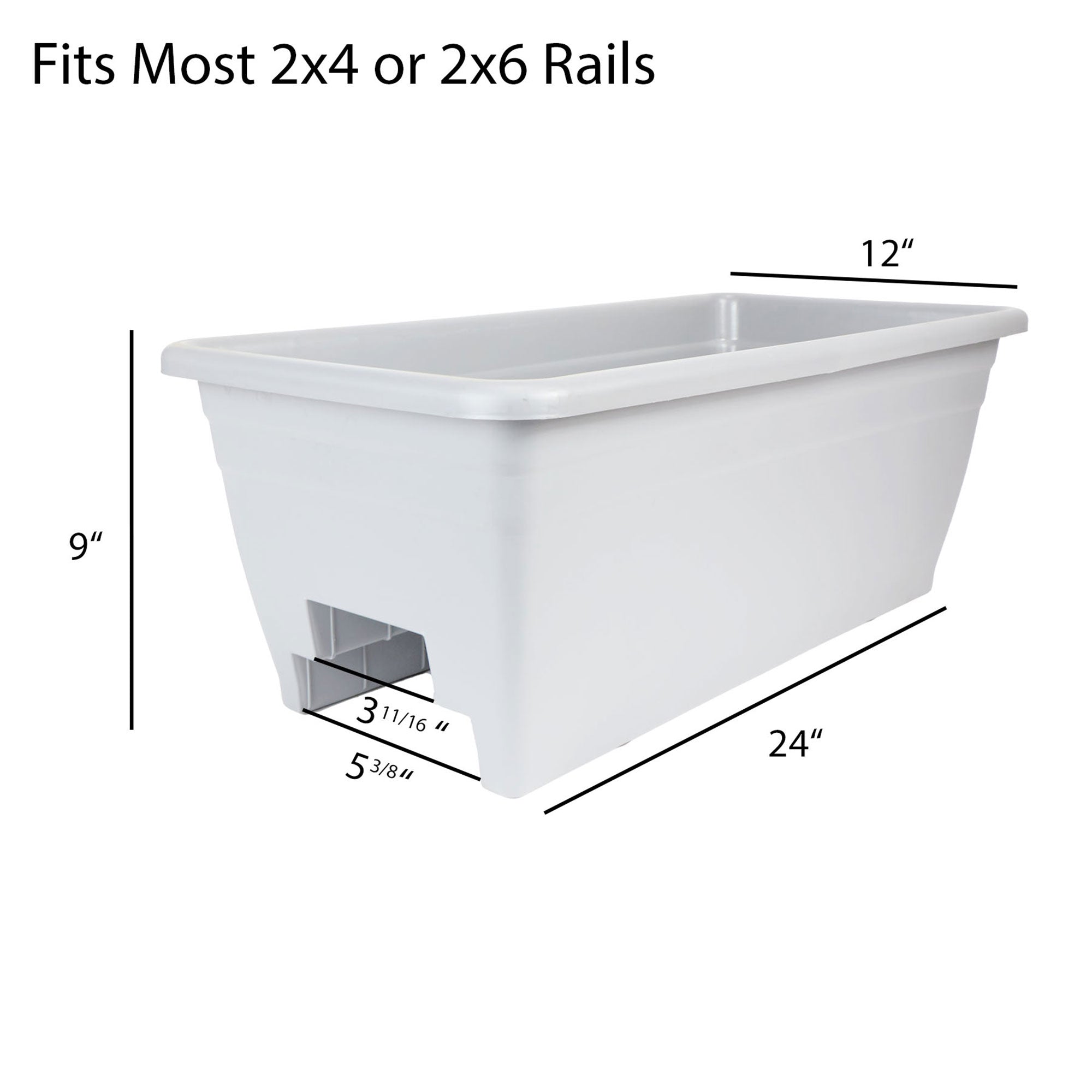 This big planter box for railing use features a thick durable-wall plastic construction, so you can rest assured it will hold up against the elements. The stylish design and color market his flower box perfect for any space. Enjoy planting live flowers or displaying decorative plants in this 24-inch rectangular planter box. With removable dual drain plugs, this railing basket offers maximum drainage and makes it easy to transfer outdoor plants to inside places. Enhance your indoor or outdoor setting and enjoy watching your garden thrive. Fits most 2-by-4-foot or 2-by-6-foot wide deck rails.