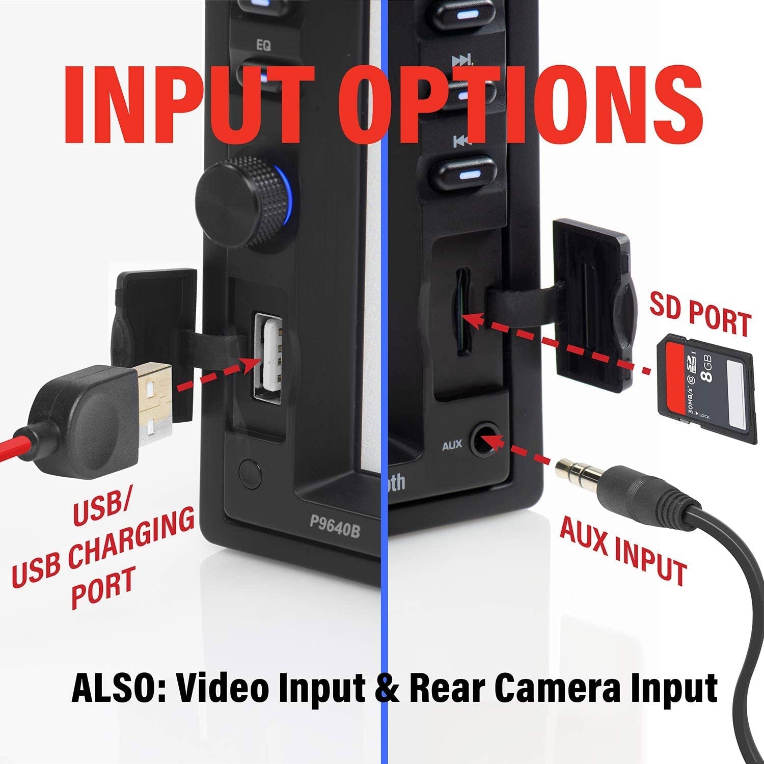 - USB, SD, Aux, rear camera, and steering wheel control input (camera and steering accessories sold separately)