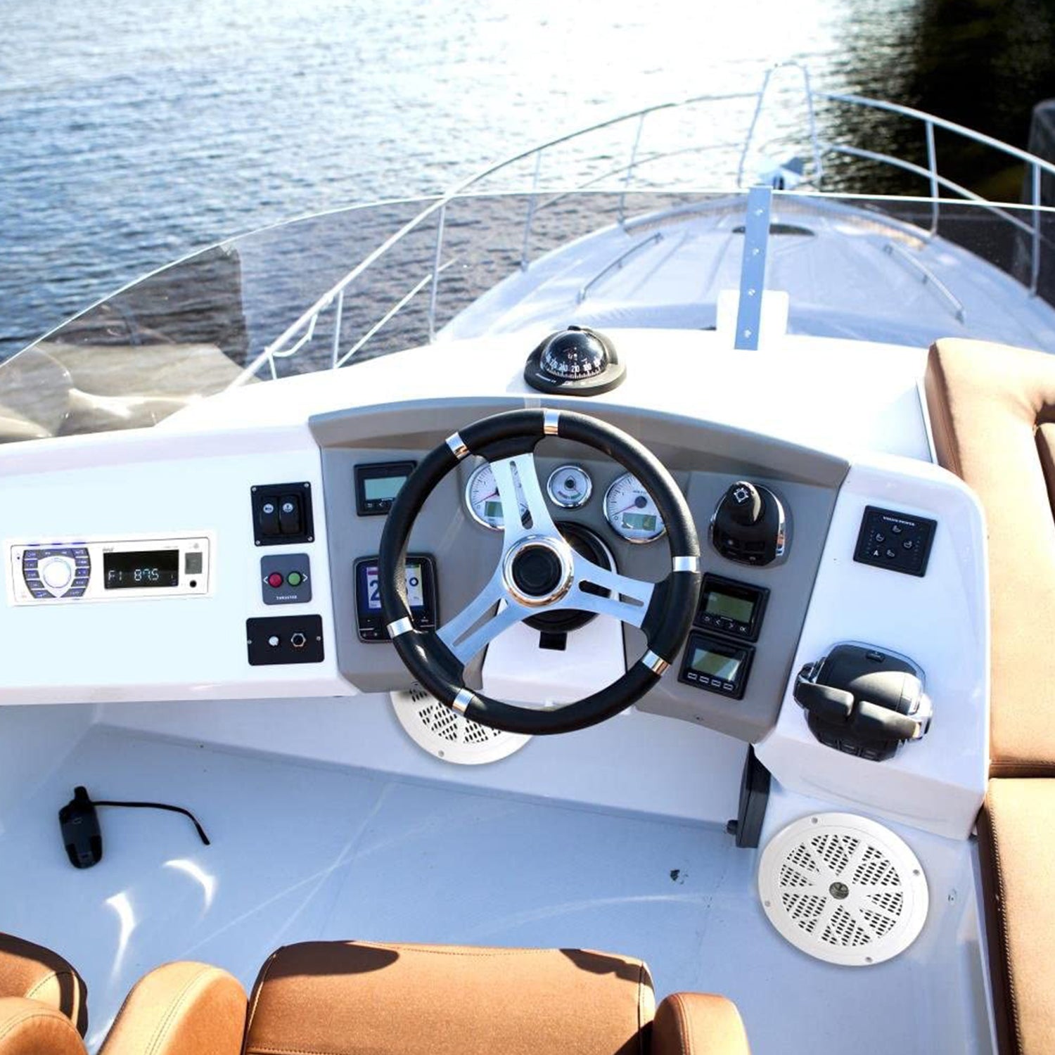 - Package comes with 2 kits and each kit includes Bluetooth marine receiver, (2) 5.25-inch marine grade speakers, speaker connection wire, power and wiring harness, metal chassis frame bracket, outer trim frame cover, and remote control