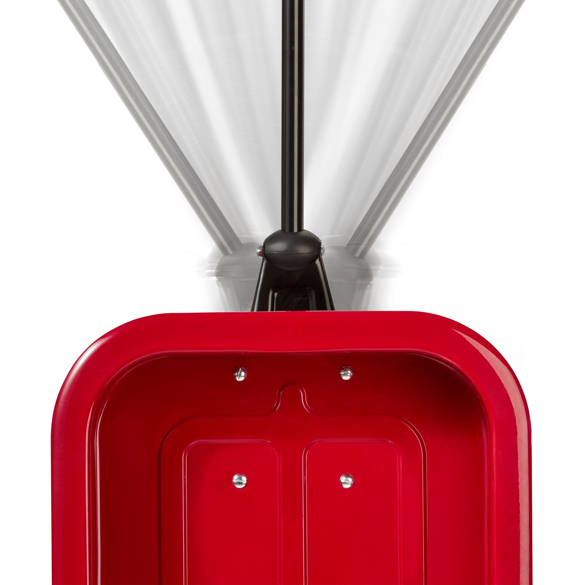 Moving around with the wagon has never been easier with its 10-inch steel wheels and rubber tires that can maneuver easily on any surface. This kids' wagon also features an extra-long foldable handle for convenient pulling and storage. Safety was a major priority when designing this wagon, and that's why this red carrier features a controlled turning radius that prevents tipping and maximizes control.