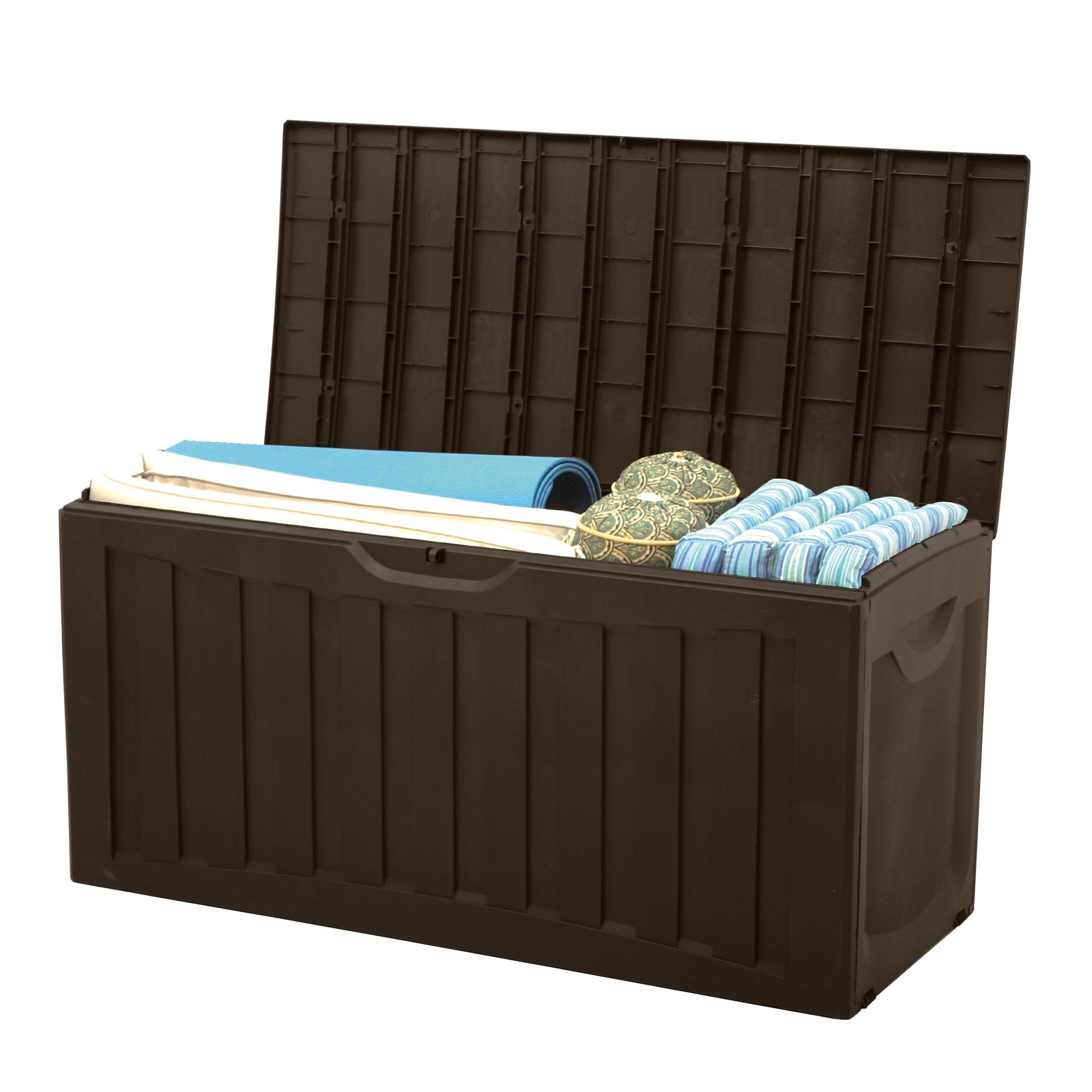 - Heavy duty container offers plenty of space for garden tools, patio cushion storage, toys, pool floats, and beach towels