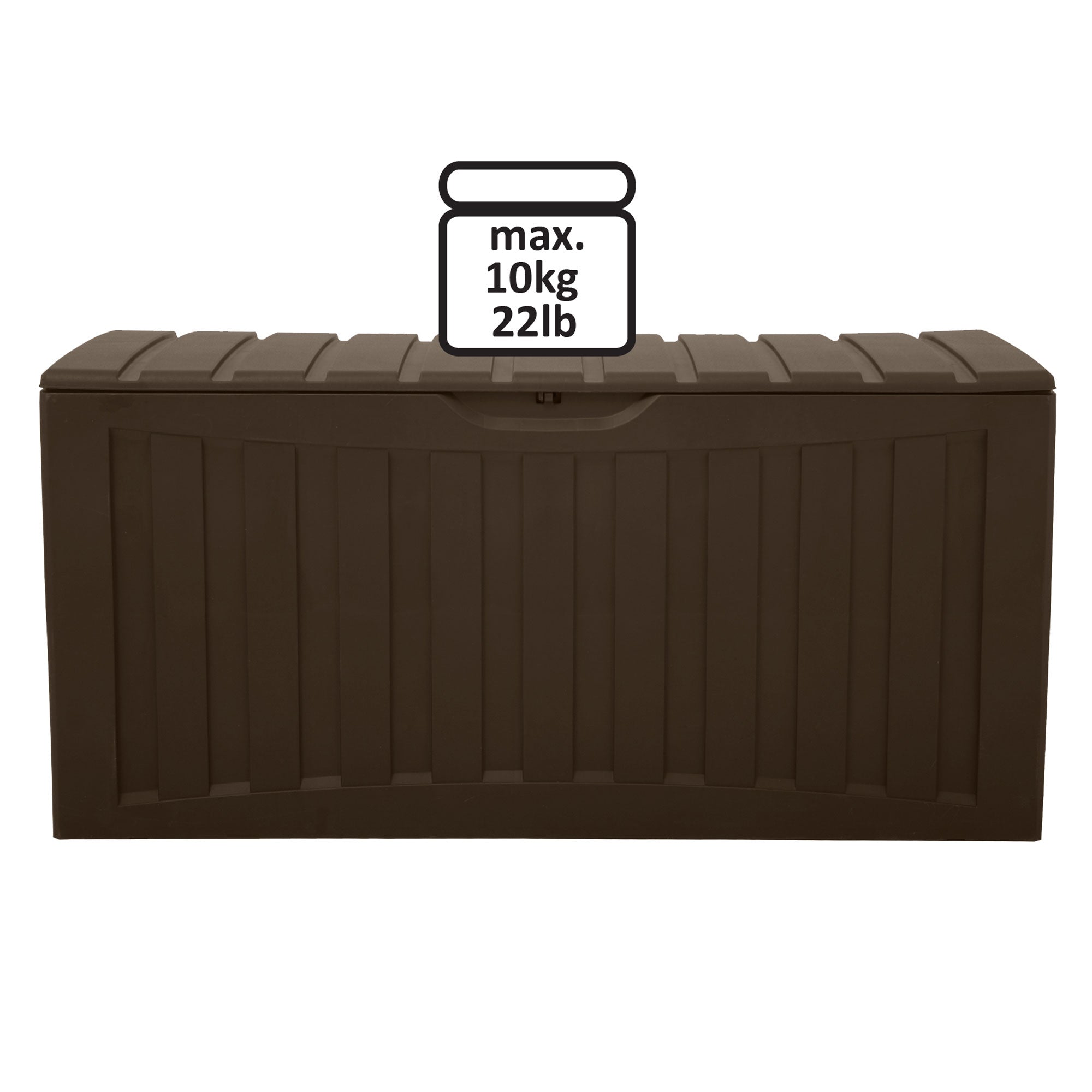 Designed for indoor and outdoor use, the storage container offers plenty of space to hold everything. Great for storing away patio furniture cushions for the winter or summer storms, the box can also hold toys, pool accessories, beach towels, and other outdoor equipment. Roller wheels make the box easy to move, letting you wheel it from your patio to your garage or other storage location. A locking lid adds an extra layer of security that holds the box shut, ensuring your possessions are stored safely away. The container requires no tools for assembly. Simply follow the included instructions for a fast assembly. Strong plastic construction cleans easily, removing the need for maintenance and withstanding outdoor conditions.