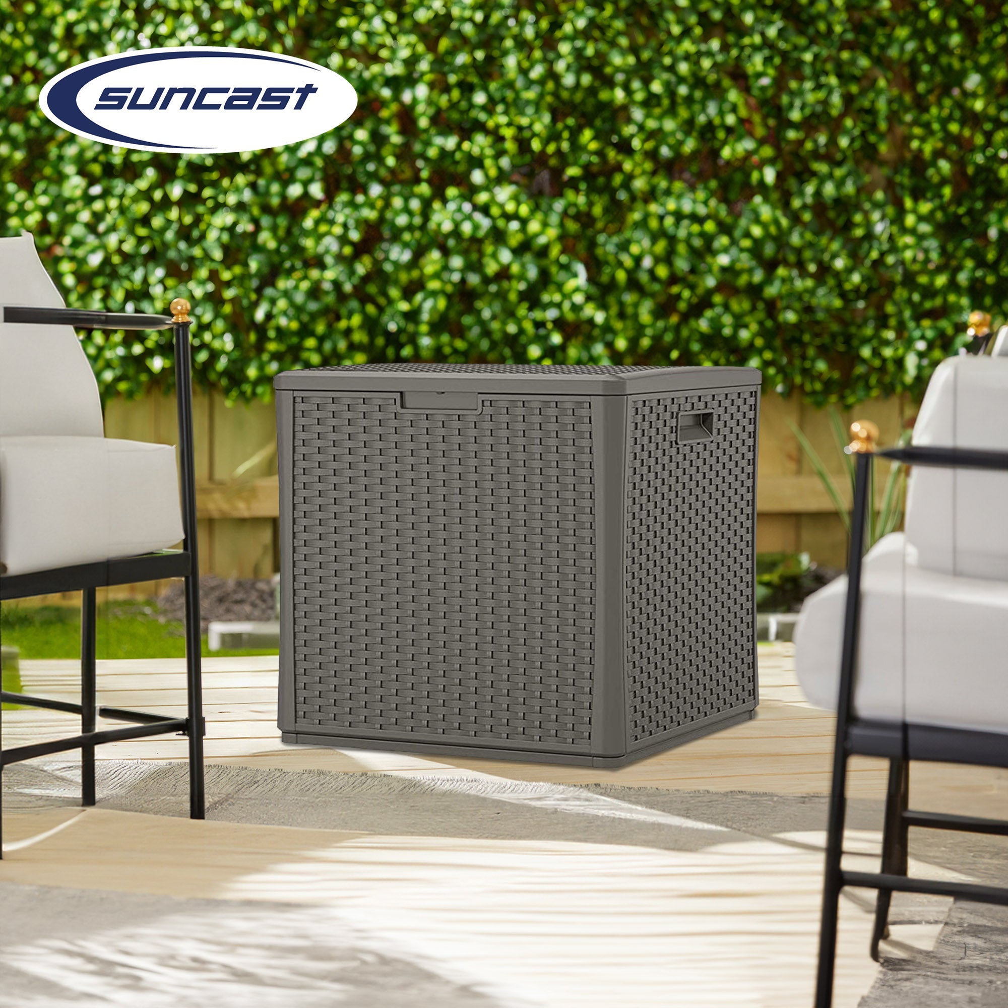 Beauty meets functionality in this 60 Gallon Storage Cube from Suncast. With a decorative wicker pattern design, the Storage Cube makes an attractive addition to any outdoor space. The lid is equipped with a gas shock to provide easy access to all your items. This essential outdoor organizer is perfect for stowing furniture cushions, patio equipment, gardening gear, and more. The high-quality resin construction stands up to year-round use. Storage never looked so good!