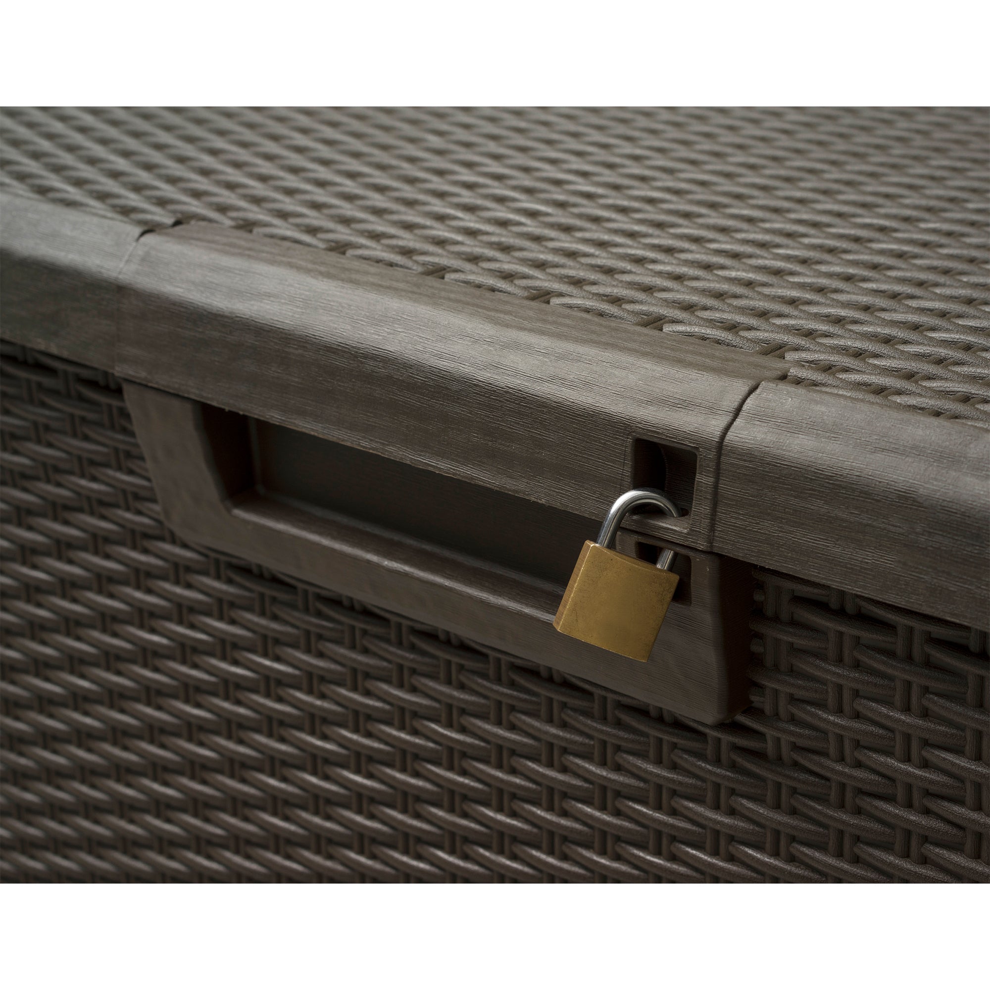 The 145-gallon deck box is both versatile and attractive. Great for convenient outdoor storage, this storage bench enables you to safely keep outdoor entertaining items close to where they will be used on the patio or deck. Let your children grab their pool items and head off to play. With the assisted lid for opening and closing lid, you don't have to worry about your young ones slamming the top closed. This lid is ensured to have a soft, quiet close. When it's time to head inside for the day, you can add a lock on the lockable lid on the box for added security and protection from theft, animals, or windy weather.