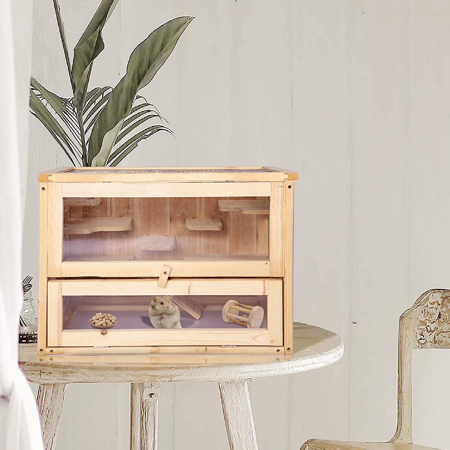 Safe and Secure: small pet house is designed to keep your hamster safe and secure from other household pets including cats or dogs. The hamster cage is made of natural wood, safe materials and non-toxic, with a robust wire net structure.