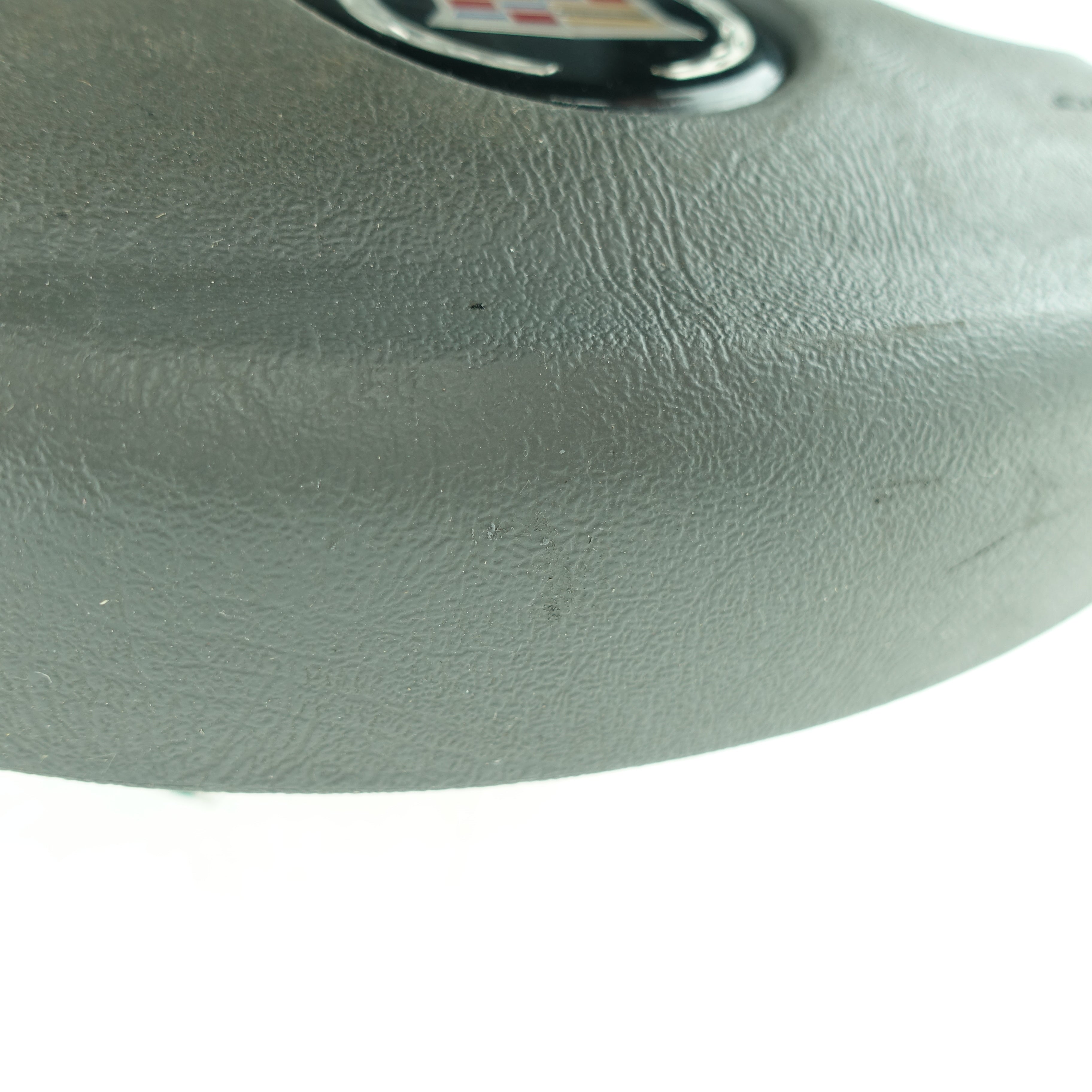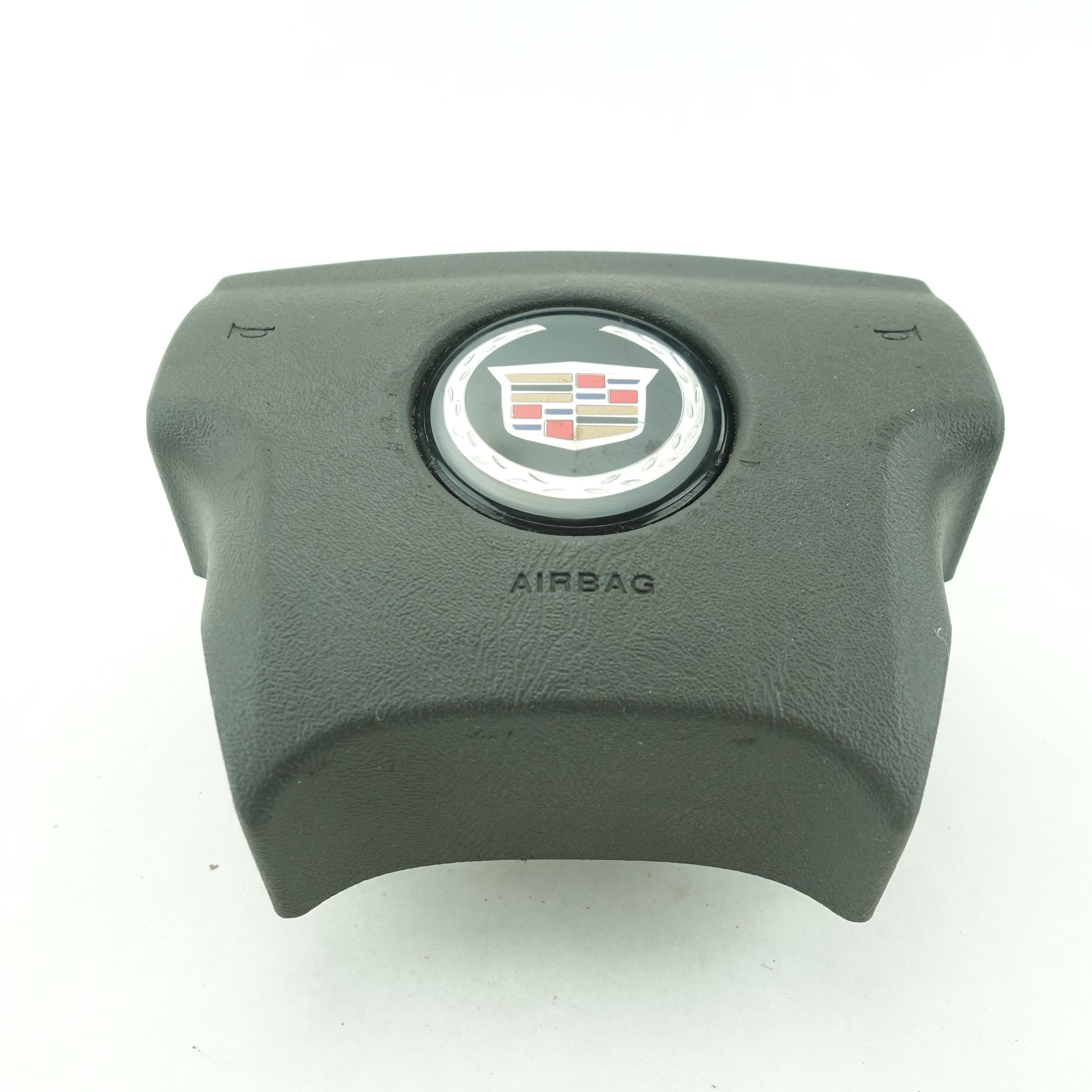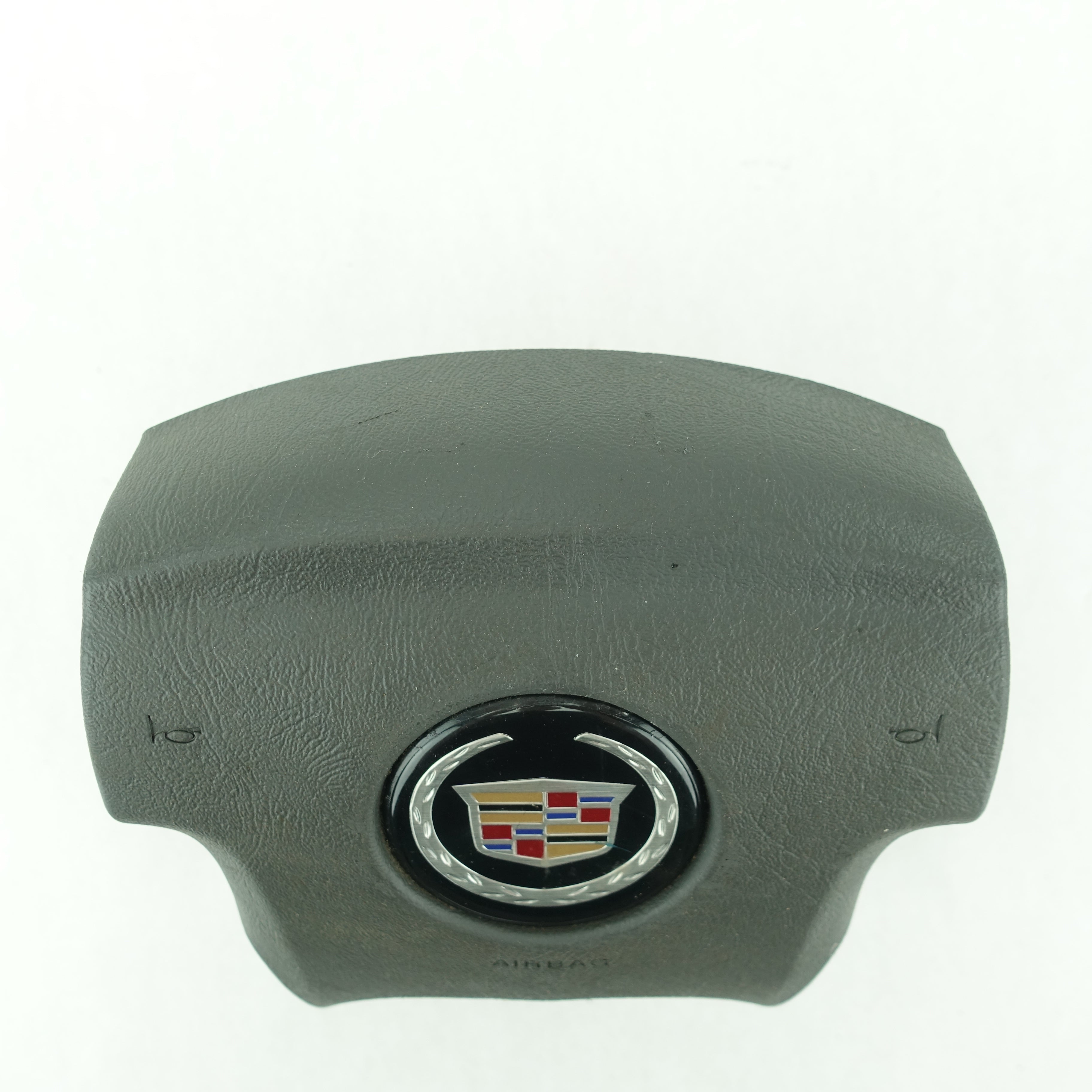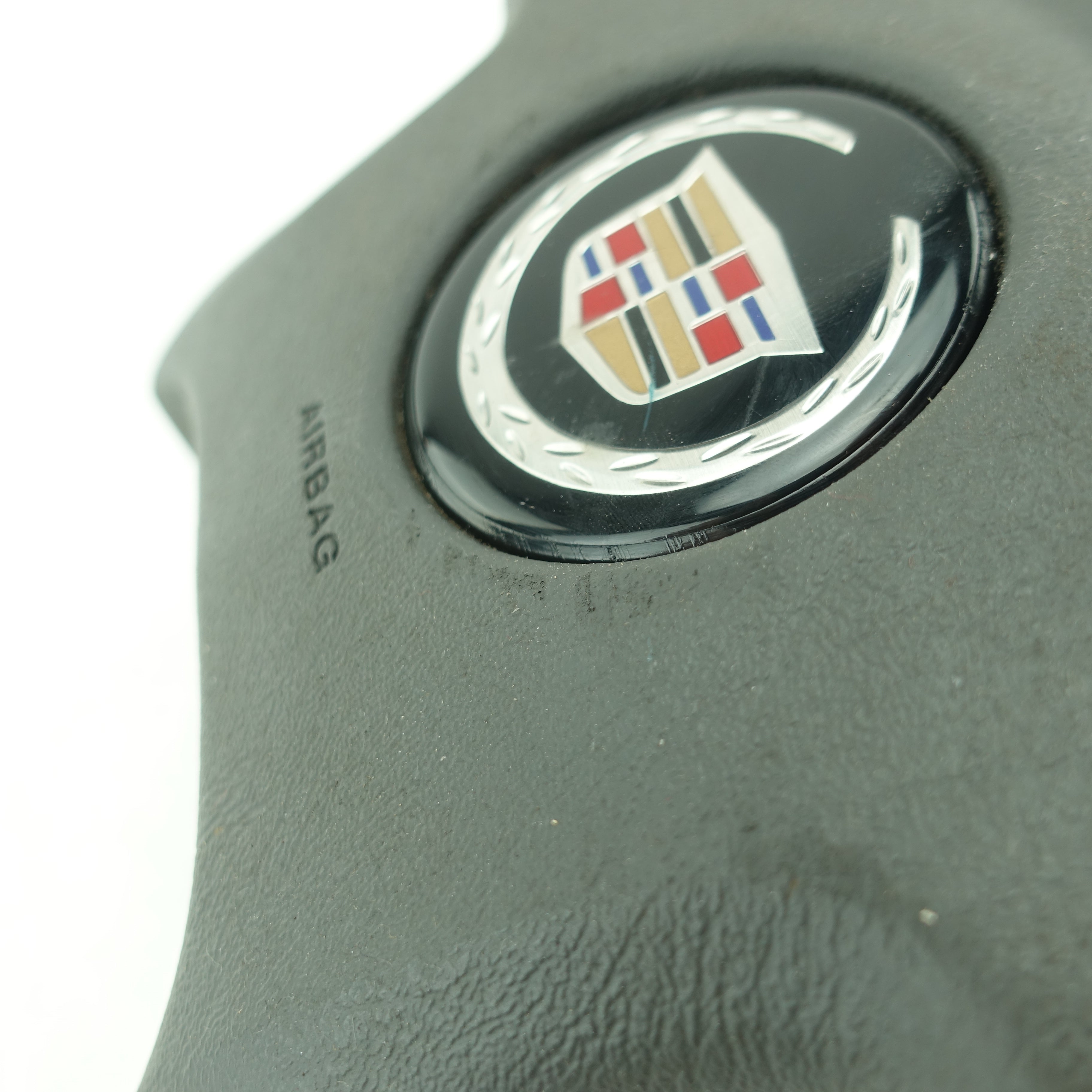 This is a used airbag from a 2006 Cadillac Escalade. The item has some scratches on its face and the emblem has some imperfections.
