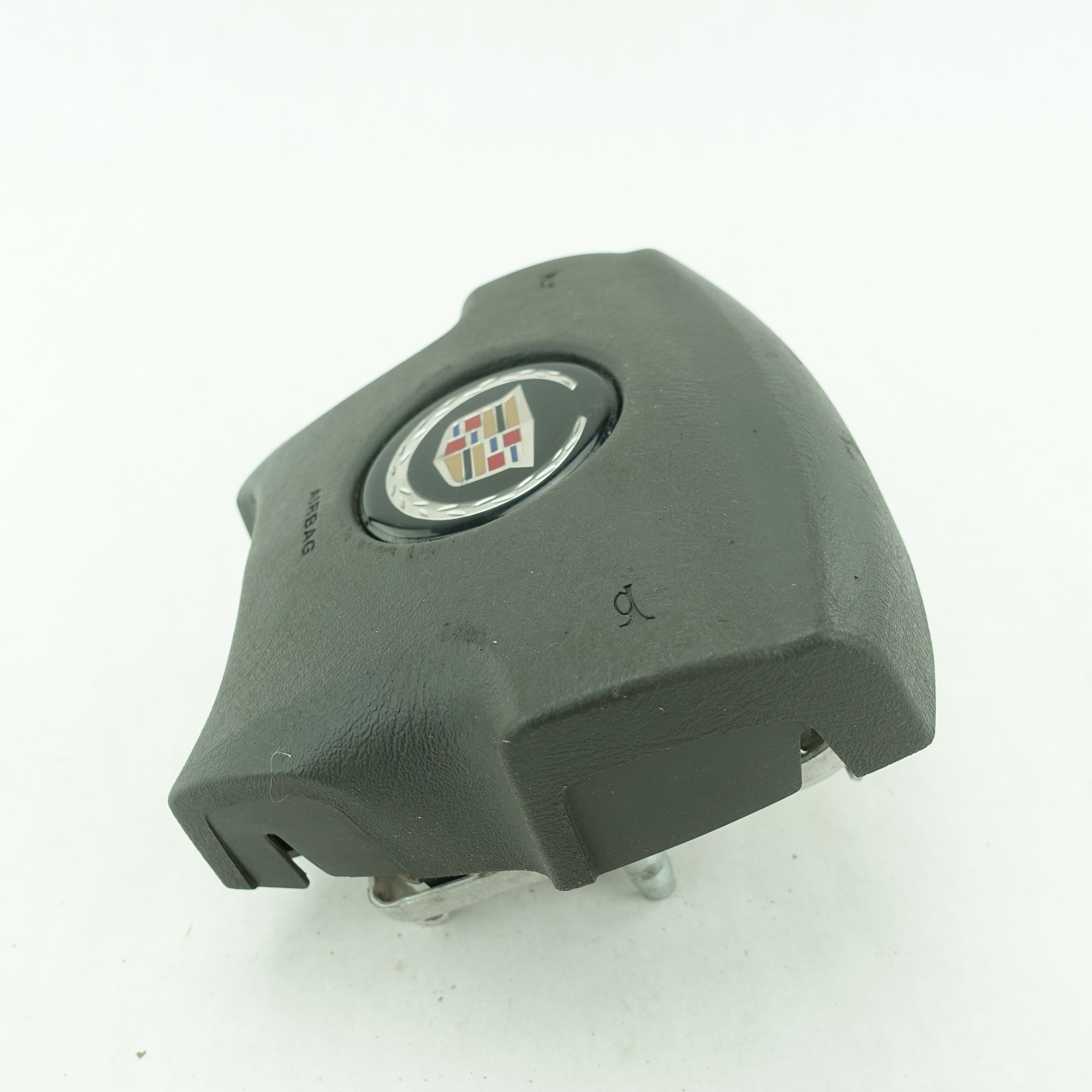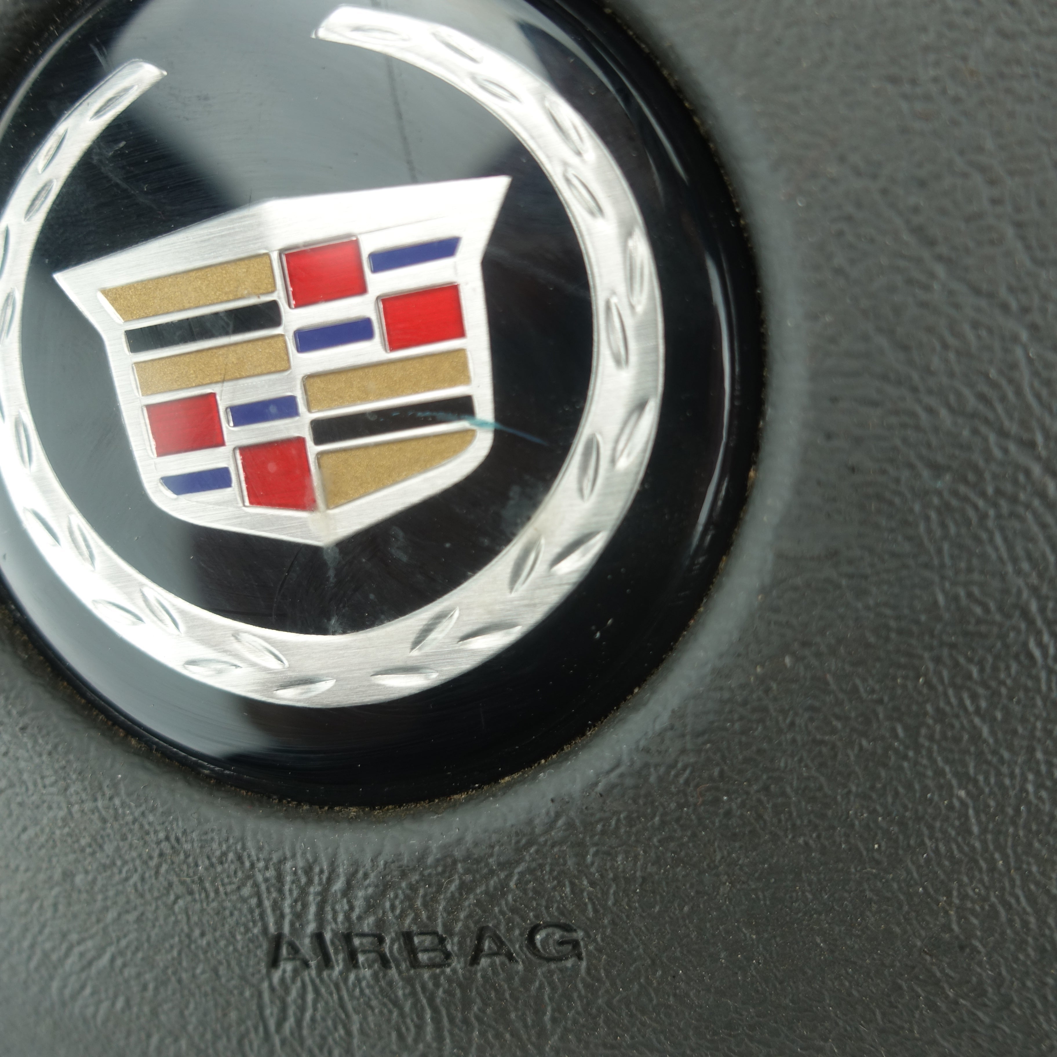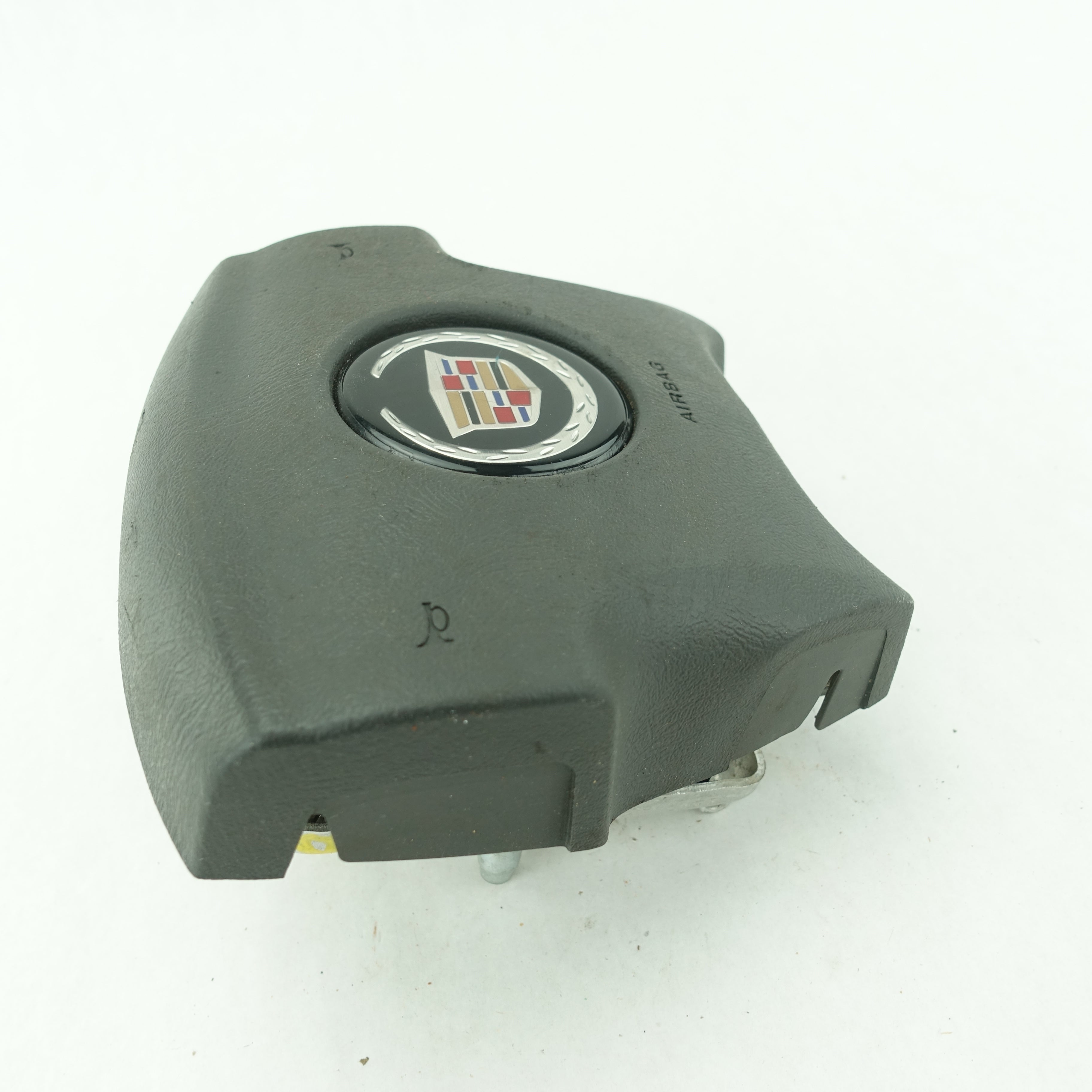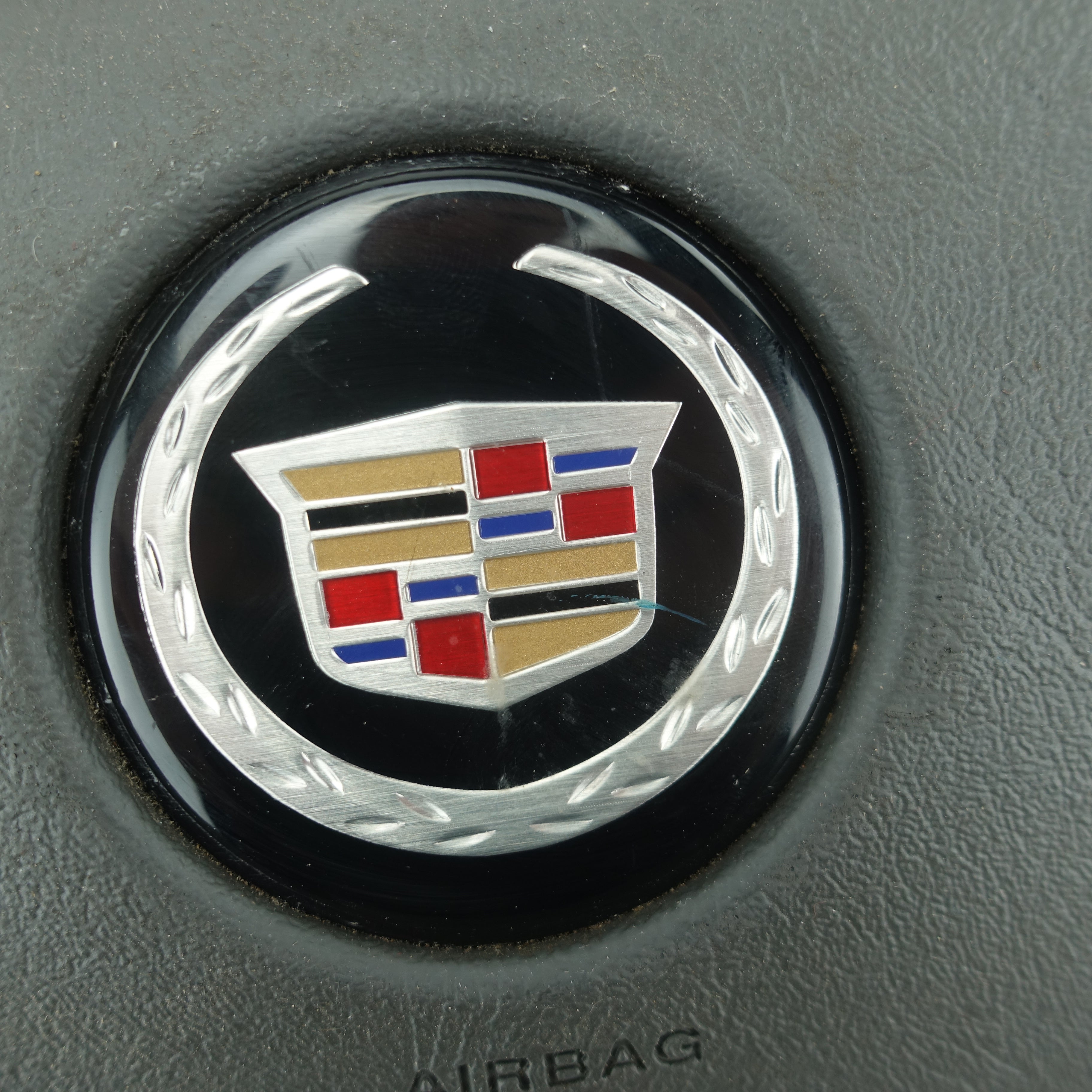 This is a used airbag from a 2006 Cadillac Escalade. The item has some scratches on its face and the emblem has some imperfections.