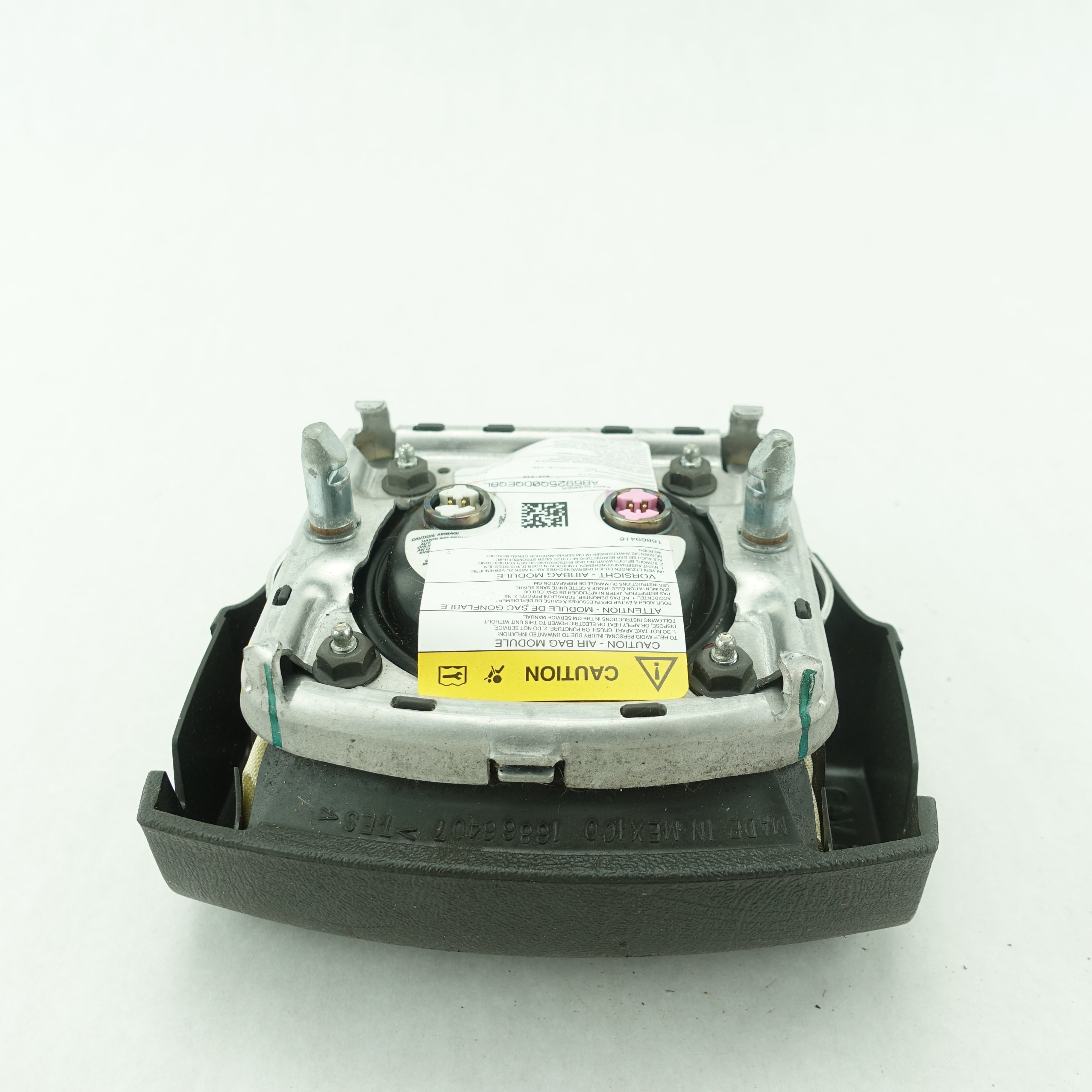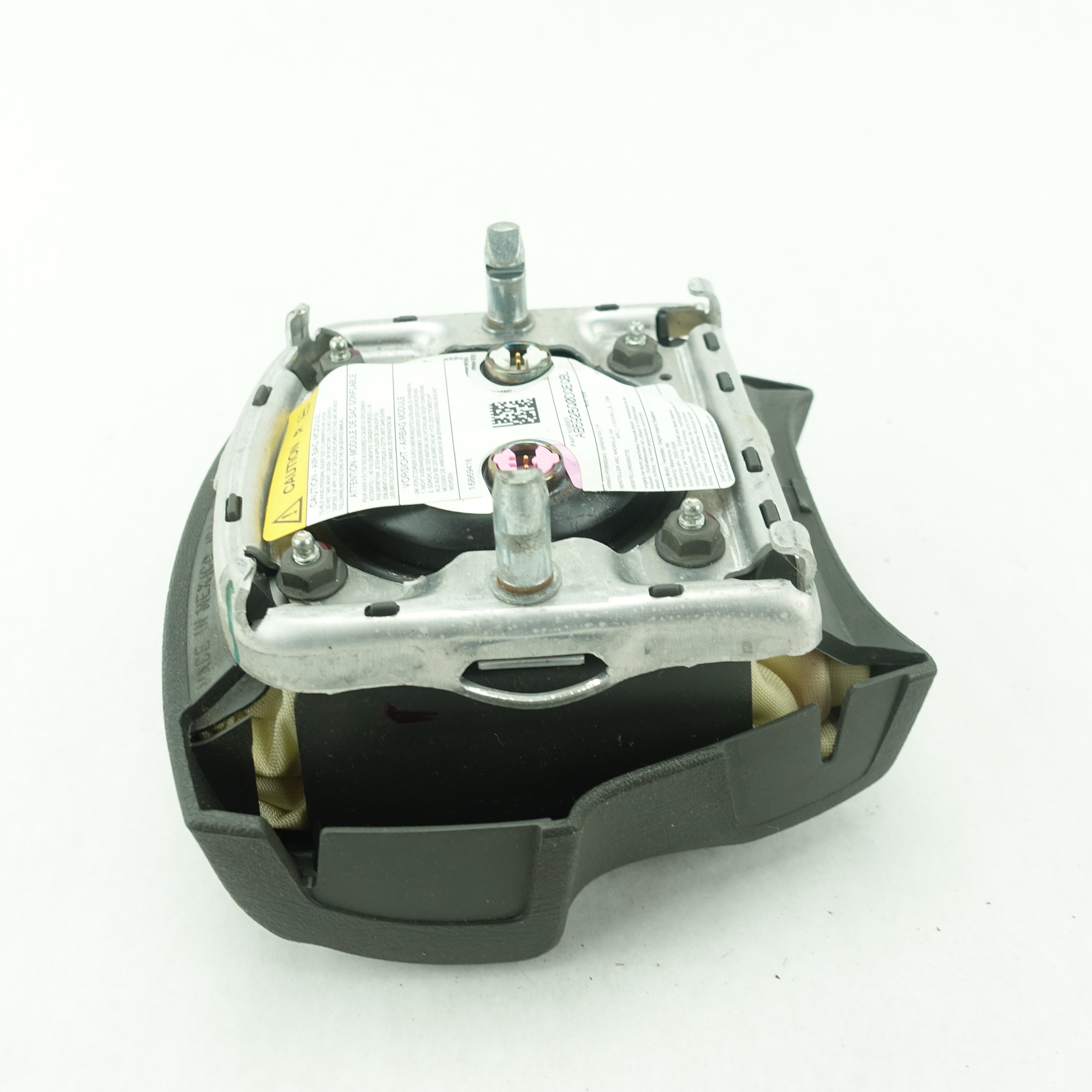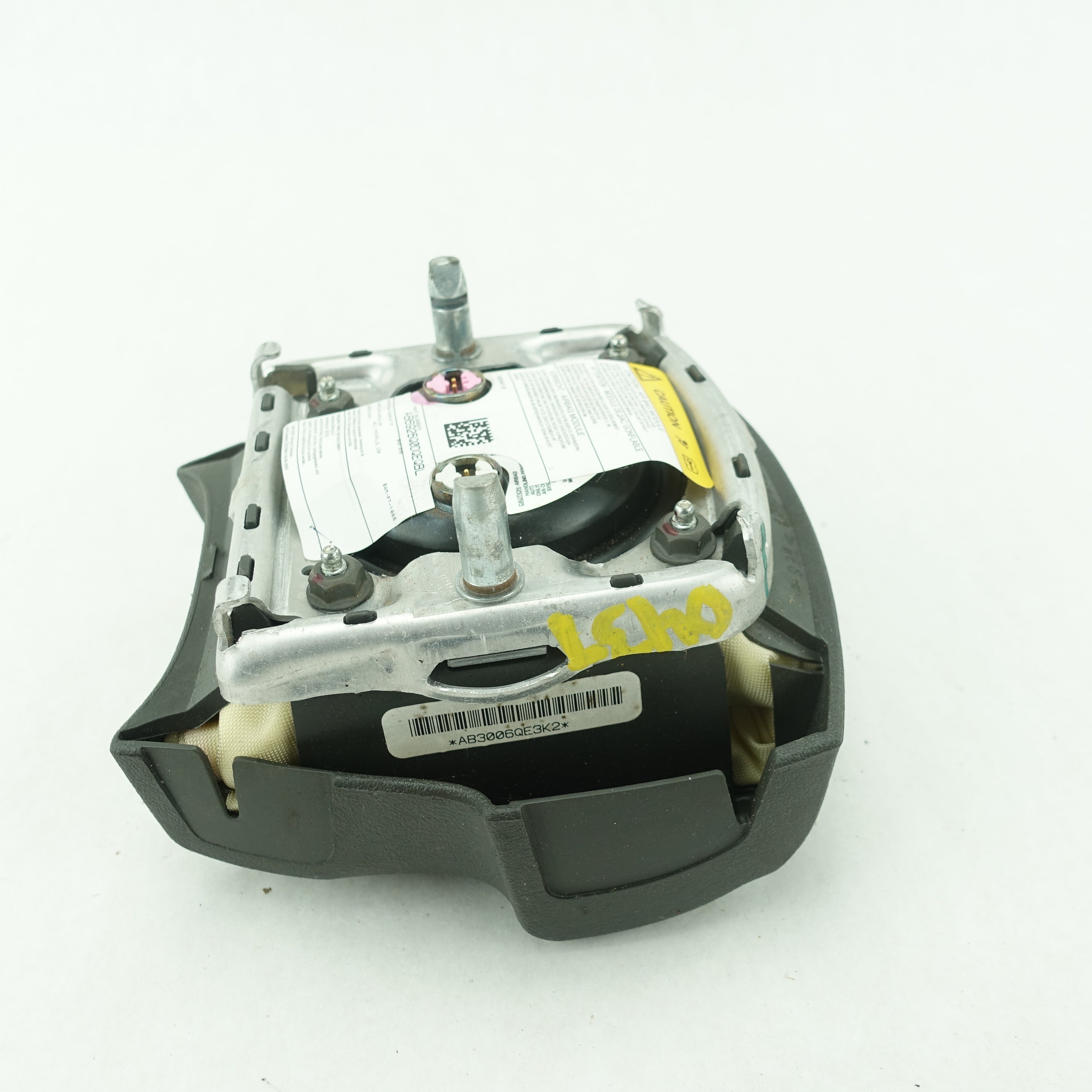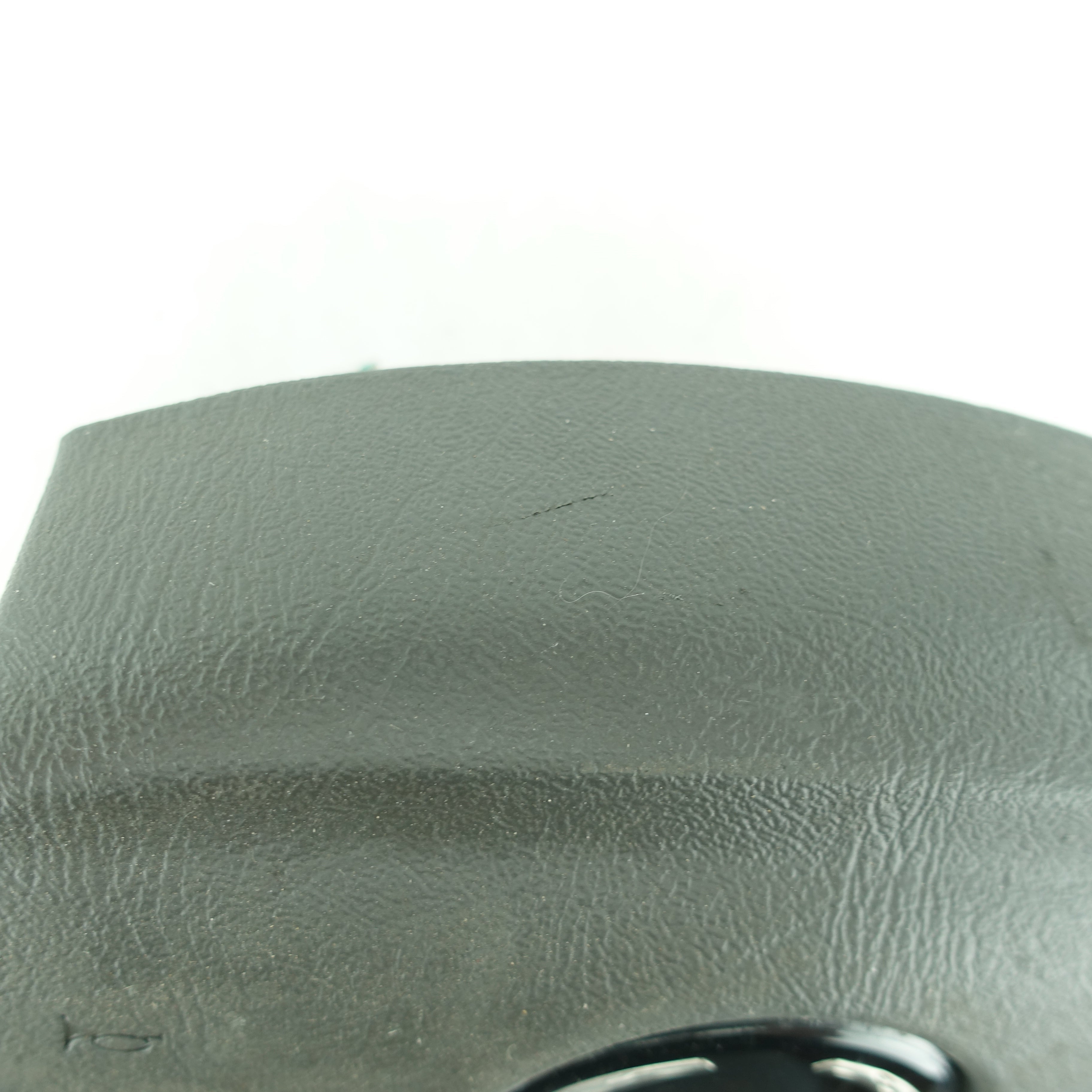 This is a used airbag from a 2006 Cadillac Escalade. The item has some scratches on its face and the emblem has some imperfections.
