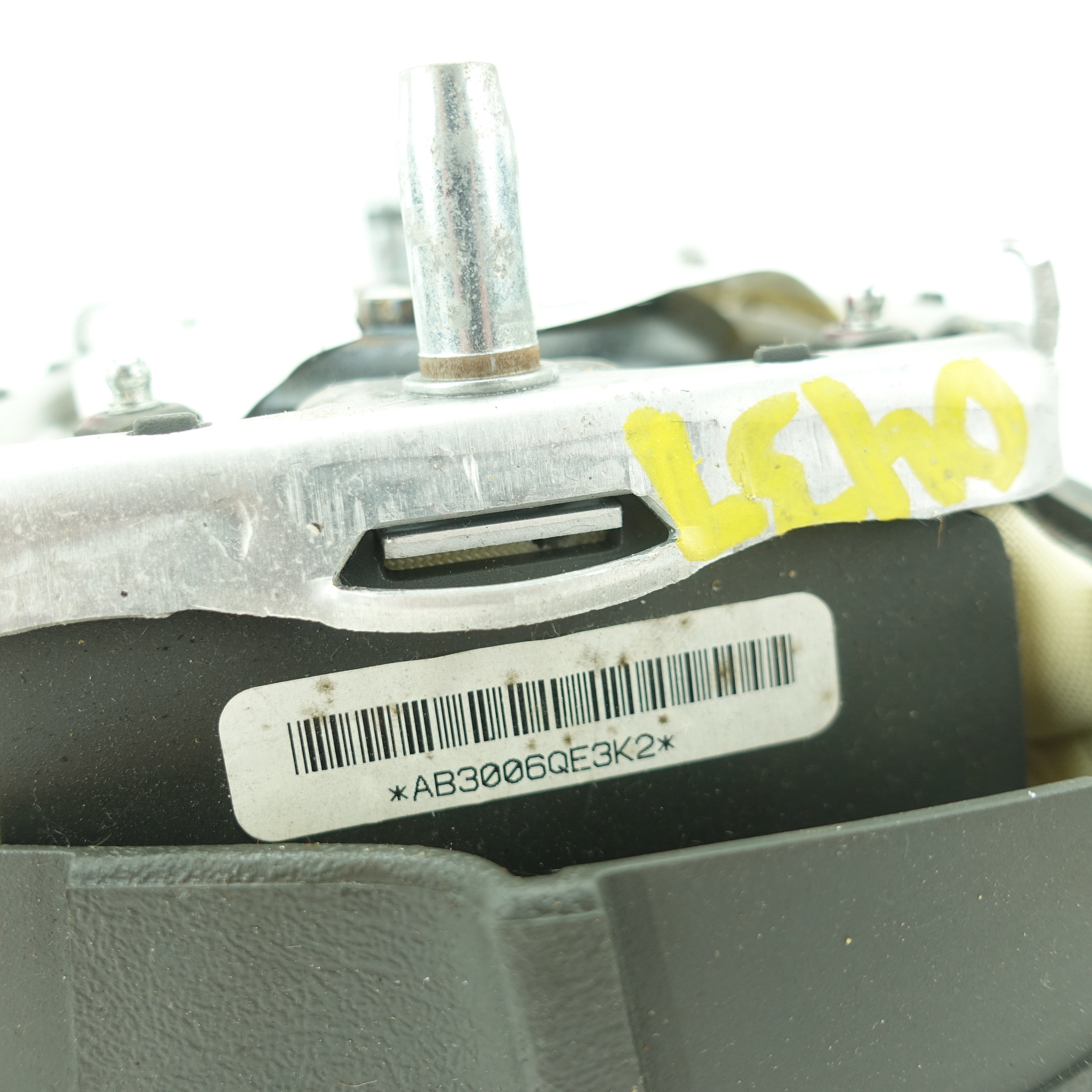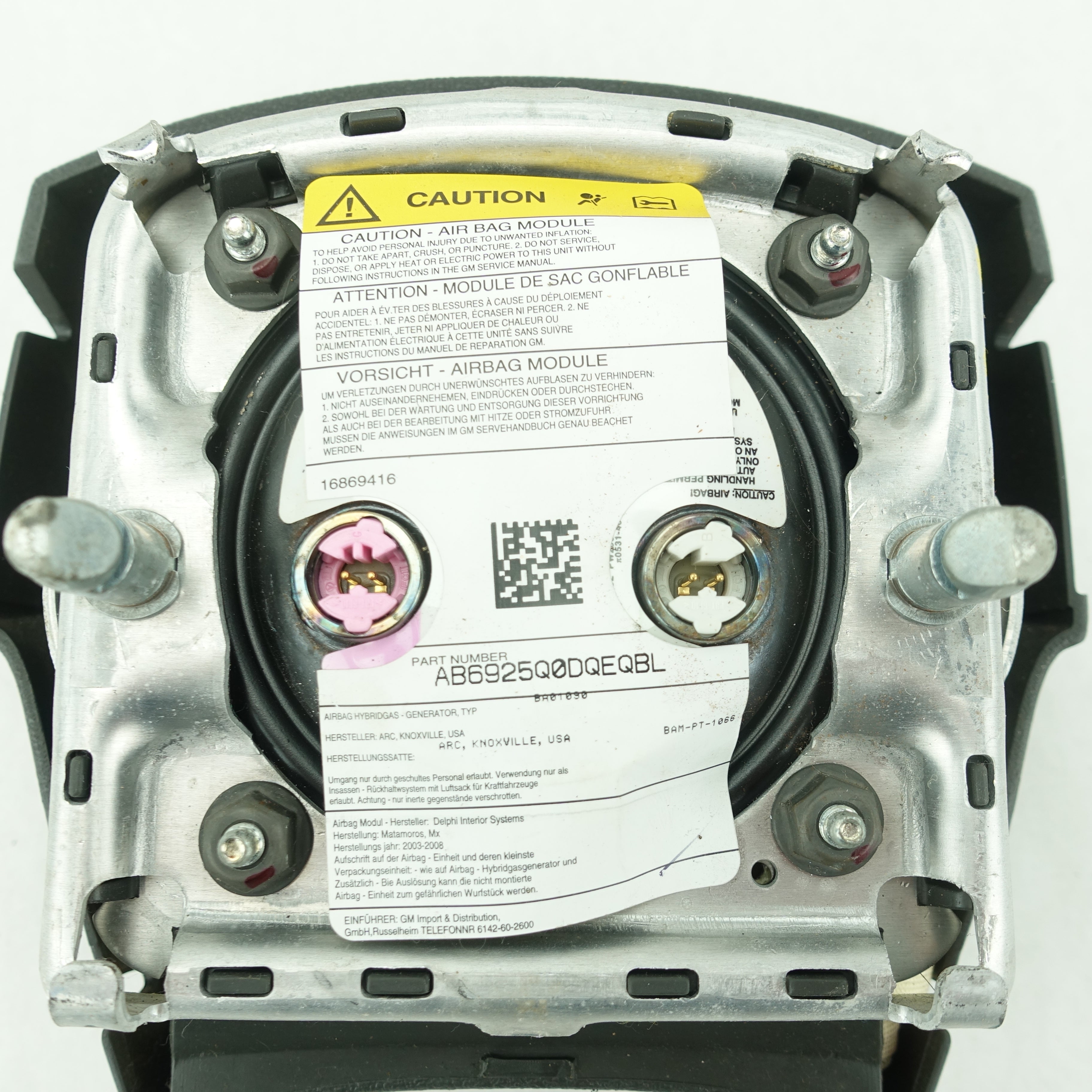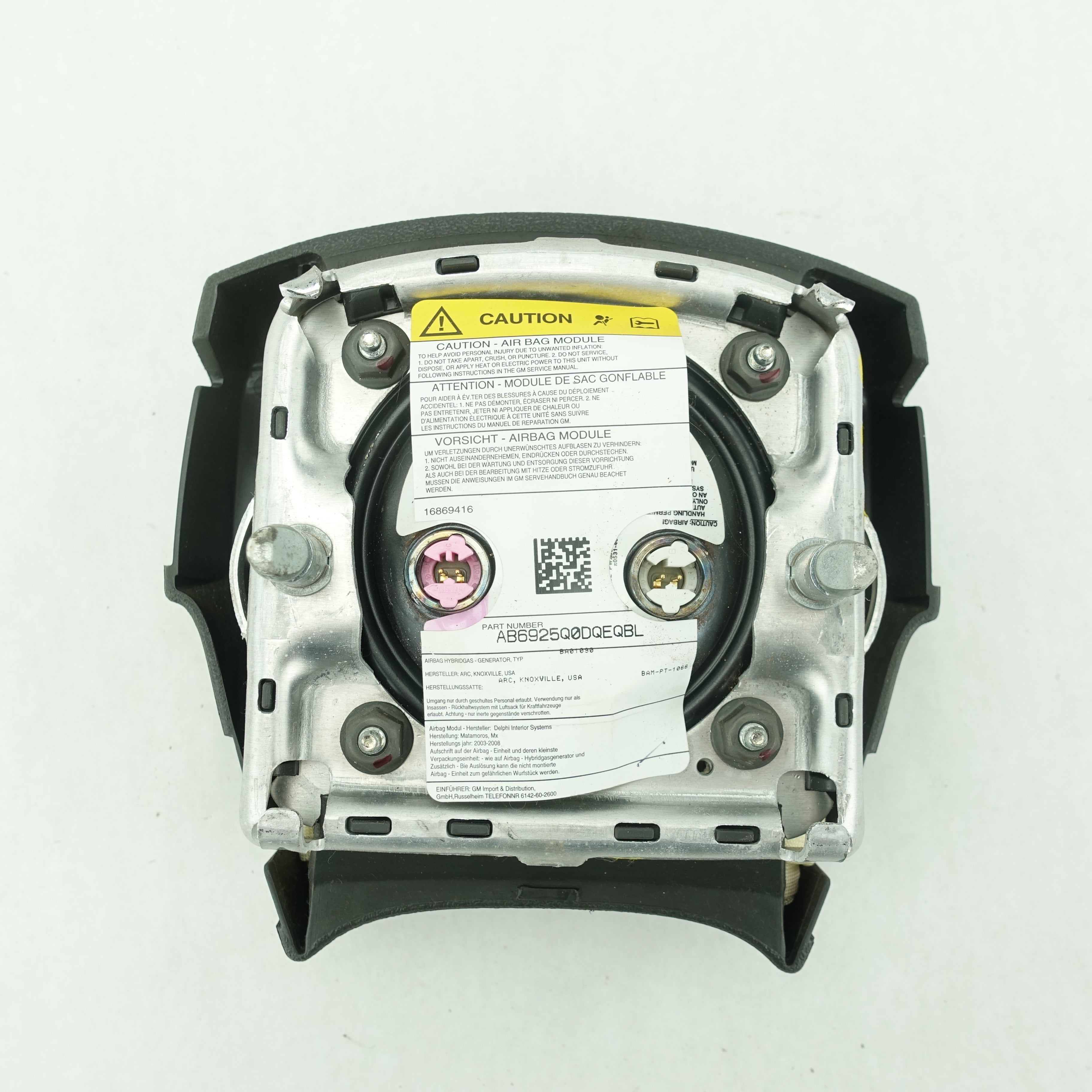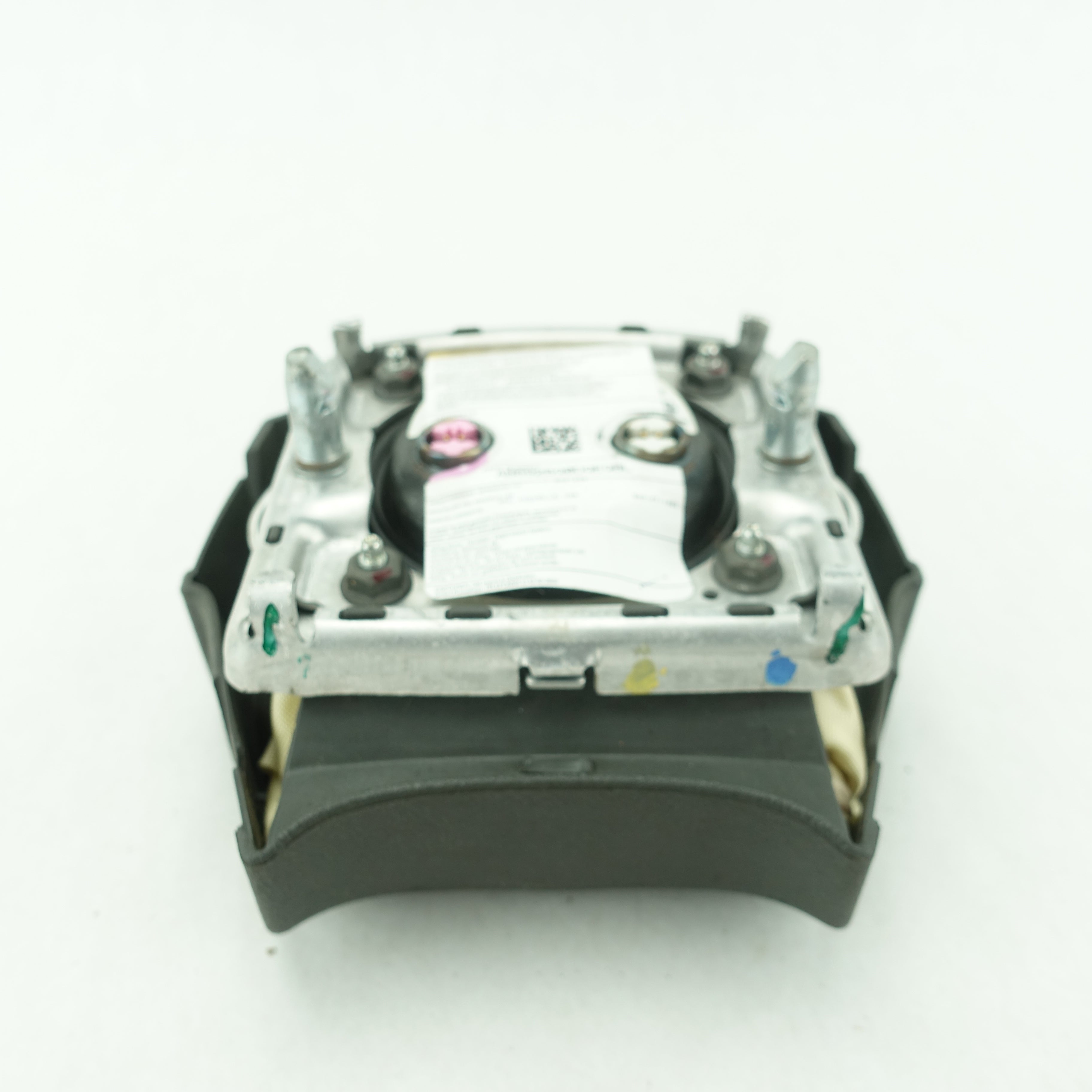 This is a used airbag from a 2006 Cadillac Escalade. The item has some scratches on its face and the emblem has some imperfections.