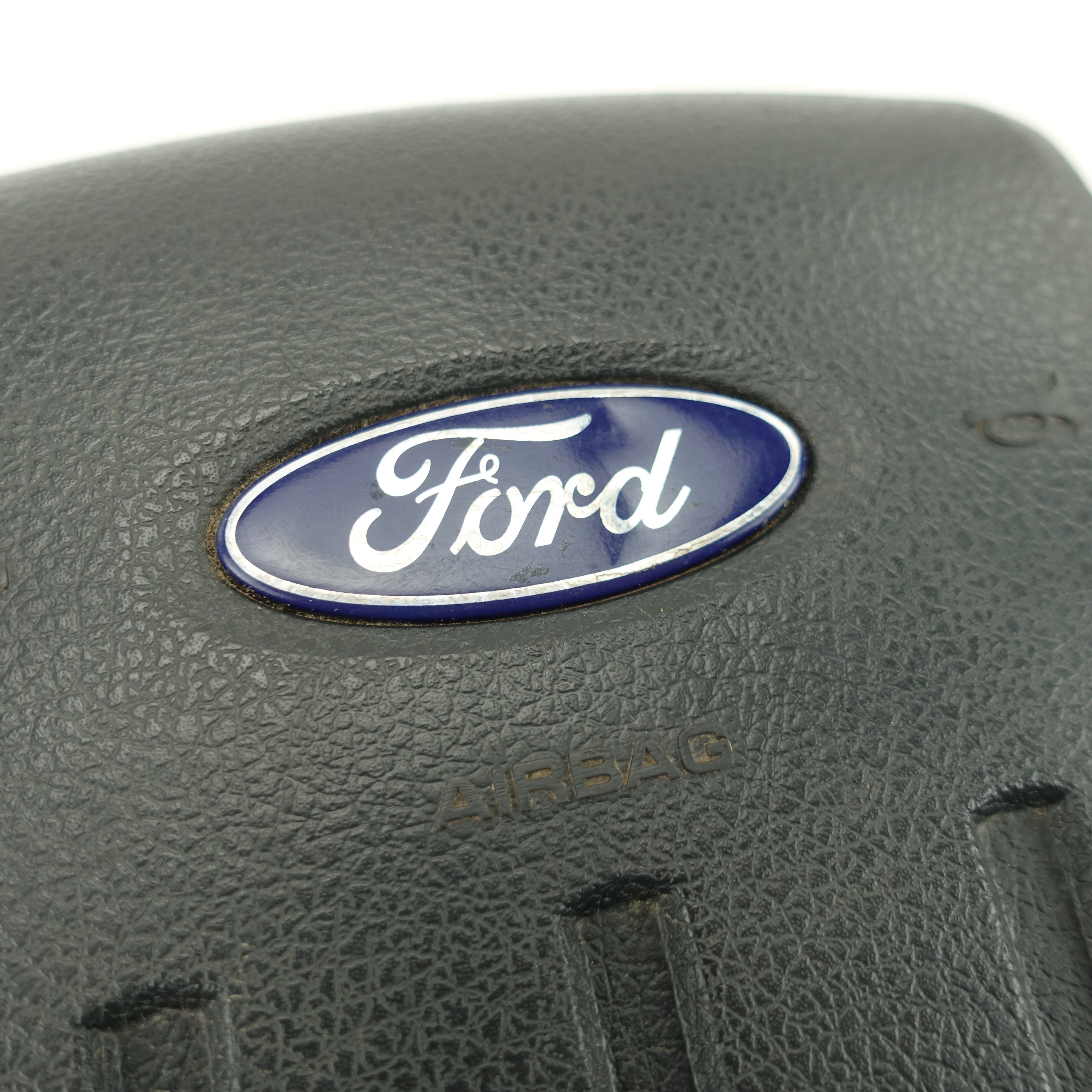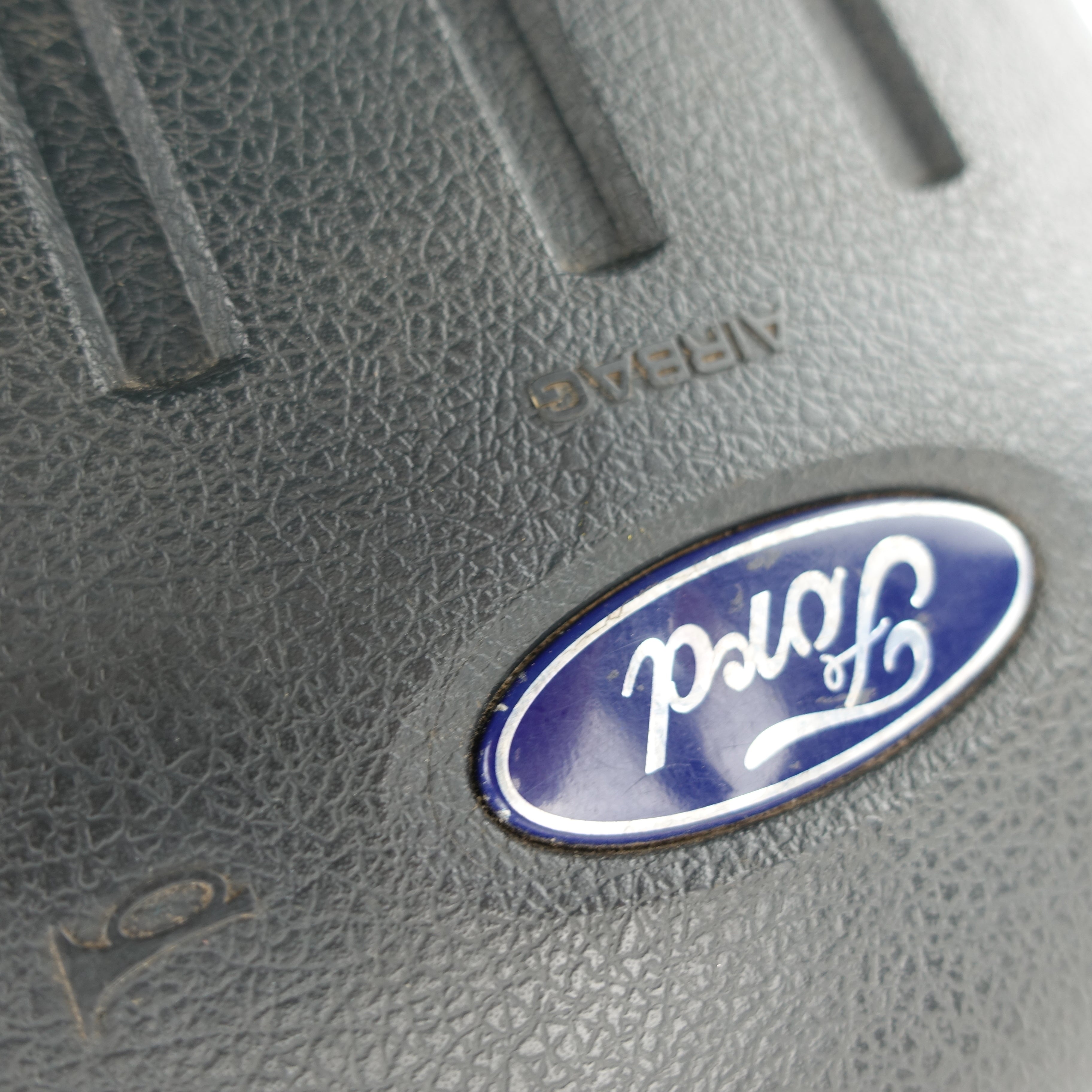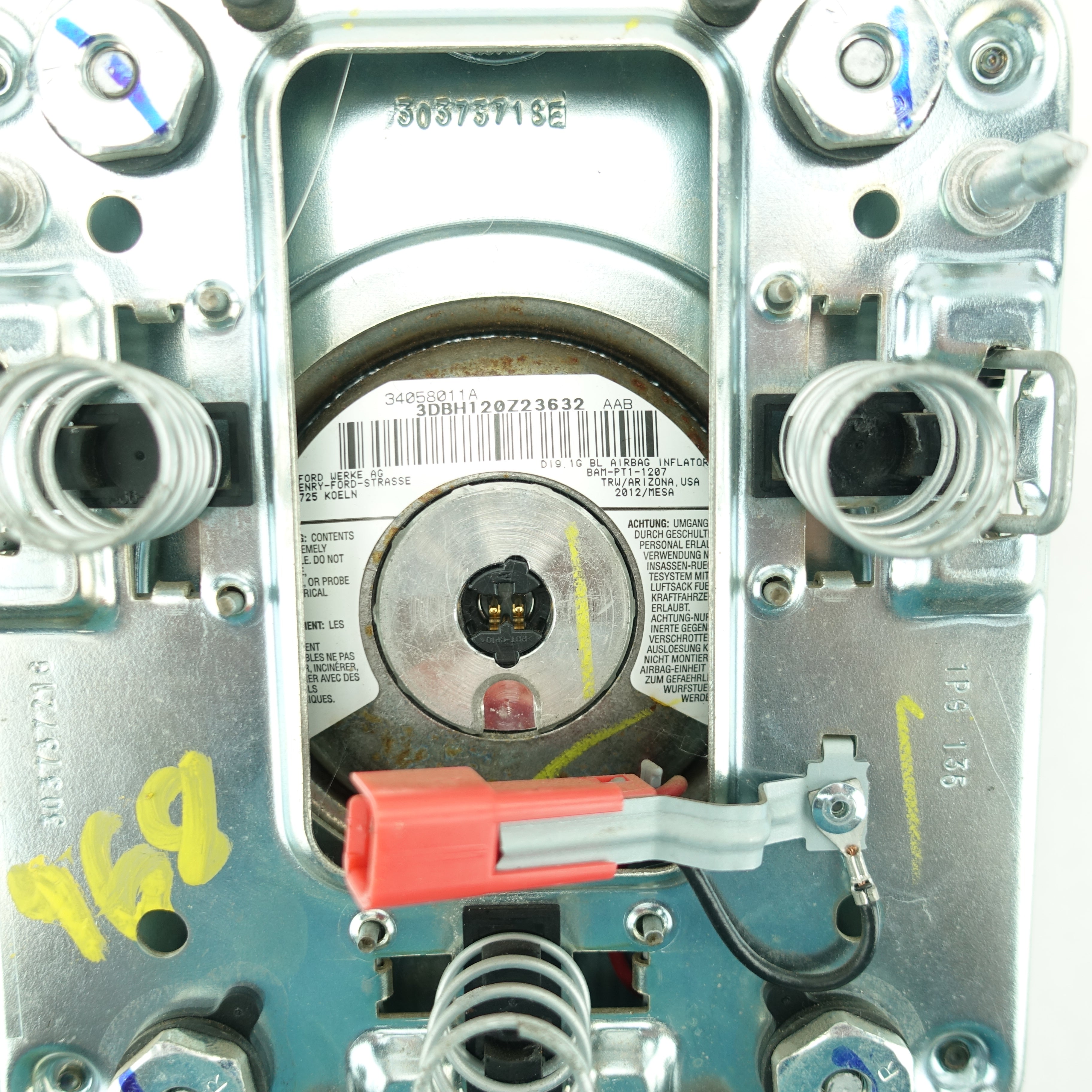 This is a used airbag from a 2012 Ford F250. The item has a dent on the emblem.