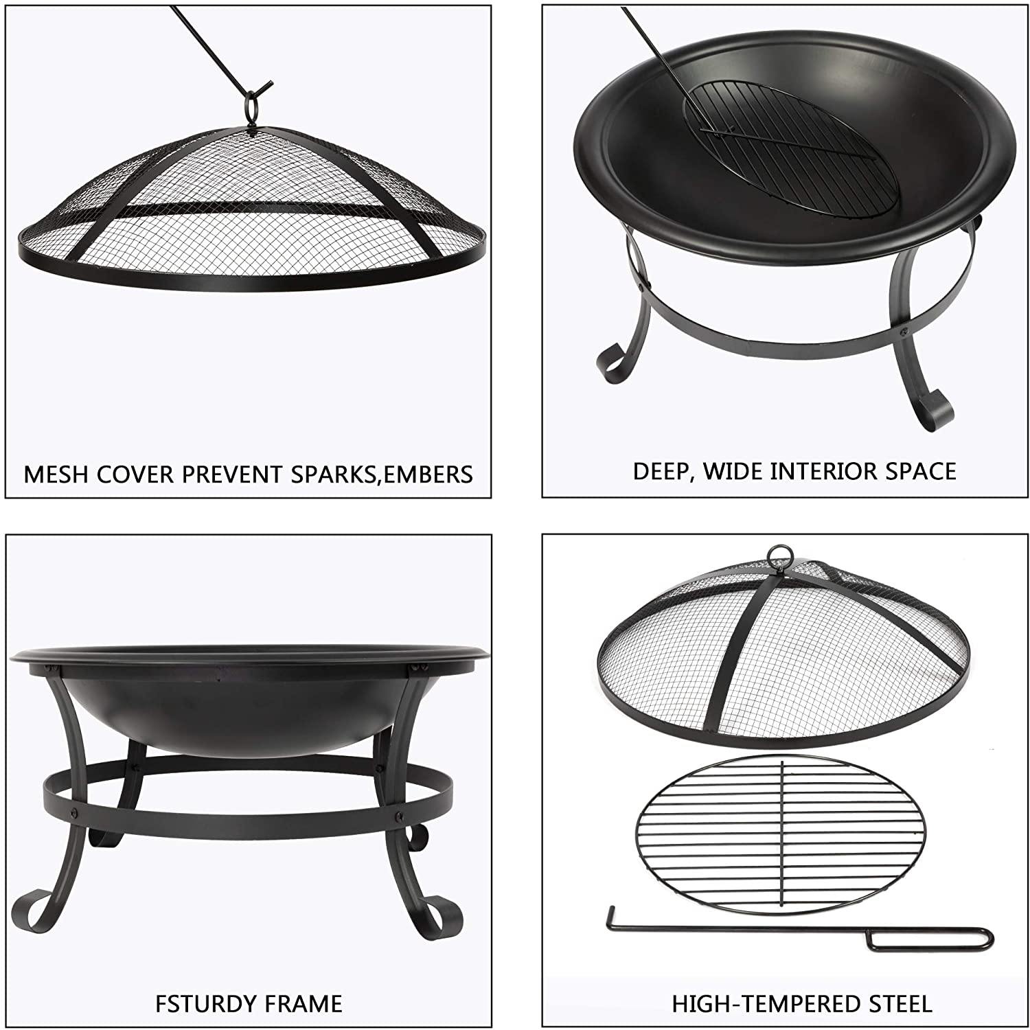 22-Inch Outdoor Wood-Burning BBQ Grill Fire Pit with Round Mesh Spark Screen Cover