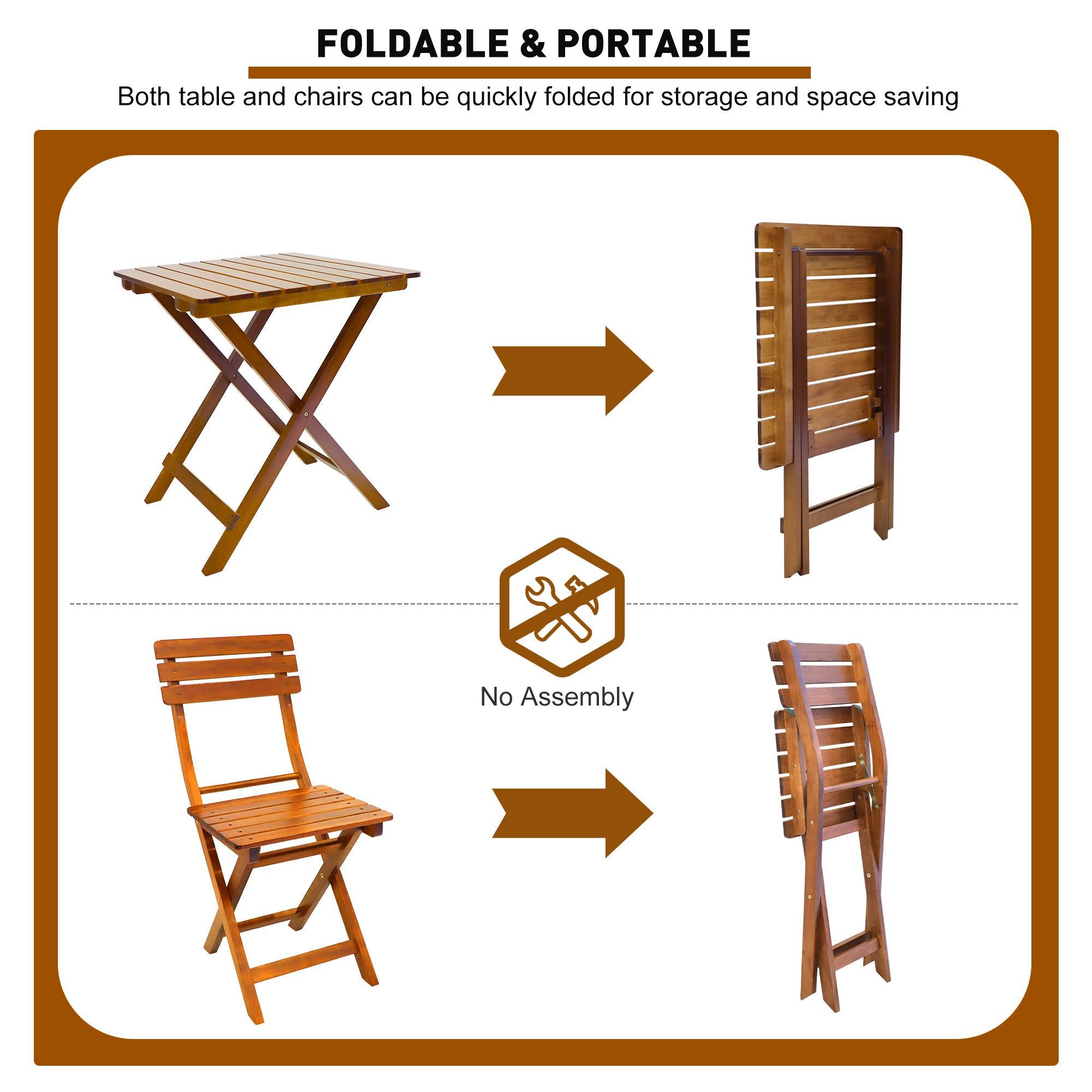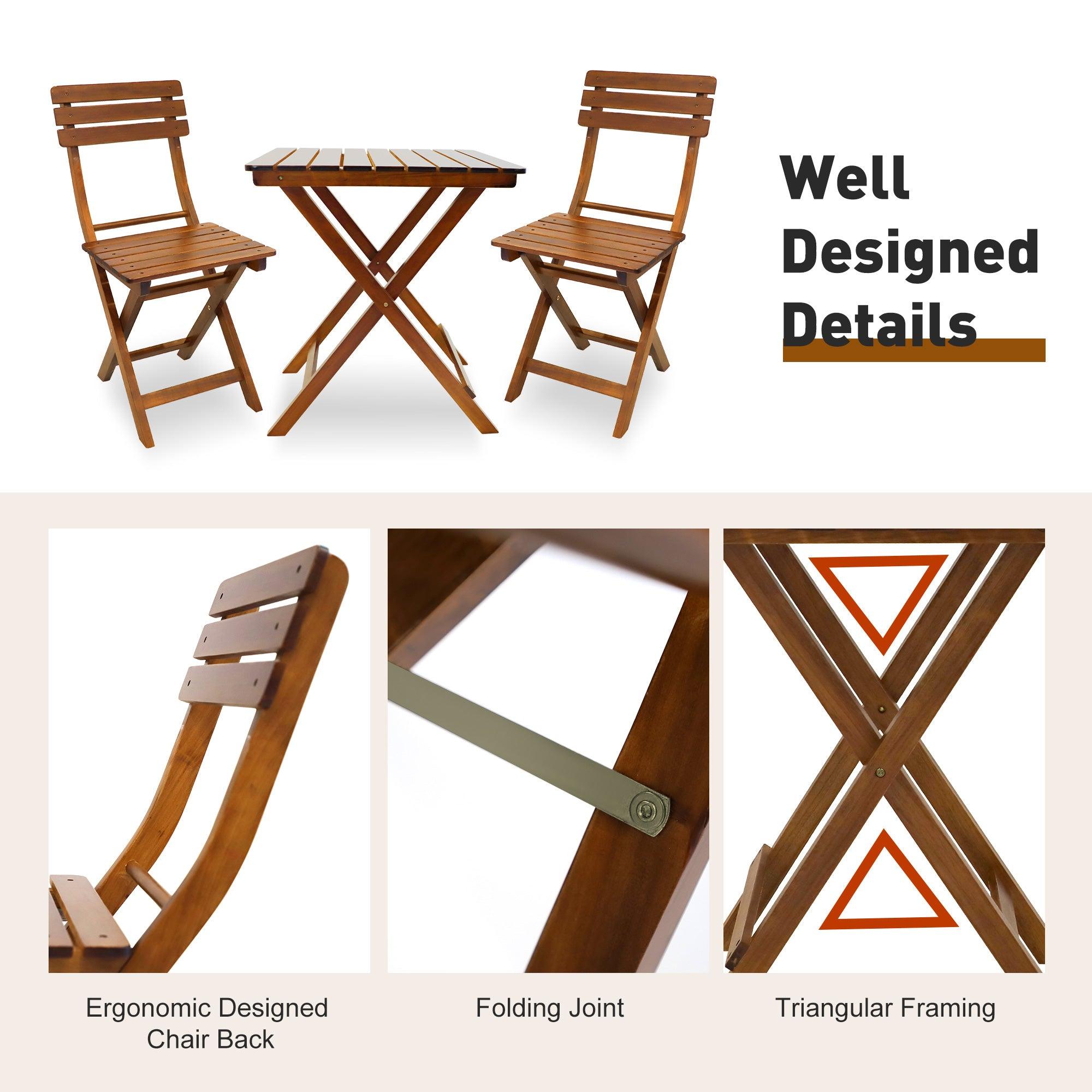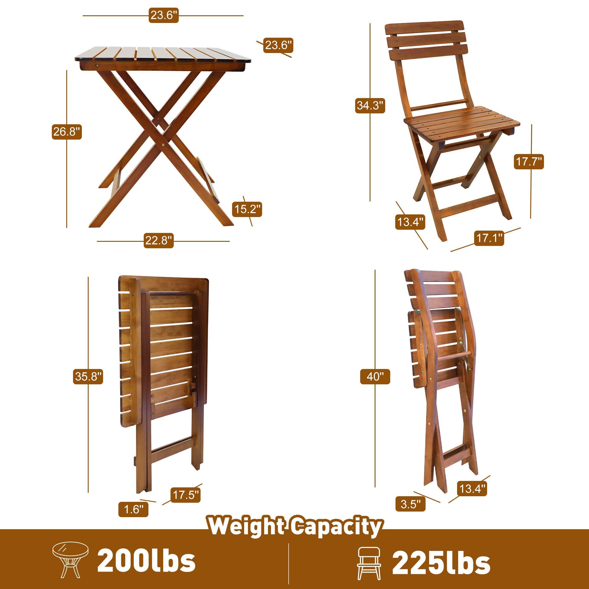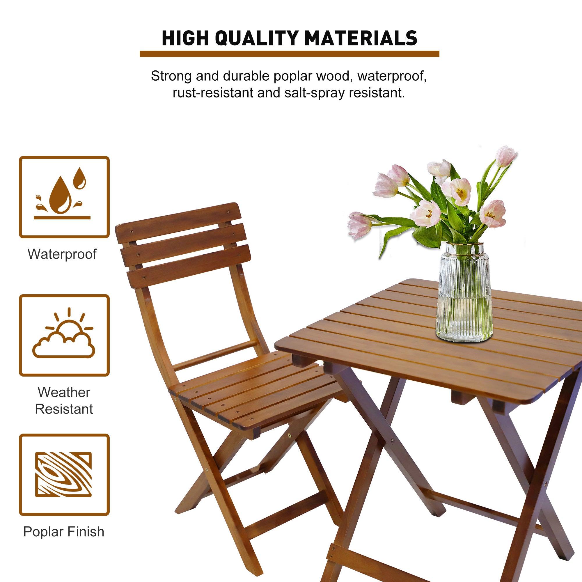 3-piece folding bistro set. Features folding capabilities for both chairs, and the table for easy portability and storage. The minimalist but sleek and modern design allows this collection to be enjoyed on any patio or backyard. All the wood is using oplar wood, sturdy and durable, classic teak color versatile with various scenes. No assembly required. Chairs have slatted seats and backs.