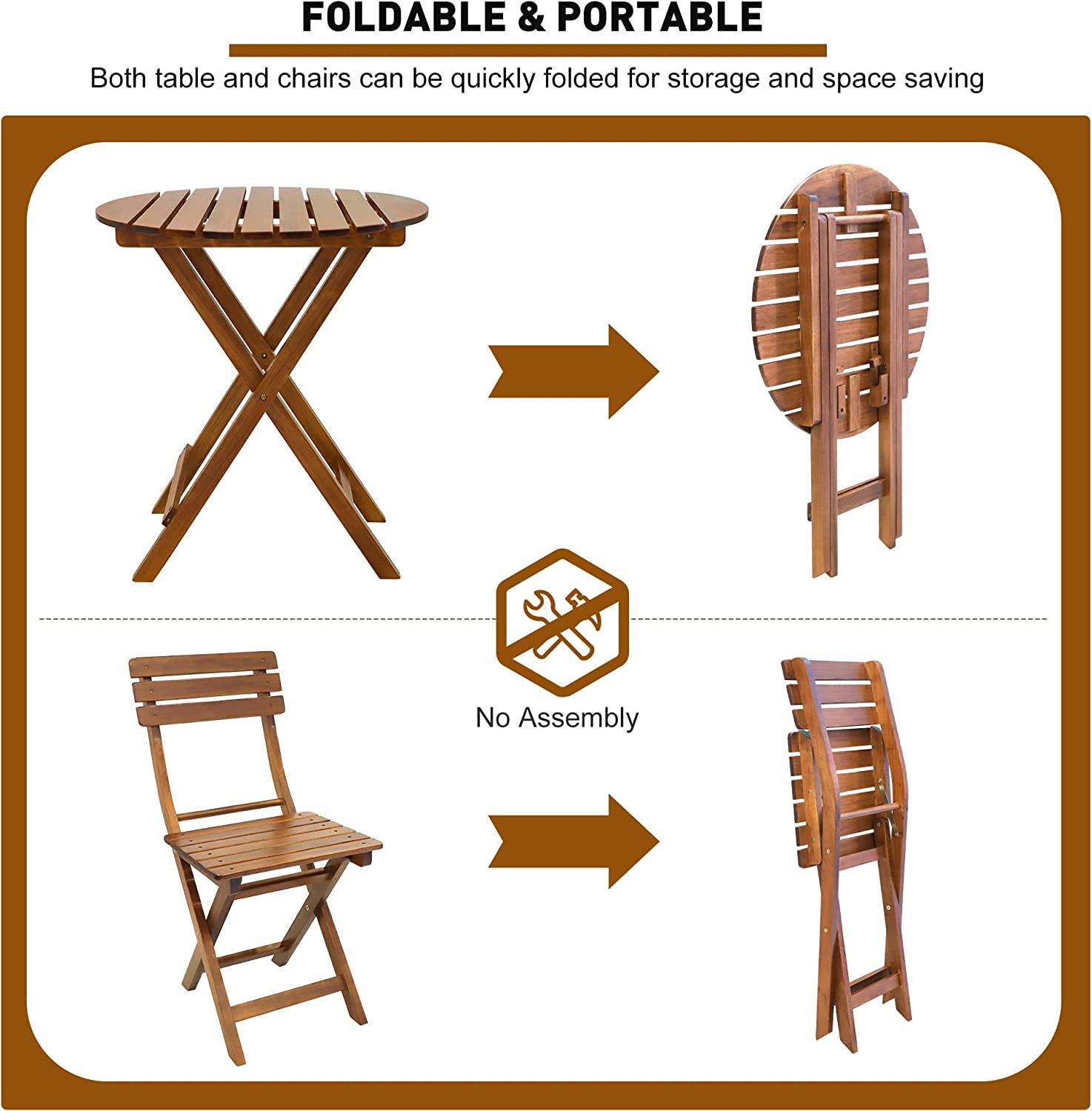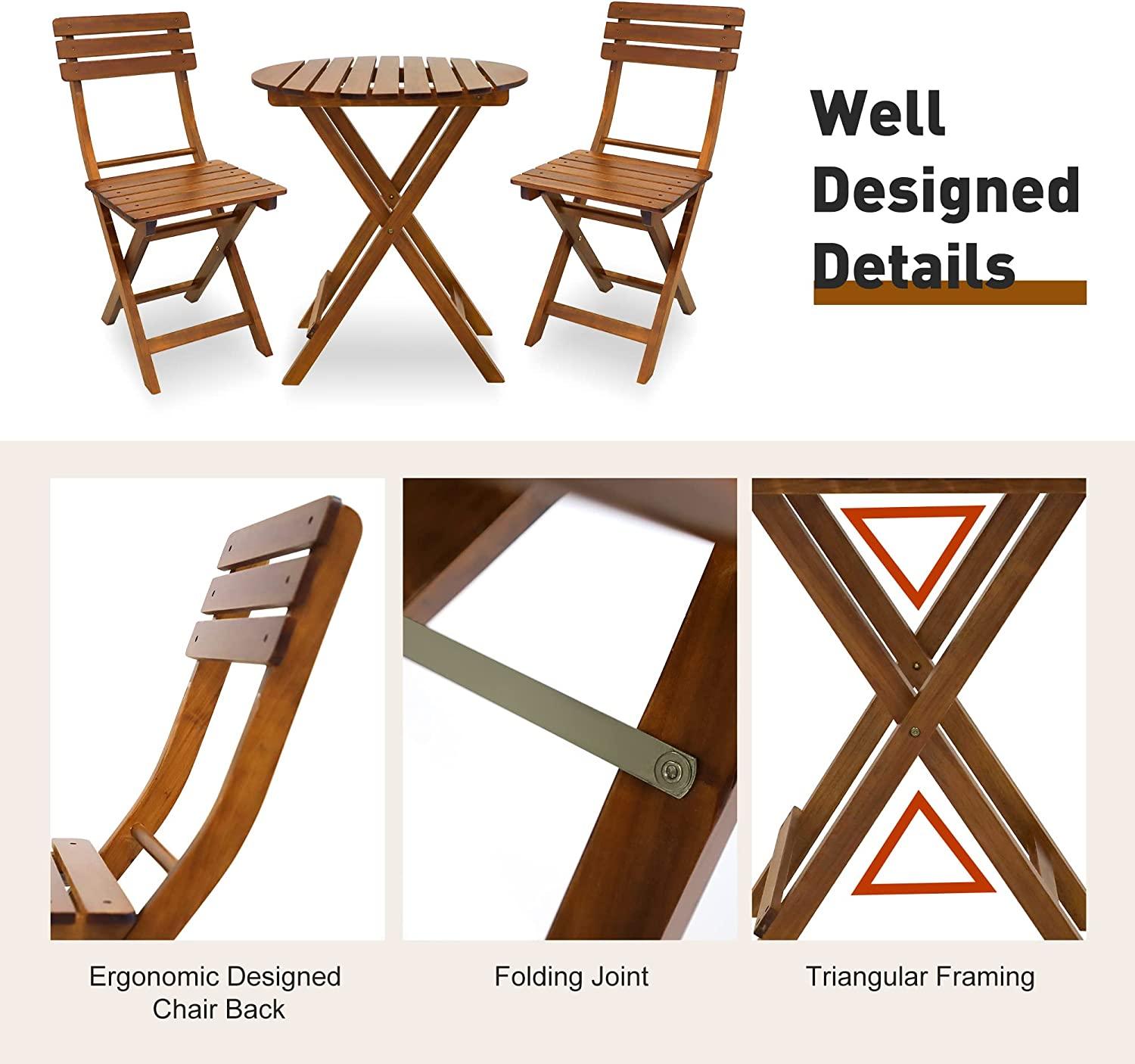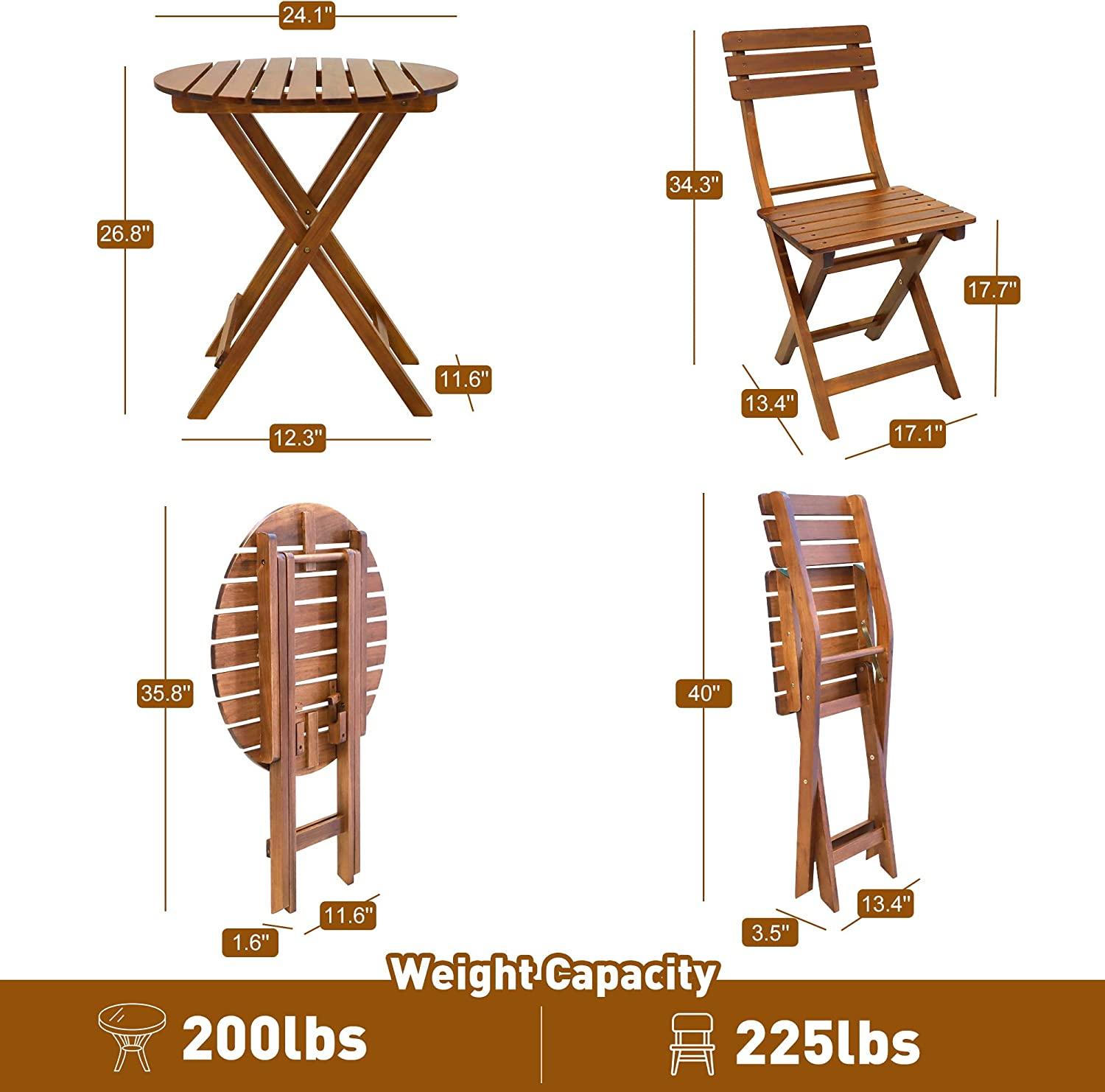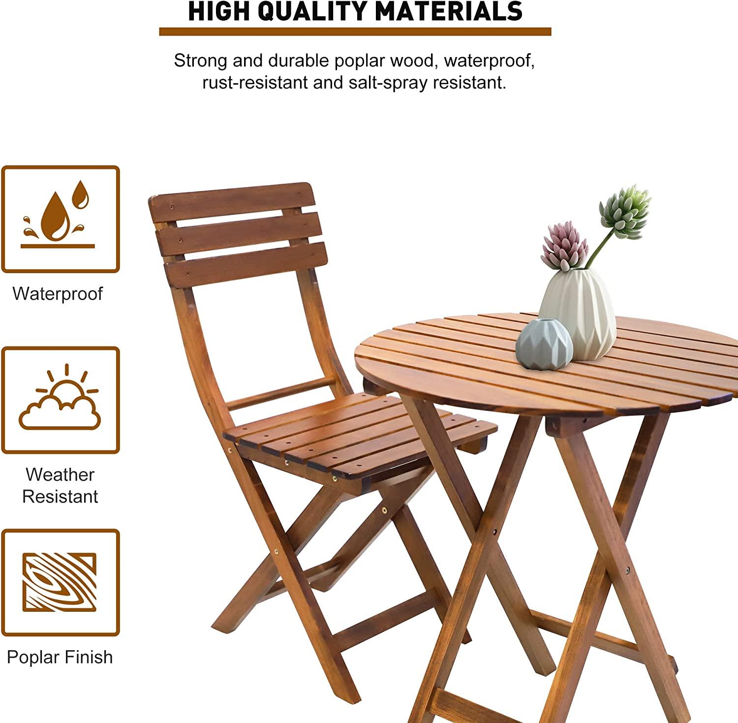 3-Piece Outdoor Wood Round Bistro Set, Patio Folding Furniture Set