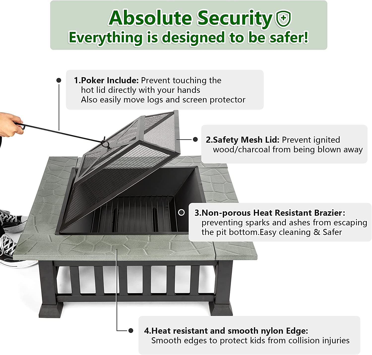 Safety Guarantees: Mesh spark screen and non-porous heat resistant brazier can prevent sparks and ashes from escaping the pit.Poker can prevent touching the hot lid directly with your hands,Also easily move logs and screen protector.