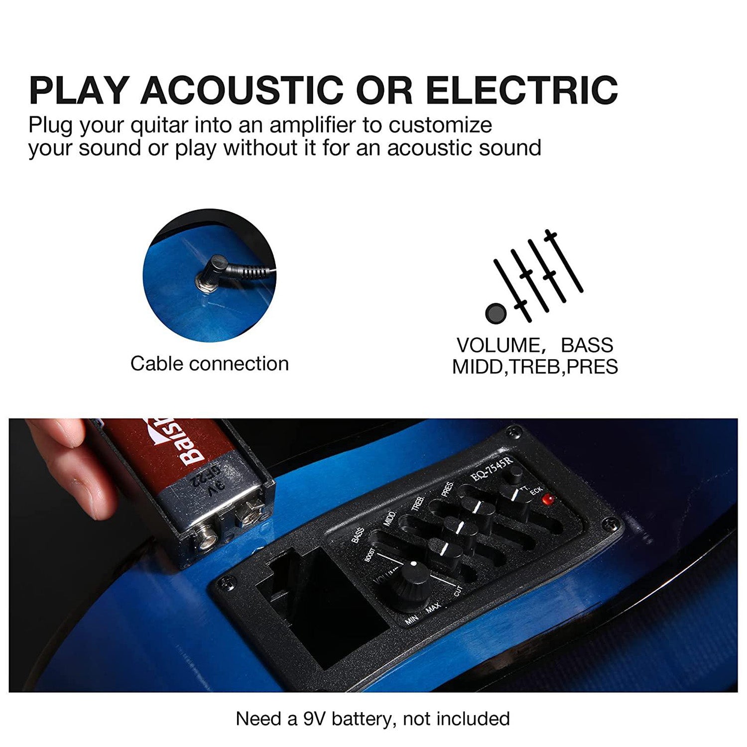 The acoustic-electric guitar features built-in 4-band EQ (Bass, Middle, Treble, and Presto) and volume control. Audio cable is included for convenient sound amplification and projection.