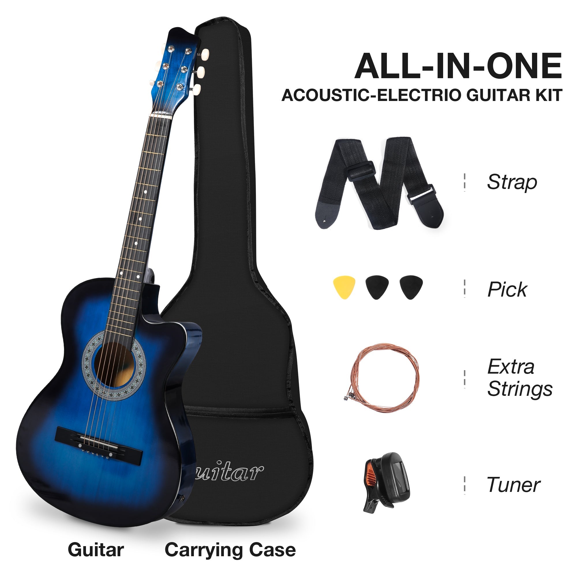 38" Acoustic Electric Guitar All wood Cutaway Beginner Guitar Package with 4-Band EQ Case, Strap, Picks, Tune