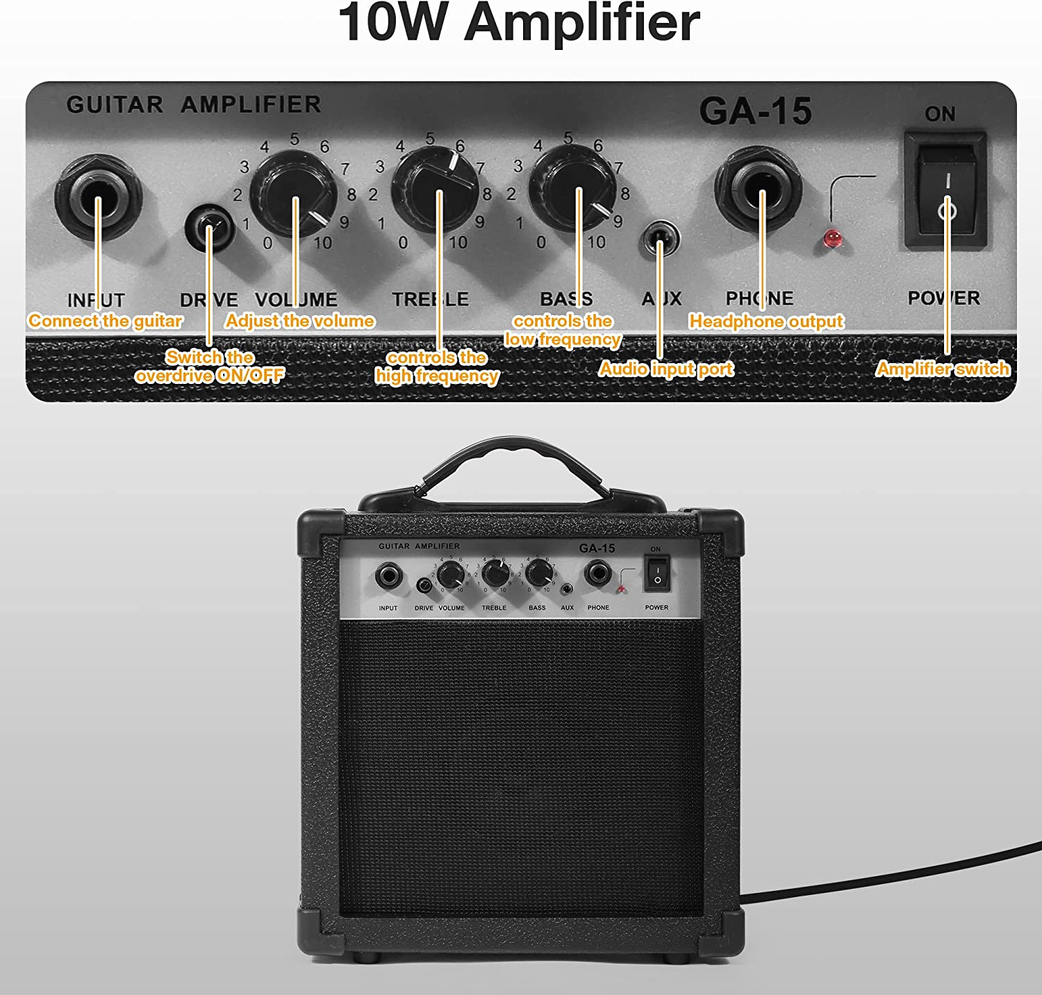 Multifunction amplifier: Guitar link on the 10W amplifier. Integrated control 2 Band EQ Volum. Bass and treble. It can also be connected to a mobile phone and headphones. Put on your favorite song, quiet practice.