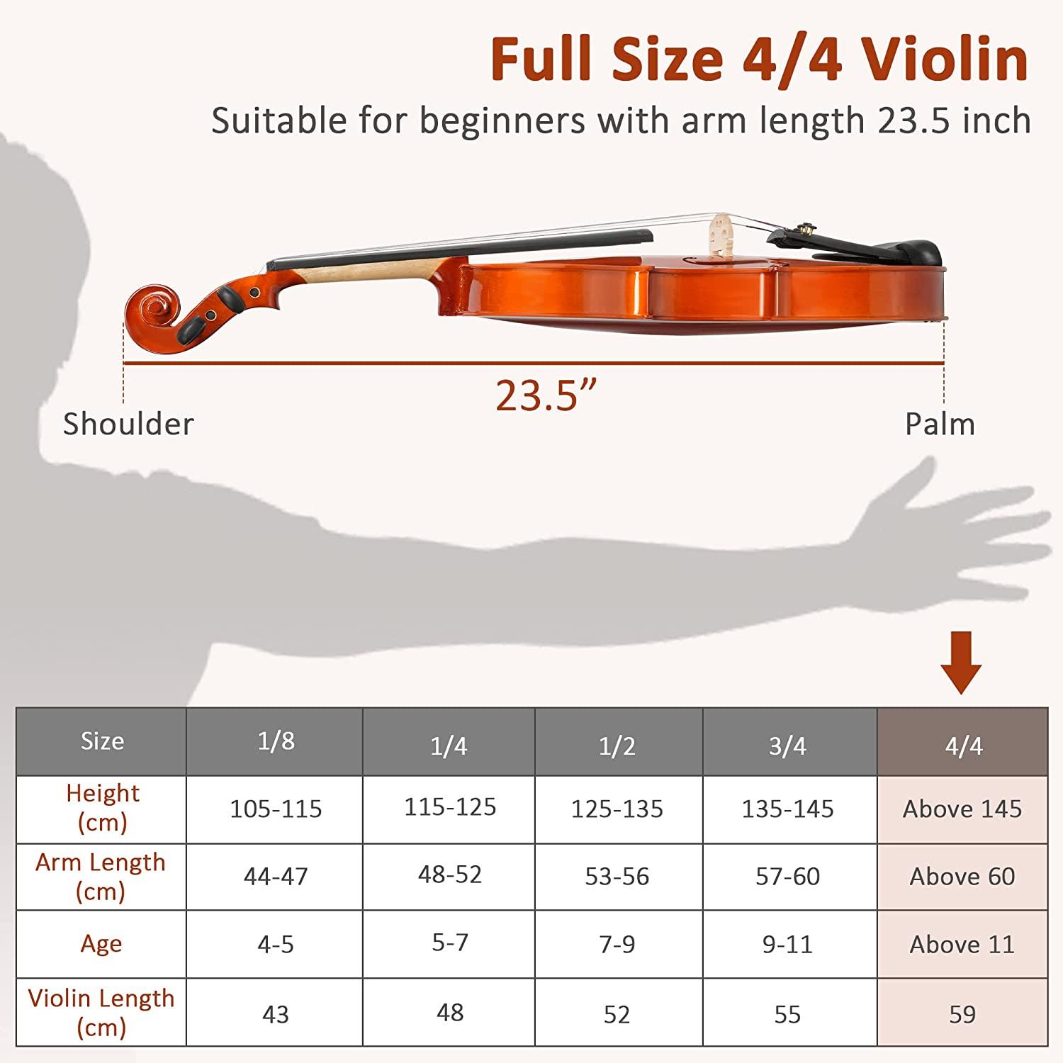 Note: To choose the correct size, please measure the length of the arm from the neck to the center of the palm, which should be slightly longer than the size you choose. Our 4/4 size suggests that the arm length should be more than 23 inches.