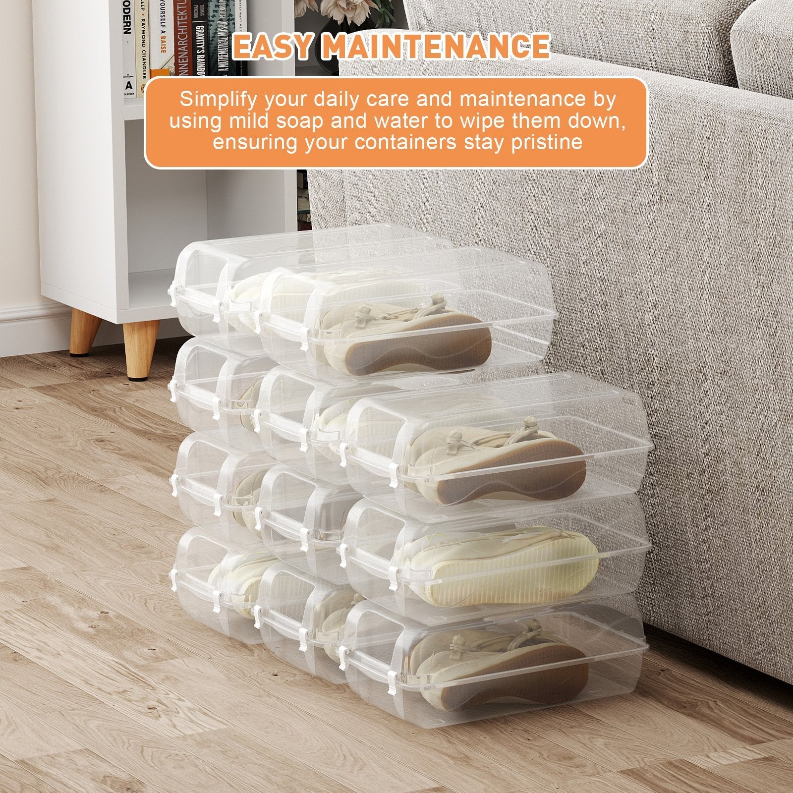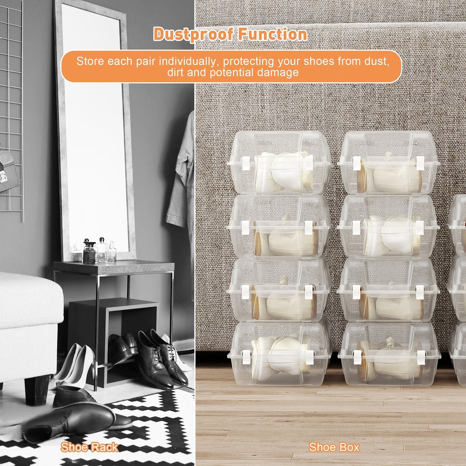 - Unlike traditional shoe racks, our shoe boxes protect your shoes from dust, dirt, and potential damage while also organizing and storing your shoes neatly and orderly.