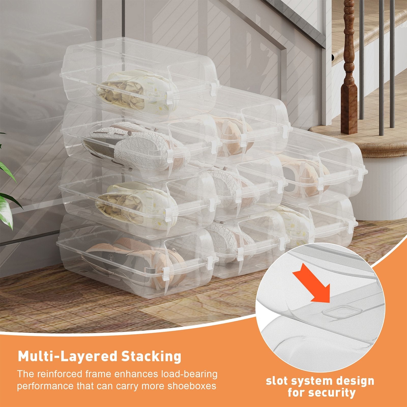 - With a specially designed slot system on both the top and bottom, these stackable shoe boxes interlock securely to prevent tipping or falling.