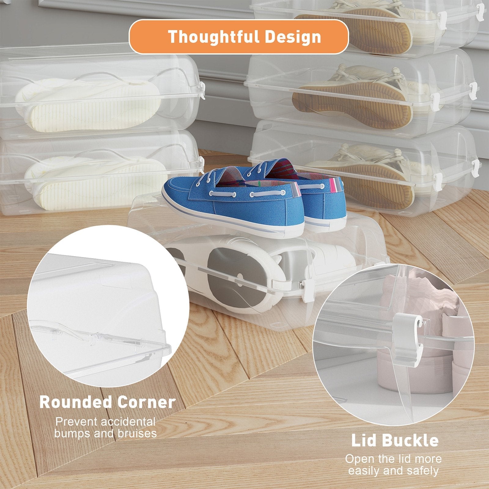- Designed with a transparent look, these clear shoe boxes allow you to quickly find the pair you want at a glance. Perfect for use in entryways, bedrooms, and closets.