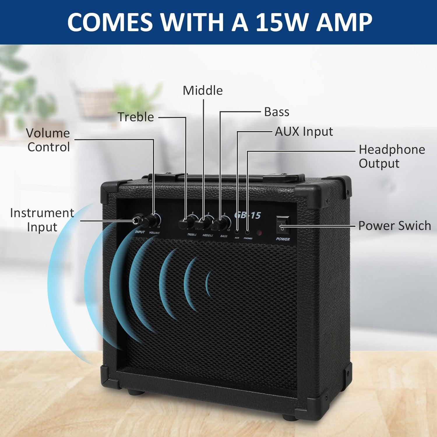 - 4-string PB-style bass guitar, 15W amplifier, cable, wrench tool and truss rod all included. All the necessary components in one package at an unbeatable price.