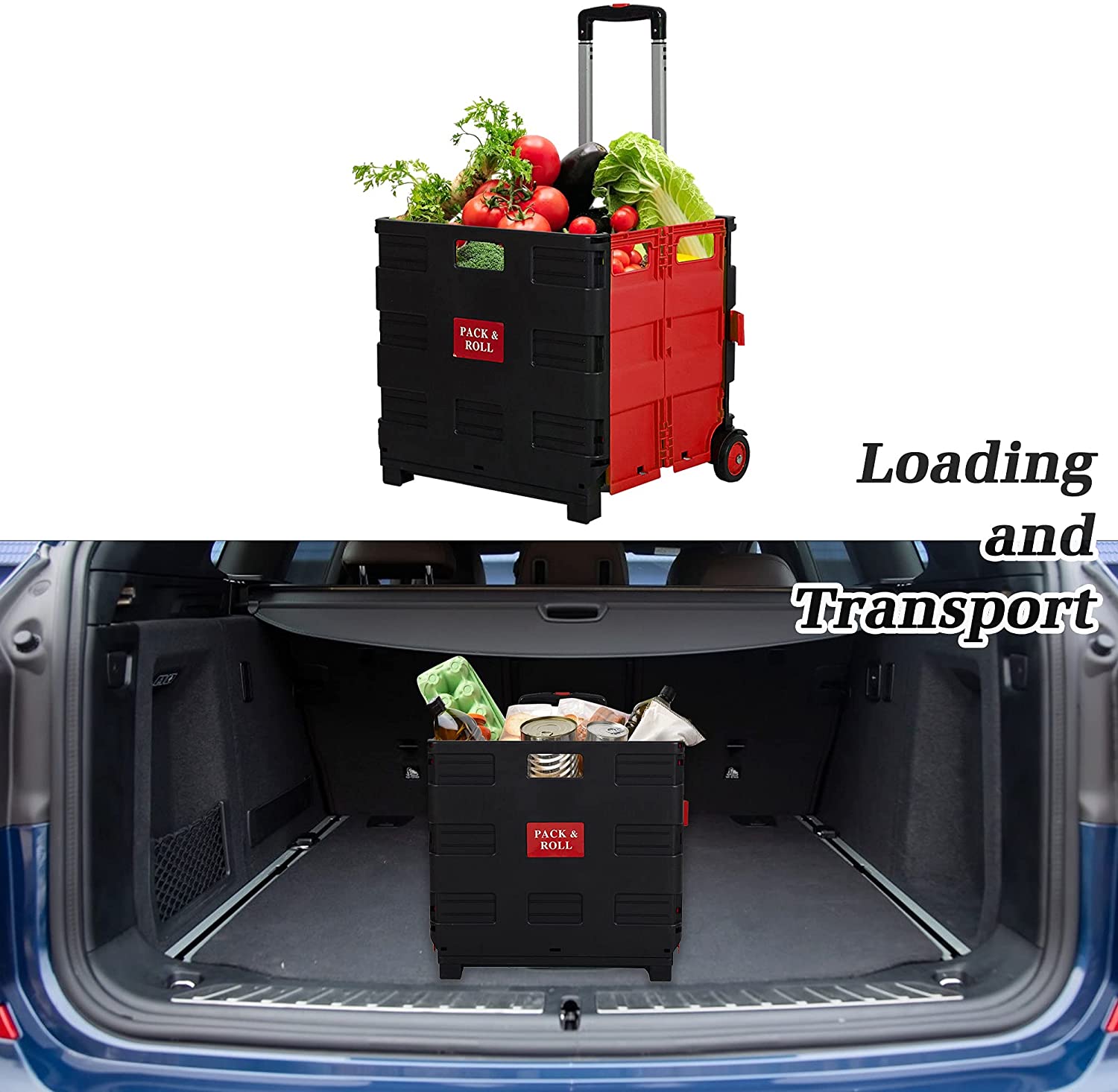 Durable Material for Great Bearing Capacity: Made of impact-resistant PP, the utility cart features better bearing capacity, environmentally friendly and lightweight; Pull handle made of aluminum, rust-proof and flexible. Makes it rugged and durable. The load-bearing capacity is 55 lbs when carrying goods