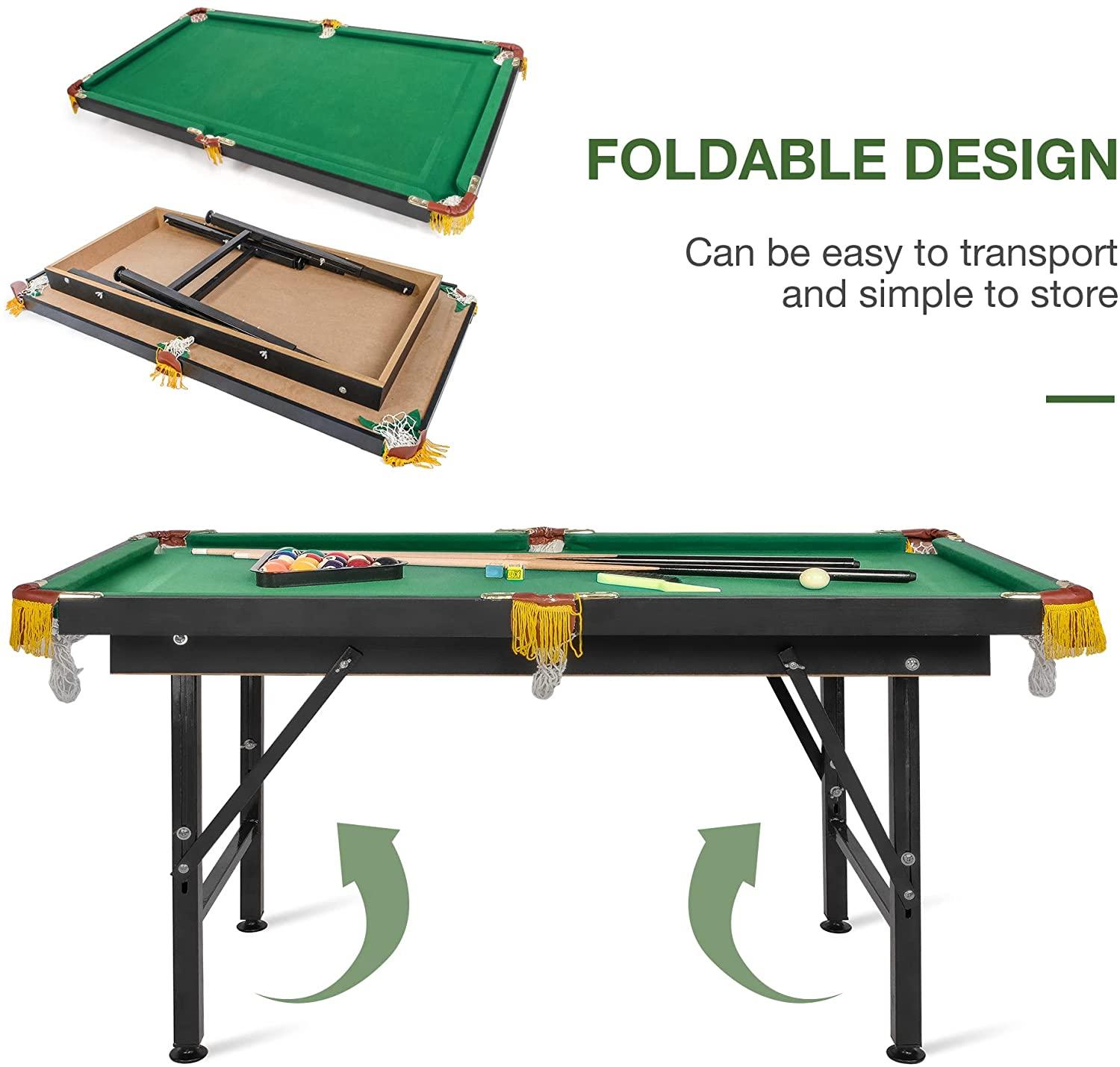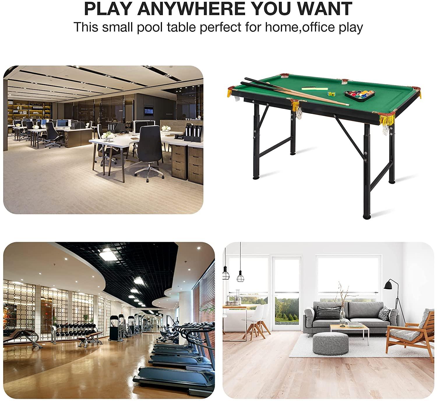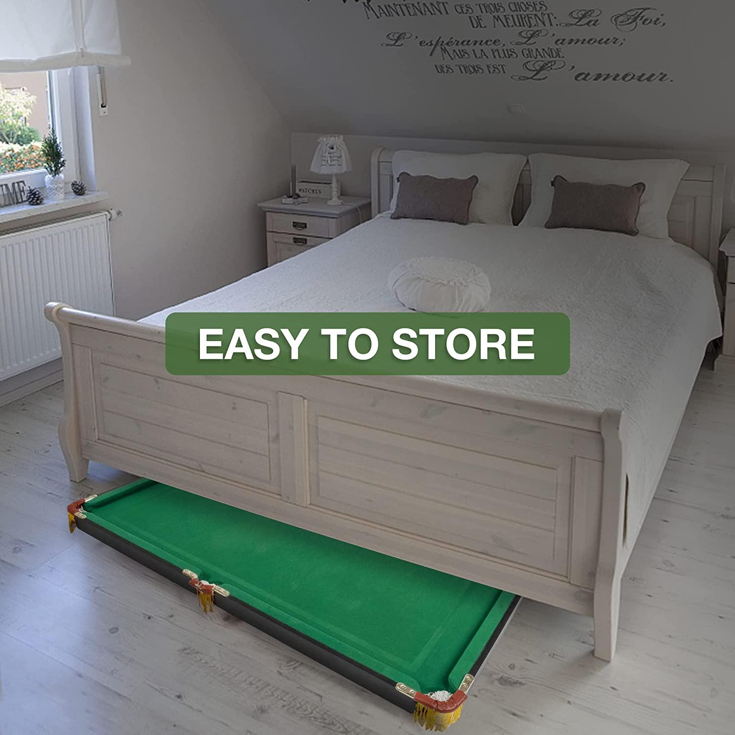 Bosonshop this sleek, professional-grade table is built for small spaces and long hauls. Its sturdy, steel legs easily fold, creating a compact shape that's easy to store. This pool table is an authentic miniature version of a pool table for smaller game rooms, definitely a must have for any child or adult who has an interest in playing or learning pool. Best gift of the season! It fits easily under the bed or in the closet. Easy to move around and get out of the way. Everything holds together perfectly, you don't even have to assemble it. Sturdy and fun to use. Recommended for both kids and adults, you could play with your kids, what a good family game!
