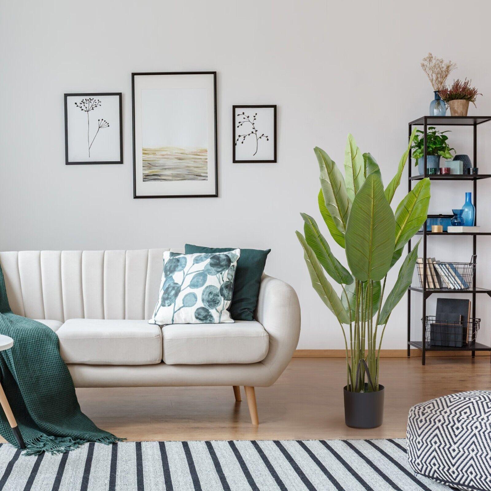The 5' Artificial Bird of Paradise Potted Plant is a beautiful and realistic artificial plant that is perfect for adding a touch of tropical flair to any home or office. The plant is made from high-quality materials and features 12 large, lush leaves that are arranged in a stunning fan shape. The plant is also potted in a stylish black ceramic pot that adds to its overall appeal.