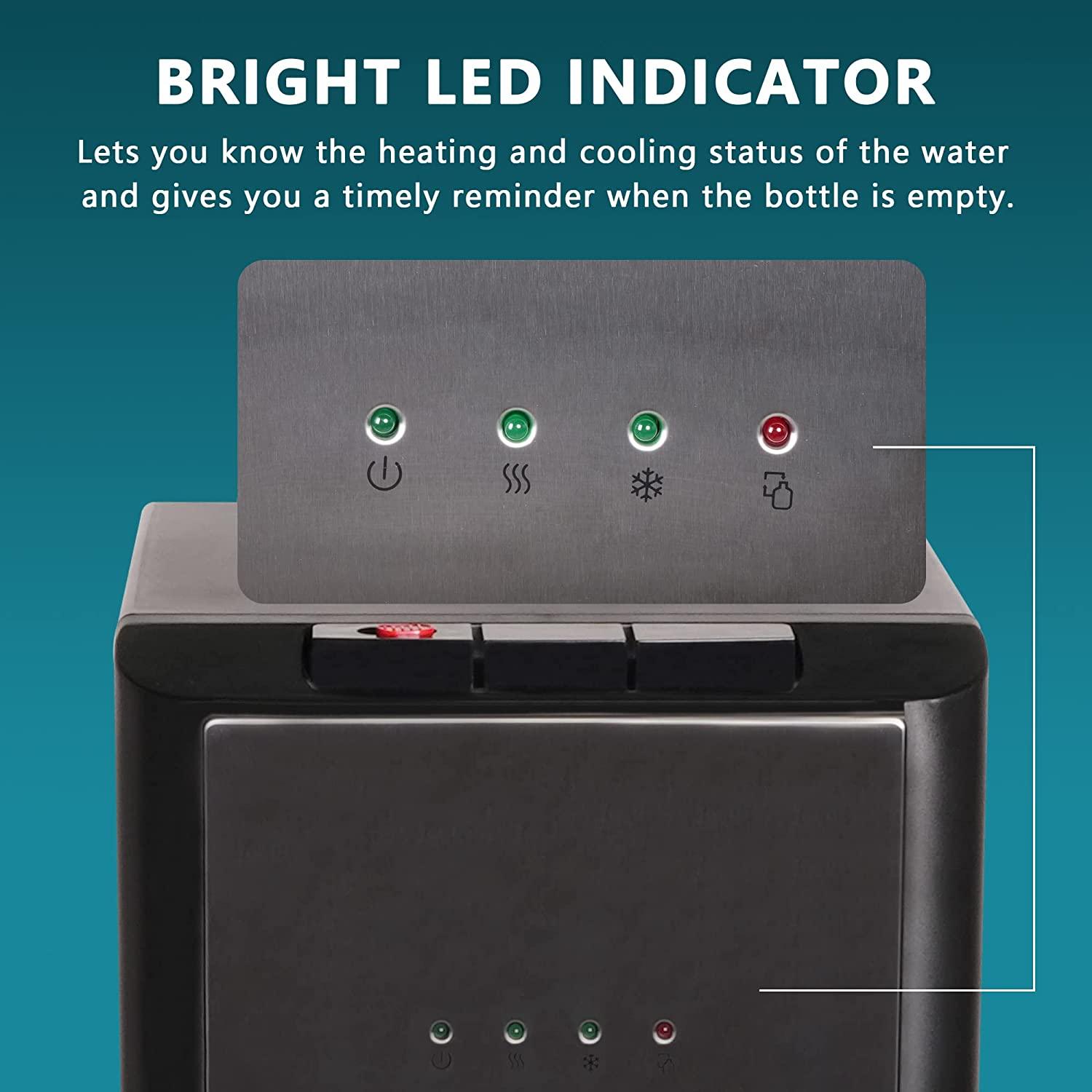 Bright Indicator Light: The intuitive indicator light lets you know exactly if it's heating or cooling. There is also an empty bottle indicator. When the bottle runs out of water, the empty bottle indicator will flash to remind you to replace it (for 5-gallon water bottles).