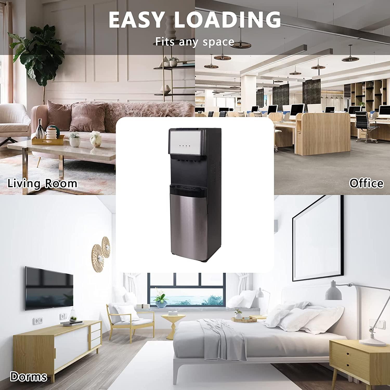 Easy to Load: The water cooler is bottom loading to eliminate the strain of lifting, reduce spills, and is suitable for 5-gallon water bottles (BOTTLE NOT INCLUDED).