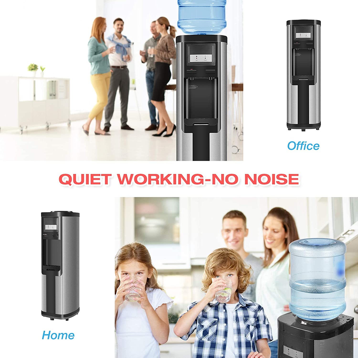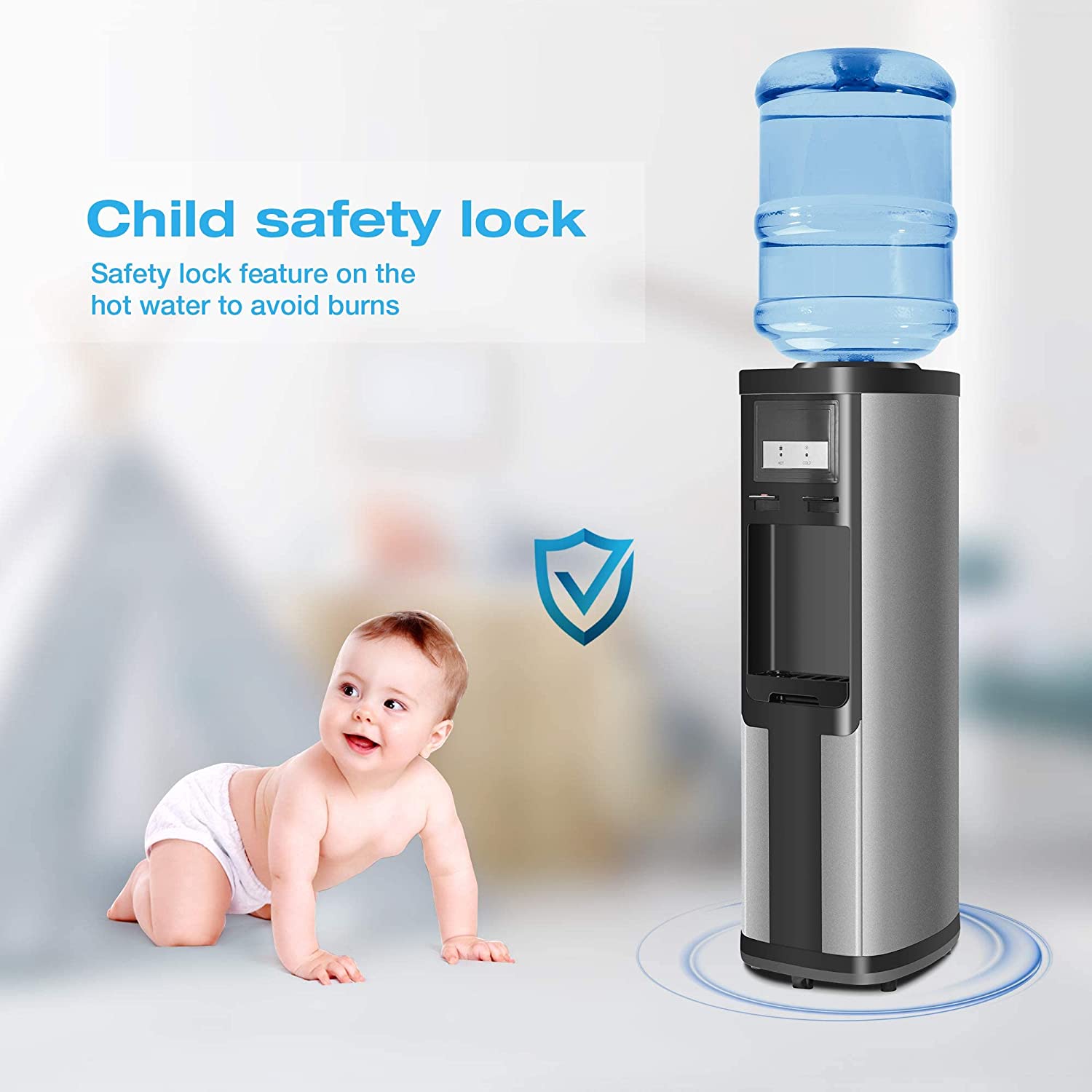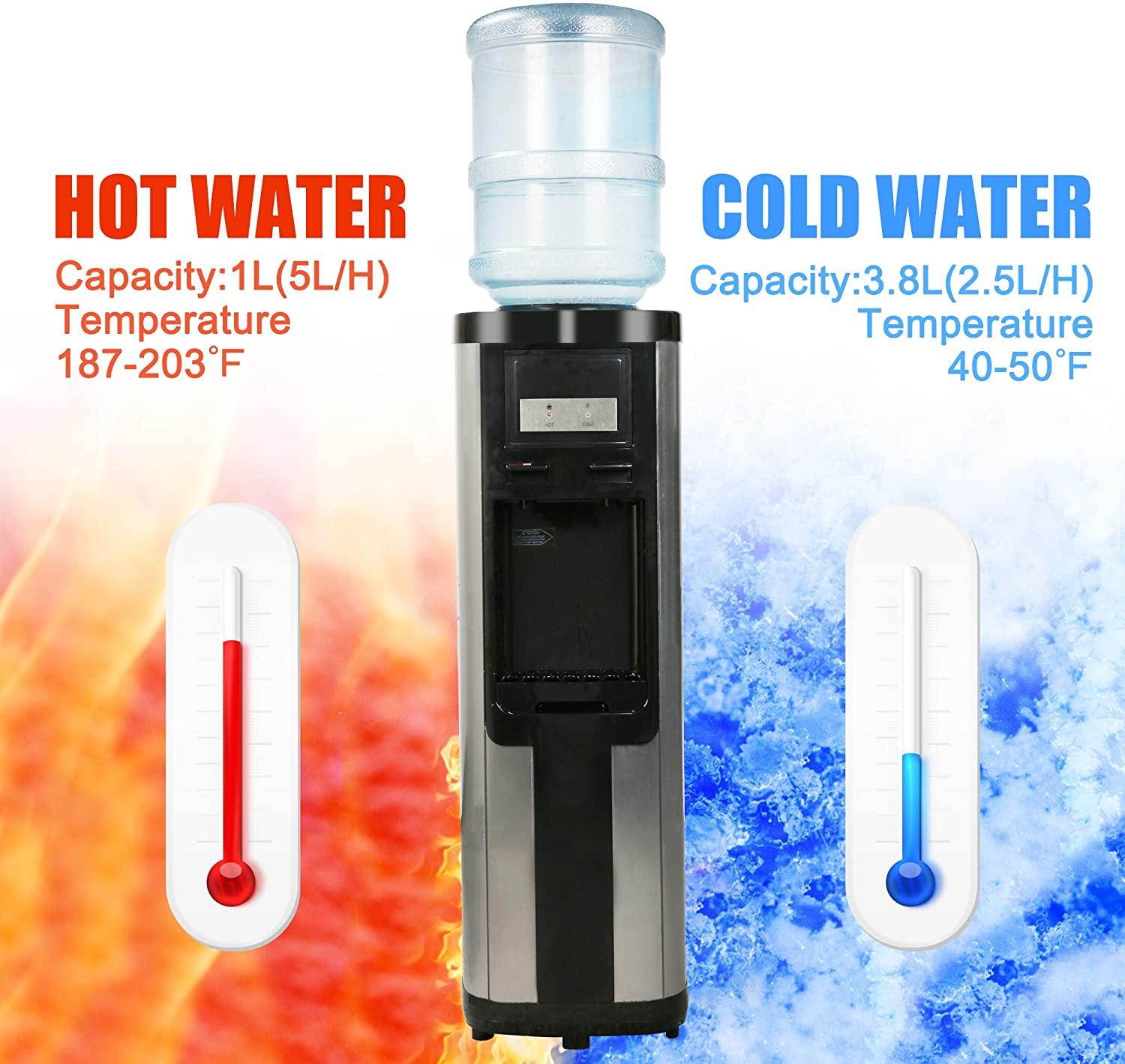 Adopt advanced compressor refrigeration technology, this freestanding Hot and Cold Water Dispenser provides you with safe and efficient cold water and hot water for making tea, coffee, cold drinks, soups and more. It is made from high-quality materials that keep it strong and sturdy. With a low noise cooler and a high efficiency design, the electric water dispenser is ideal for work, home or other places where you find a water dispenser to be convenient. The hot water child safety lock assures protection against burns and the digital screen with status indicator makes operation simple. It fits 3 to 5-gallon bottles for versatility.