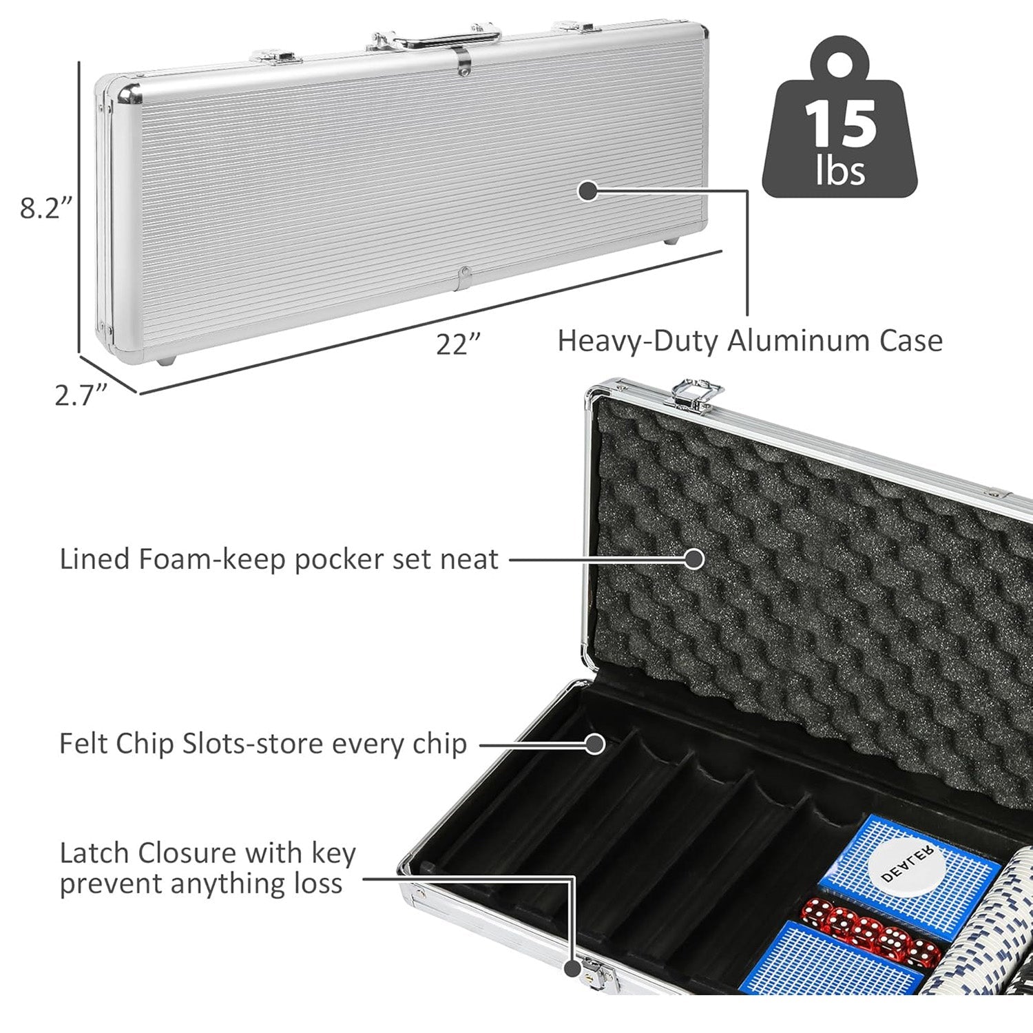 - 500 pcs poker chips, 2 decks of poker cards, 5 red clear dices, a dealer, an aluminum case with handle. Poker Chip: 1.6x1.6 in, Poker Handle Box: 22x9x3 in.