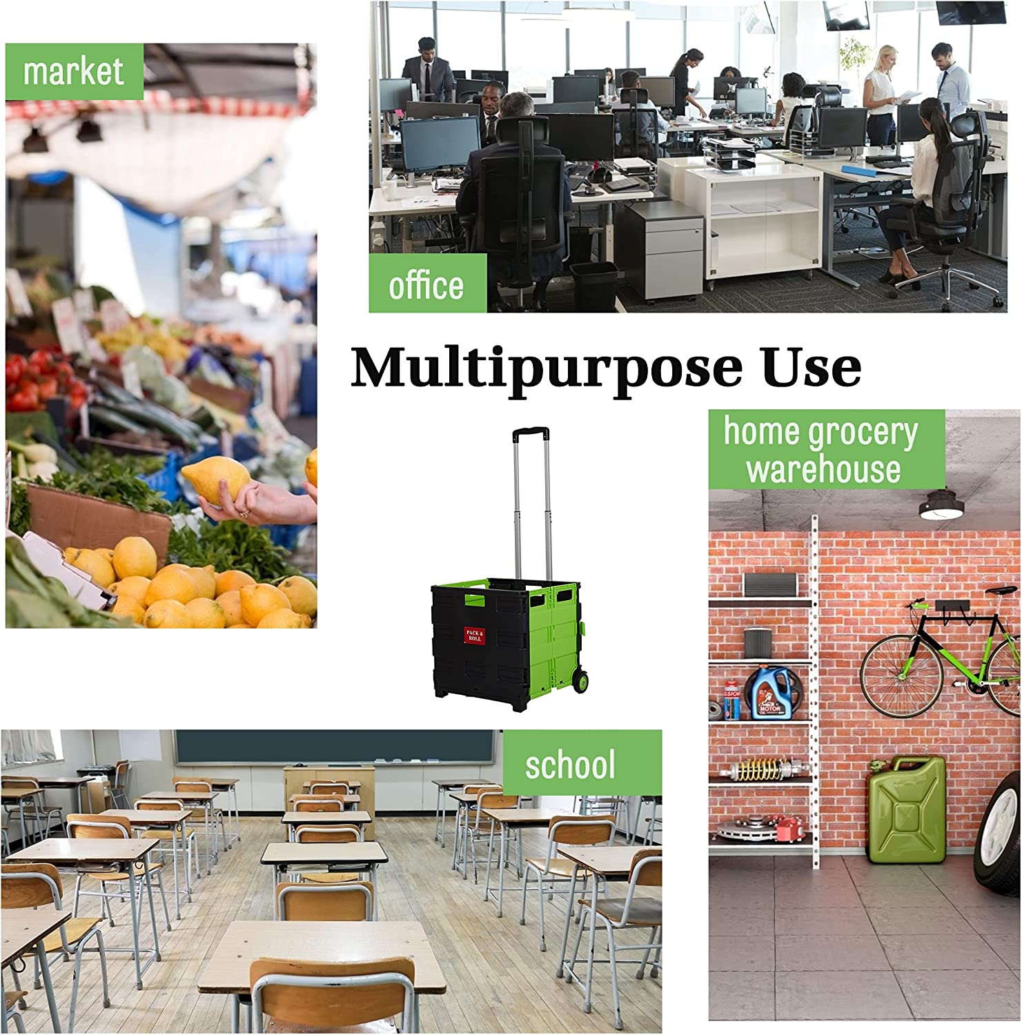 This pack and roll folding shopping and utility crate is a portable unit that folds flat into a compact case for convenient storage. Features smooth-rolling wheels for easy mobility. Use in the workplace, at the shops or for home projects. Ideal for school, grocery, fishing, tailgating, office, moving, shopping, laundry, travel or as a toolbox. Smooth-rolling wheels. Portable unit unfolds and sets up in seconds. Telescopic, aluminum handle with a contoured plastic grip for comfort.