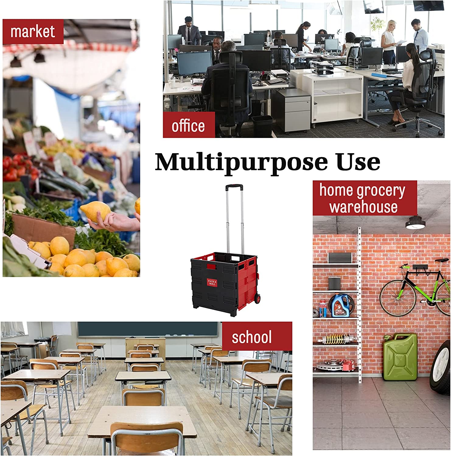 This pack and roll folding shopping and utility crate is a portable unit that folds flat into a compact case for convenient storage. Features smooth-rolling wheels for easy mobility. Use in the workplace, at the shops or for home projects. Ideal for school, grocery, fishing, tailgating, office, moving, shopping, laundry, travel or as a toolbox. Smooth-rolling wheels. Portable unit unfolds and sets up in seconds. Telescopic, aluminum handle with a contoured plastic grip for comfort.