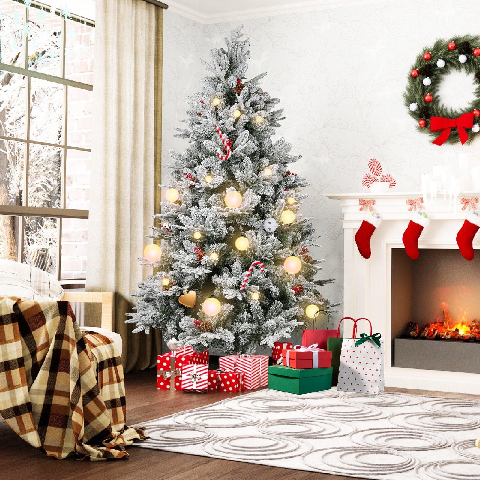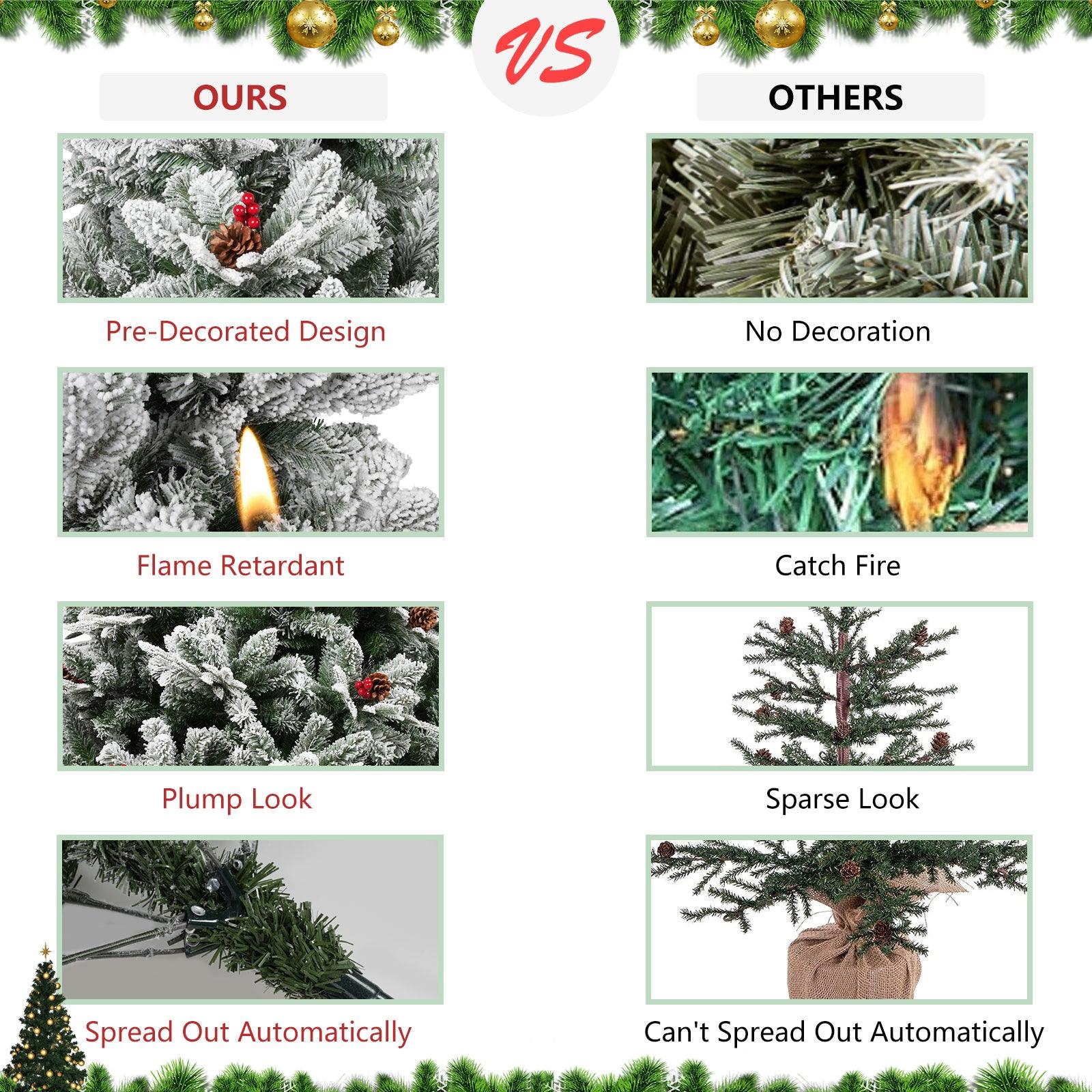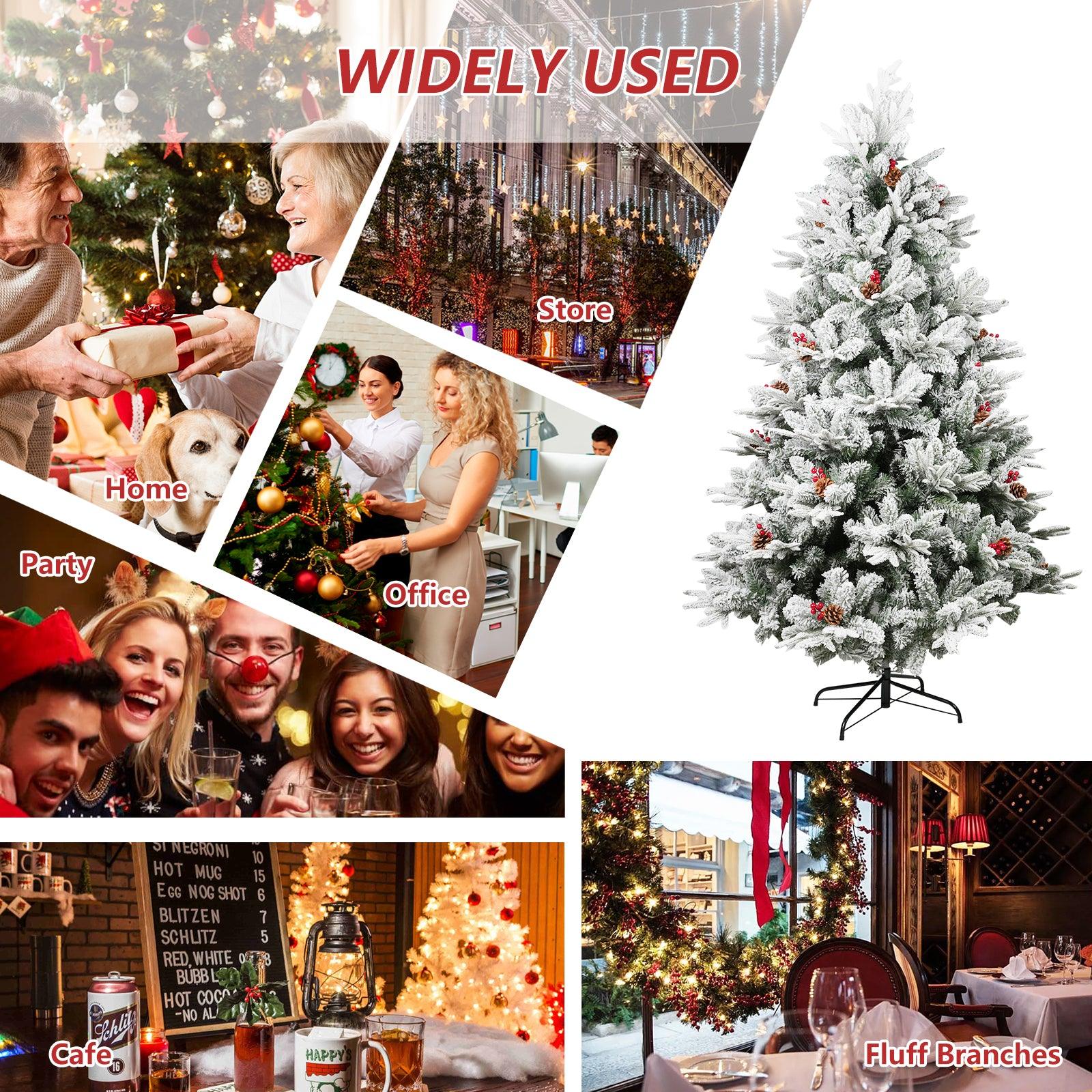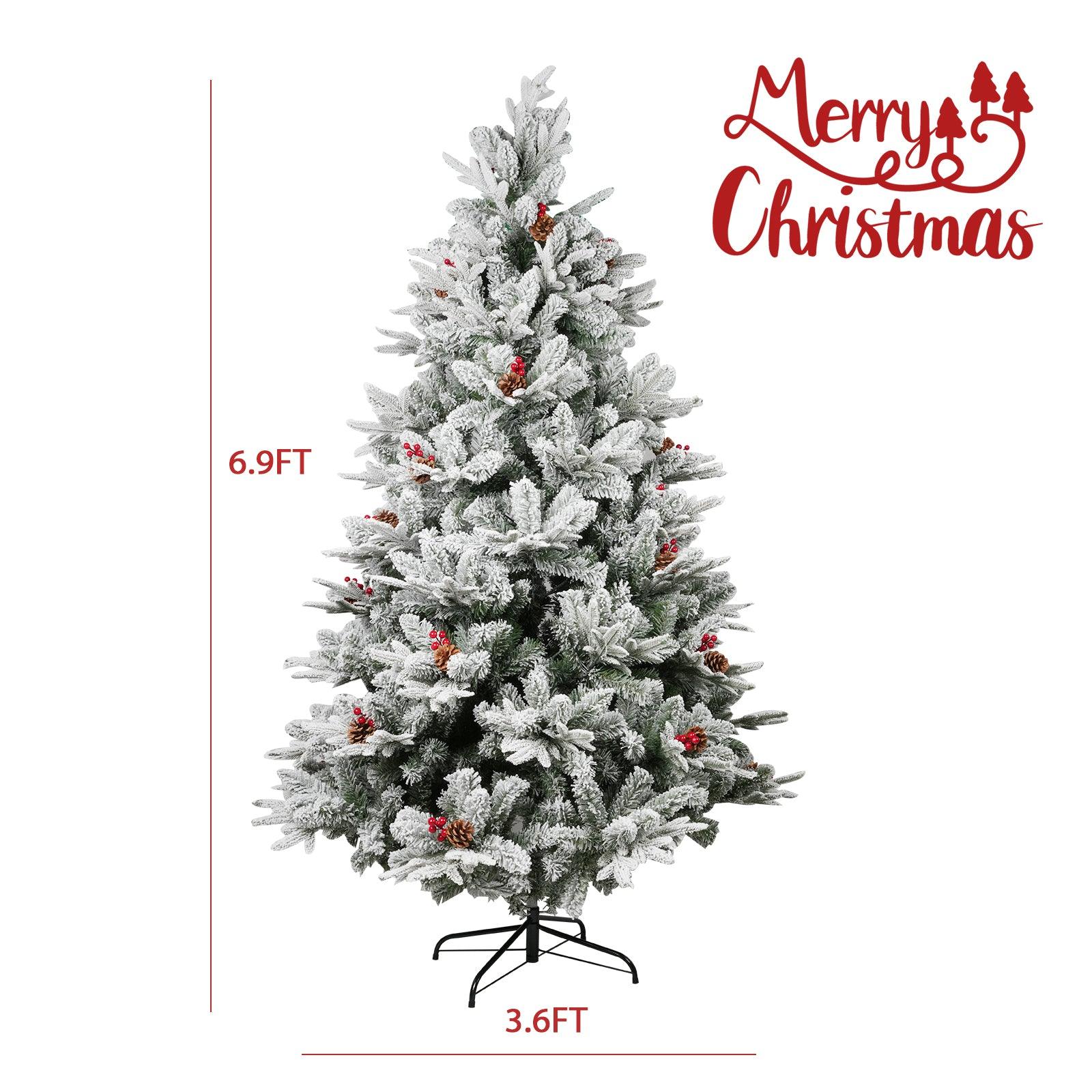 6.9' Artificial Christmas Tree Snow Flocked Xmas Tree with Pine Cones and Red Berries 1150 Branch Tips