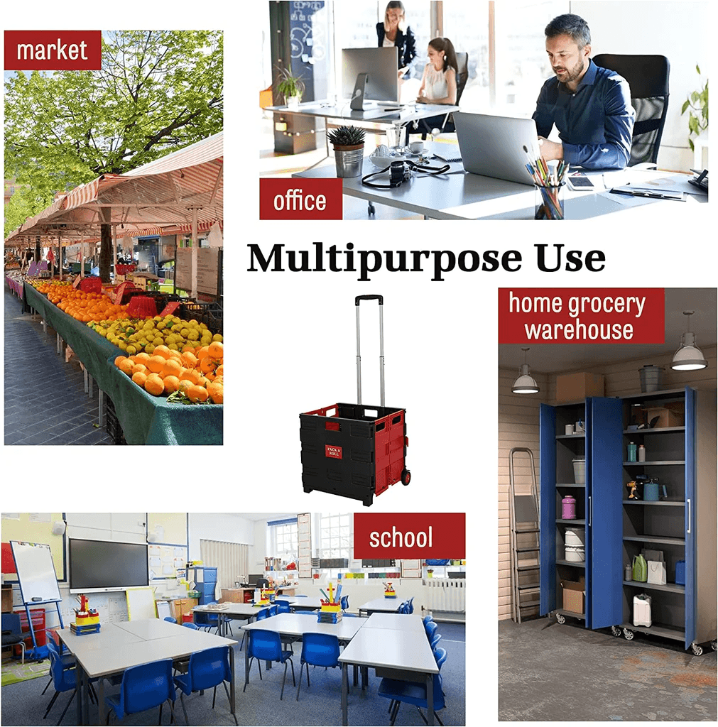This pack and roll folding shopping and utility crate is a portable unit that folds flat into a compact case for convenient storage. Features smooth-rolling wheels for easy mobility. Use in the workplace, at the shops or for home projects. Ideal for school, grocery, fishing, tailgating, office, moving, shopping, laundry, travel or as a toolbox. Smooth-rolling wheels. Portable unit unfolds and sets up in seconds. Telescopic, aluminum handle with a contoured plastic grip for comfort.