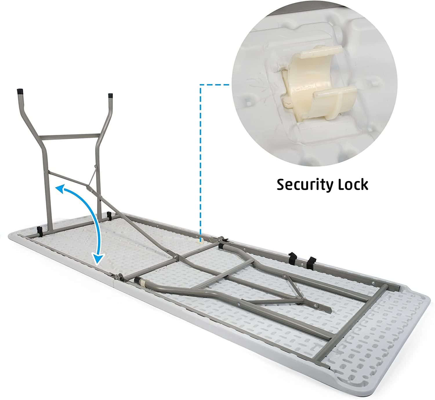 - Sturdy Construction Design: The folding table has powder coated steel legs, joint locks for the camping table frame, and non-slip rubber feet that help keep the plastic table in place during every activity. The table is sturdily constructed and UV resistant as well.