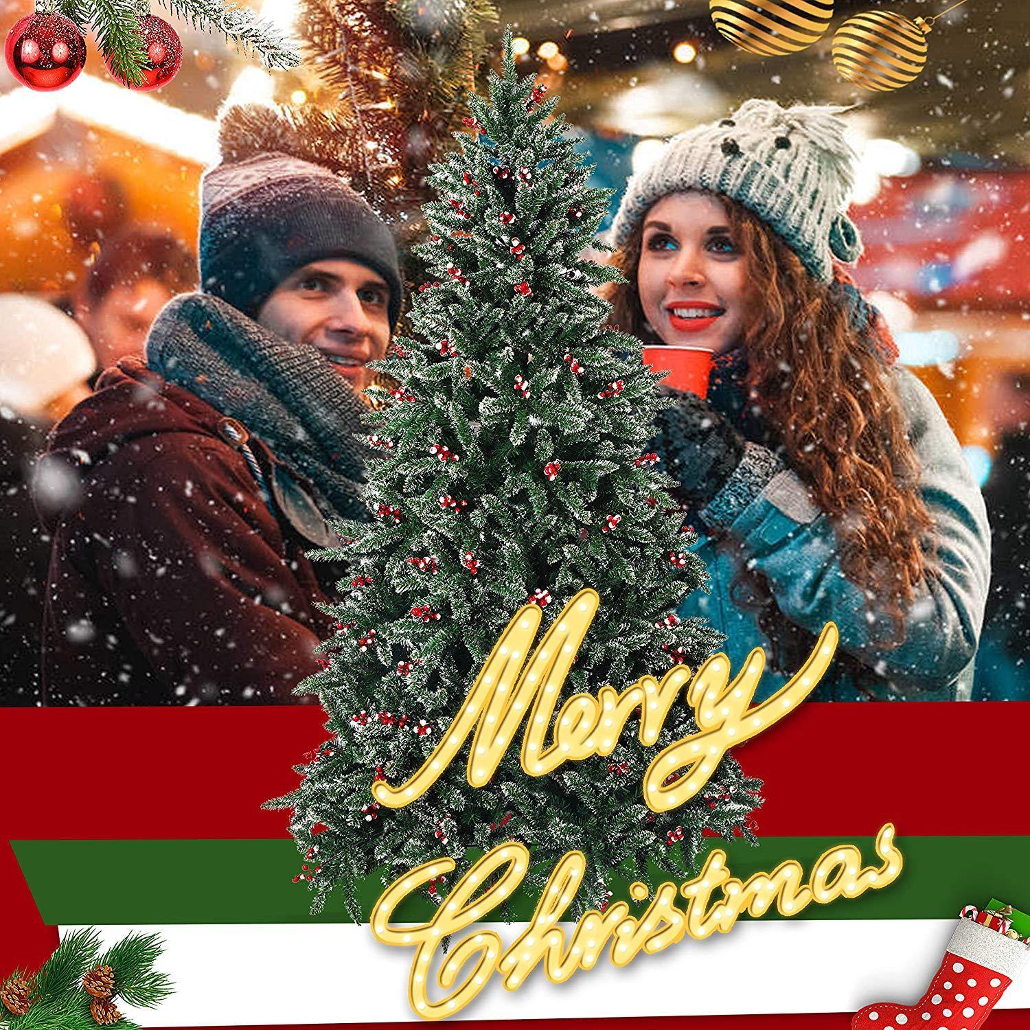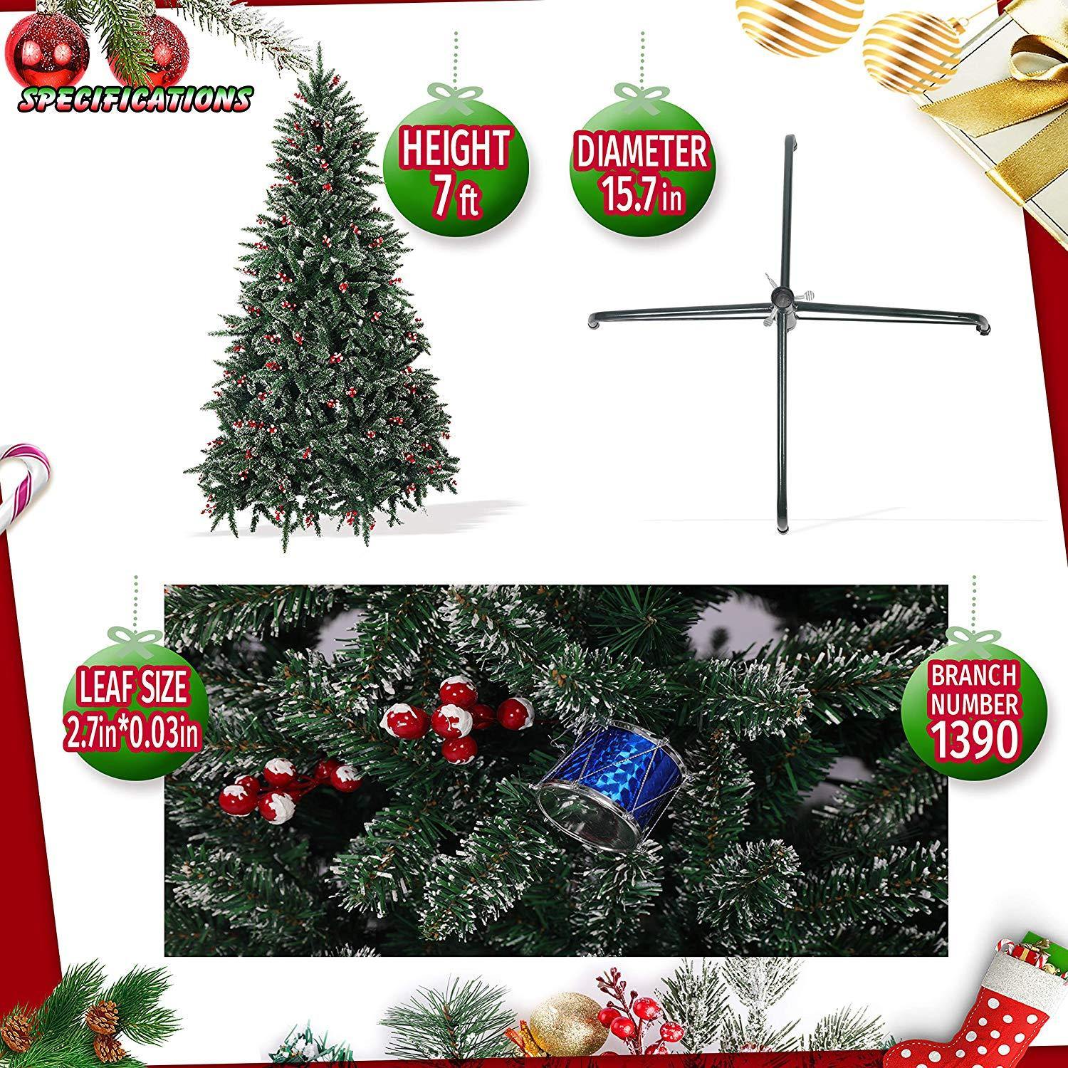 7' Artificial Christmas Tree Snow Flocked 1390 Tips Pine Decoration with Red Cheery