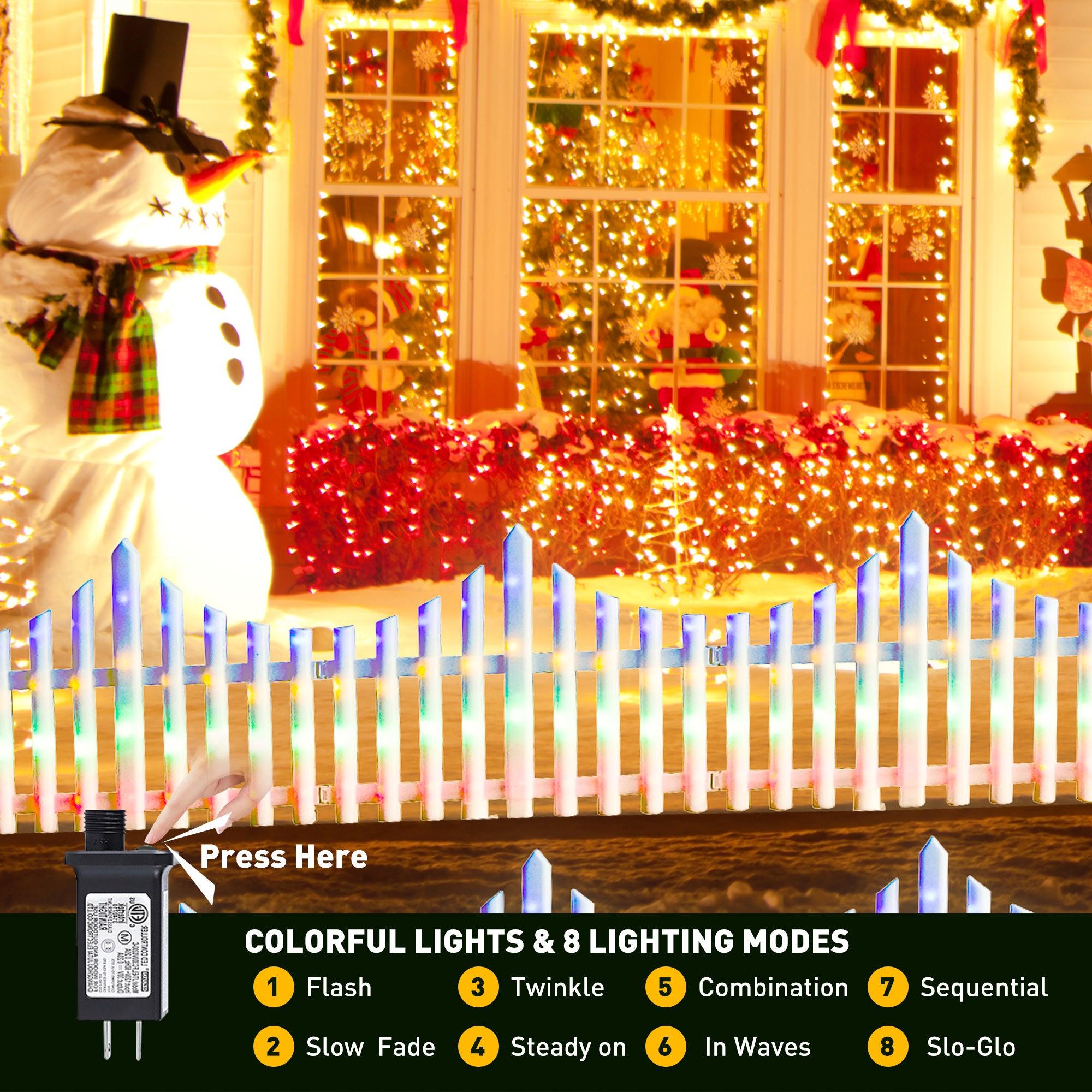 8 PCS Lighted Garden Picket Fence with 8 Inserts & Base - Plug-in LED Lights for Lawn, Patio, Path, Landscape, and Christmas Tree Decoration